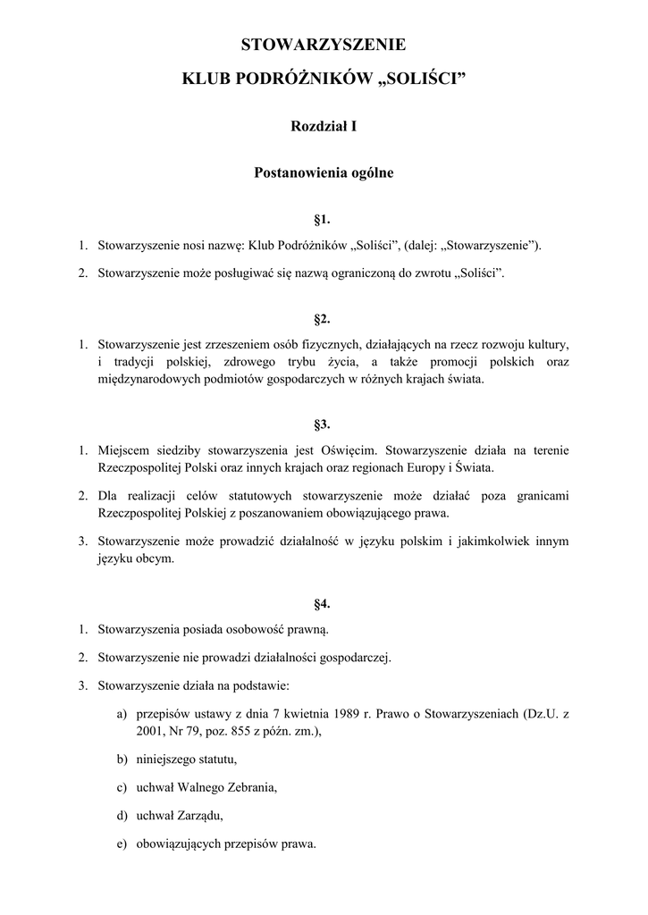 STOWARZYSZENIE KLUB PODRÓŻNIKÓW „SOLIŚCI” Rozdział I Postanowienia ogólne §1. 1. Stowarzyszenie nosi nazwę: Klub Podróżników „Soliści”, (dalej: „Stowarzyszenie”). 2. Stowarzyszenie może posługiwać się nazwą ograniczoną do zwrotu „Soliści”. §2. 1. Stowarzyszenie jest zrzeszeniem osób fizycznych, działających na rzecz rozwoju kultury, i tradycji polskiej, zdrowego trybu życia, a także promocji polskich oraz międzynarodowych podmiotów gospodarczych w różnych krajach świata. §3. 1. Miejscem siedziby stowarzyszenia jest Oświęcim. Stowarzyszenie działa na terenie Rzeczpospolitej Polski oraz innych krajach oraz regionach Europy i Świata. 2. Dla realizacji celów statutowych stowarzyszenie może działać poza granicami Rzeczpospolitej Polskiej z poszanowaniem obowiązującego prawa. 3. Stowarzyszenie może prowadzić działalność w języku polskim i jakimkolwiek innym języku obcym. §4. 1. Stowarzyszenia posiada osobowość prawną. 2. Stowarzyszenie nie prowadzi działalności gospodarczej. 3. Stowarzyszenie działa na podstawie: a) przepisów ustawy z dnia 7 kwietnia 1989 r. Prawo o Stowarzyszeniach (Dz.U. z 2001, Nr 79, poz. 855 z późn. zm.), b) niniejszego statutu, c) uchwał Walnego Zebrania, d) uchwał Zarządu, e) obowiązujących przepisów prawa. §5. 1. Stowarzyszenie może należeć do innych krajowych i międzynarodowych organizacji o podobnych celach. 2. Stowarzyszenie może używać wyróżniającego znaku graficznego (logo), odznak, pieczęci i druków firmowych na zasadach określonych w przepisach szczególnych. §6. 1. Działalność Stowarzyszenia oparta jest przede wszystkim na pracy społecznej członków. Do prowadzenia swych spraw stowarzyszenie może zatrudniać pracowników, w tym także swoich członków. §7. 1. Stowarzyszenie jest zawiązane na czas nieokreślony. ROZDZIAŁ II CELE I SPOSOBY DZIAŁANIA §8. 1. Celami Stowarzyszenia są: a) Zrzeszanie osób zajmujących się działalnością podróżniczą i pokrewną. b) Zachowanie i propagowanie polskiej kultury w Rzeczypospolitej Polskiej oraz w innych krajach świata. c) Działalność na rzecz integracji europejskiej oraz rozwijania kontaktów i współpracy społeczności polskiej ze społecznościami innych państw. d) Działalność wspomagająca lokalny rozwój gospodarczy, w tym przede wszystkim rozwój przedsiębiorczości. e) Działania na rzecz osób niepełnosprawnych. f) Promocja zdrowia w tym propagowanie zdrowego trybu życia. g) Promocja różnych form aktywności fizycznej. h) Propagowanie wiedzy historycznej, w tym świadomości historycznej członków Stowarzyszenia i uczestników wypraw. i) Propagowanie ochrony środowiska naturalnego. j) Działalność związana z podróżowaniem, wspieraniem i organizacją inicjatyw podróżniczych oraz promocją alternatywnych form podróżowania, k) Organizacja wyjazdów podróżniczych dla członków Stowarzyszenia §9. 1. Stowarzyszenie realizuje swoje cele m.in. poprzez: a) Prowadzenie działalności reklamowej polskich i zagranicznych przedsiębiorców w czasie wypraw krajowych i międzynarodowych. b) Promocja dóbr materialnych i intelektualnych reklamowanych przedsiębiorców. c) Współpraca z mediami lokalnymi i krajowymi w celu realizacji przebiegu podróży oraz dostarczania materiałów zdjęciowych i filmowych. d) Profesjonalne opracowywanie materiału filmowego i fotograficznego z wypraw oraz uwzględnienie wizerunku lokalnych i polskich przedsiębiorców w Rzeczypospolitej Polskiej, a także poza jej granicami. e) Organizowanie wycieczek, wypraw, skoków spadochronowych, wspinaczek oraz wszelkich form aktywnego spędzania wolnego czasu. f) Działania związane z ochroną środowiska naturalnego, g) Współpraca z osobami fizycznymi i prawnymi oraz jednostkami organizacyjnymi nieposiadającymi osobowości prawnej. h) Pozyskiwanie funduszy na cele statutowe. i) Poznawanie i propagowanie miejsc historycznie istotnych dla rozwoju Polski, Europy oraz Świata. j) Doradztwo i pomoc organizacyjno – ekonomiczna, k) Prowadzenie oraz udział w programach badawczych i rozwojowych w zakresie podróżowania, l) Organizacja spotkań mających na celu propagowanie idei podróżowania alternatywnego, m) Wpływanie na opinię publiczną poprzez zajmowanie stanowiska w sprawach dotyczących podróżowania, n) Działalność wydawnicza, edukacyjna, szkoleniowa. ROZDZIAŁ III CZŁONKOWIE, ICH PRAWA I OBOWIĄZKI §10. 1. Członkami Stowarzyszenia mogą być osoby fizyczne i prawne. 2. Osoba prawna może być jedynie członkiem wspierającym Stowarzyszenia. 3. Członkiem Stowarzyszenia, może być również cudzoziemiec. Cudzoziemiec może zostać Członkiem Zwyczajnym Stowarzyszenia na takich samych zasadach, jak obywatel Rzeczypospolitej Polskiej. 4. Członkami Stowarzyszenia mogą być cudzoziemcy nieposiadający miejsca zamieszkania w Rzeczpospolitej Polskiej. §11. 1. Stowarzyszenie posiada członków: a) Zwyczajnych, b) Nadzwyczajny, c) Wspierających, d) Honorowych. §12. 1. Członkiem Zwyczajnym Stowarzyszenia może być każda osoba fizyczna, która wyrazi chęć stania się członkiem Stowarzyszenia w formie oświadczenia pisemnego przesłanego na adres siedziby Stowarzyszenia lub przesłanego pocztą elektroniczną na adres [email protected], w którym to: a) wystarczająco wyraźnie wyrazi wolę stania się Członkiem Zwyczajnym, b) oświadczy, że zapoznał się z treścią niniejszego statutu oraz popiera cele i sposoby działania określone w Rozdziale 2, c) wskaże adres poczty elektronicznej właściwy do korespondencji, oraz uzyska akceptację Zarządu w formie uchwały. 2. Osoba, o której mowa powyżej, staje się członkiem Stowarzyszenia, z chwilą podjęcia uchwały przez Zarząd. 3. Zarząd może odmówić osobie zostania członkiem Stowarzyszenia bez podania przyczyny. §13. 1. Członkiem Nadzwyczajnym Stowarzyszenia może być każda osoba, która wyrazi chęć zostania Członkiem Stow