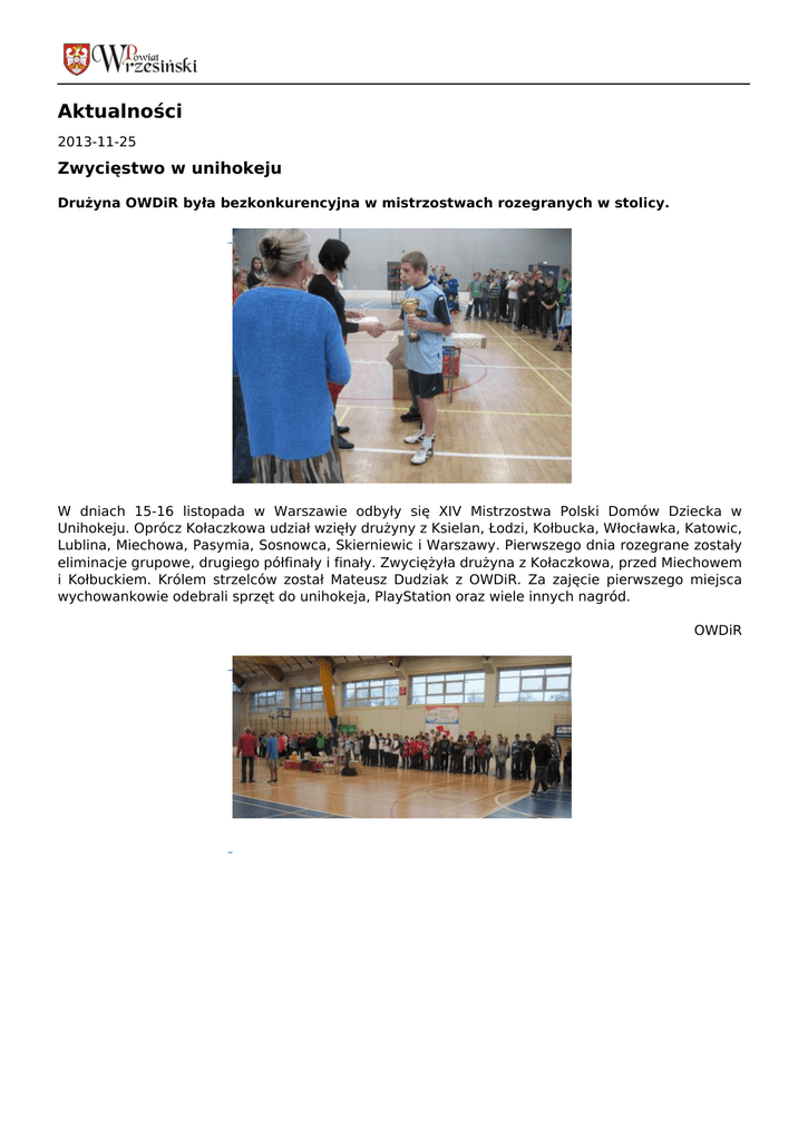 Aktualności 2013-11-25 Zwycięstwo w unihokeju Drużyna OWDiR była bezkonkurencyjna w mistrzostwach rozegranych w stolicy. W dniach 15-16 listopada w Warszawie odbyły się XIV Mistrzostwa Polski Domów Dziecka w Unihokeju. Oprócz Kołaczkowa udział wzięły drużyny z Ksielan, Łodzi, Kołbucka, Włocławka, Katowic, Lublina, Miechowa, Pasymia, Sosnowca, Skierniewic i Warszawy. Pierwszego dnia rozegrane zostały eliminacje grupowe, drugiego półfinały i finały. Zwyciężyła drużyna z Kołaczkowa, przed Miechowem i Kołbuckiem. Królem strzelców został Mateusz Dudziak z OWDiR. Za zajęcie pierwszego miejsca wychowankowie odebrali sprzęt do unihokeja, PlayStation oraz wiele innych nagród. OWDiR