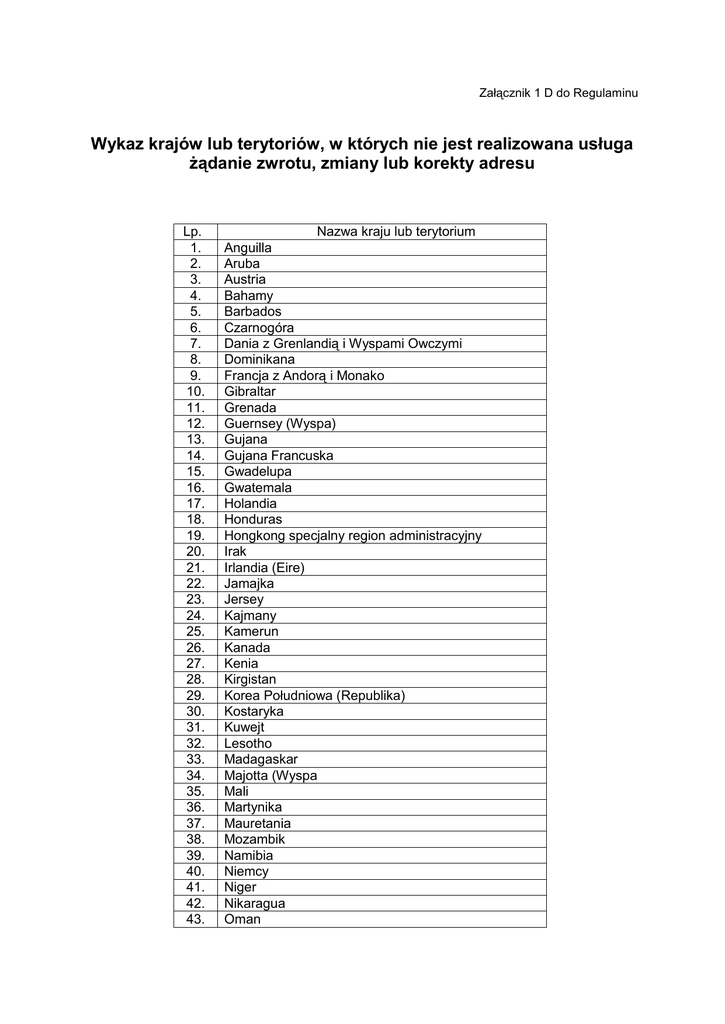 Załącznik 1 D do Regulaminu Wykaz krajów lub terytoriów, w których nie jest realizowana usługa żądanie zwrotu, zmiany lub korekty adresu Lp. 1. 2. 3. 4. 5. 6. 7. 8. 9. 10. 11. 12. 13. 14. 15. 16. 17. 18. 19. 20. 21. 22. 23. 24. 25. 26. 27. 28. 29. 30. 31. 32. 33. 34. 35. 36. 37. 38. 39. 40. 41. 42. 43. Nazwa kraju lub terytorium Anguilla Aruba Austria Bahamy Barbados Czarnogóra Dania z Grenlandią i Wyspami Owczymi Dominikana Francja z Andorą i Monako Gibraltar Grenada Guernsey (Wyspa) Gujana Gujana Francuska Gwadelupa Gwatemala Holandia Honduras Hongkong specjalny region administracyjny Irak Irlandia (Eire) Jamajka Jersey Kajmany Kamerun Kanada Kenia Kirgistan Korea Południowa (Republika) Kostaryka Kuwejt Lesotho Madagaskar Majotta (Wyspa Mali Martynika Mauretania Mozambik Namibia Niemcy Niger Nikaragua Oman Lp. 44. 45. 46. 47. 48. 49. 50. 51. 52. 53. 54. 55. 56. 57. 58. 59. 60. 61. 62. 63. Nazwa kraju lub terytorium Paragwaj Reunion Salomona Wyspy Salwador Serbia Seszele Singapur Stany Zjednoczone Ameryki (USA) Suazi (Swaziland) Sudan Surinam Szwajcaria z Liechtensteinem Szwecja Świętego Piotra i Miquelona Wyspa Świętej Łucji Wyspa Trynidad i Tobago Uganda Vanuatu Wielka Brytania i Irlandia Północna oraz Wyspa Man Wietnam -2-