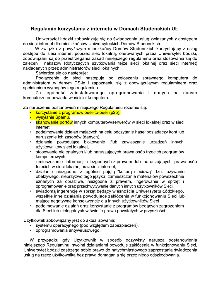 Regulamin korzystania z internetu w Domach Studenckich UŁ Uniwersytet Łódzki zobowiązuje się do świadczenia usług związanych z dostępem do sieci internet dla mieszkańców Uniwersyteckich Domów Studenckich. W związku z powyŜszym mieszkańcy Domów Studenckich korzystający z usług dostępu do sieci internet poprzez sieć lokalną, oferowanych przez Uniwersytet Łódzki, zobowiązani są do przestrzegania zasad niniejszego regulaminu oraz stosowania się do zaleceń i nakazów (dotyczących uŜytkowania tejŜe sieci lokalnej oraz sieci internet) nakładanych przez administratorów sieci lokalnych. Stwierdza się co następuje: Podłączenie do sieci następuje po zgłoszeniu sprawnego komputera do administratora w danym DS-ie i zapoznaniu się z obowiązującym regulaminem oraz spełnieniem wymogów tego regulaminu. Za legalność zainstalowanego oprogramowania i danych na danym komputerze odpowiada właściciel komputera. Za naruszenie postanowień niniejszego Regulaminu rozumie się: • korzystanie z programów peer-to-peer (p2p), • wysyłanie Spamu, • skanowanie portów innych komputerów/serwerów w sieci lokalnej oraz w sieci internet, • podejmowanie działań mających na celu odczytanie haseł posiadaczy kont lub naruszenie ich zasobów (danych), • działania powodujące blokowanie i/lub zawieszanie urządzeń innych uŜytkowników sieci lokalnej, • stosowanie nielegalnych i/lub naruszających prawa osób trzecich programów komputerowych, . umieszczanie informacji niezgodnych z prawem lub naruszających prawa osób trzecich w sieci lokalnej oraz sieci internet, • działanie niezgodne z ogólnie pojętą "kulturą sieciową" tzn. uŜywanie obelŜywego, nieprzyzwoitego języka, zamieszczanie materiałów powszechnie uznanych za obraźliwe, niezgodne z prawem, ingerowanie w sprzęt i oprogramowanie oraz przechwytywanie danych innych uŜytkowników Sieci, • świadomą ingerencję w sprzęt będący własnością Uniwersytetu Łódzkiego, wszelkie inne działania powodujące zakłócenia w funkcjonowaniu Sieci lub mające negatywne konsekwencje dla innych uŜytkowników Sieci • podejmowanie działań oraz korzystanie z programów będących zagroŜeniem dla Sieci lub nielegalnych w świetle prawa powstałych w przyszłości UŜytkownik zobowiązany jest do aktualizowania: • systemu operacyjnego (pod względem zabezpieczeń), • oprogramowania antywirusowego. W przypadku gdy UŜytkownik w sposób oczywisty narusza postanowienia niniejszego Regulaminu, swoimi działaniami powoduje zakłócenia w funkcjonowaniu Sieci, Uniwersytet Łódzki zastrzega sobie prawo do natychmiastowego zaprzestania świadczenia usług na rzecz uŜytkownika bez prawa domagania się przez niego odszkodowania. Za nie przestrzeganie powyŜszych ustaleń zawartych w tym regulaminie zostaną wyciągnięte konsekwencje: • odłączenie pokoju od internetu na okres do 30 dni, • odłączenie od internetu na stałe, • postawienie przed Komisją Dyscyplinarną Uniwersytetu Łódzkiego, • prawne. KaŜdy przypadek będzie rozpatrywany indywidualnie w zaleŜności od szkodliwości.