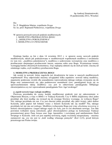 bp Andrzej Siemieniewski, 18 października 2012, Wrocław Do: Sz. P. Magdalena Matras, wspólnota Droga Sz. ks. prof. Rajmund Pietkiewicz, wspólnota Droga W sprawie pewnych nowych praktyk modlitewnych: 1. MODLITWA PRZEBACZENIA BOGU 2. „MODLITWA POKOLENIOWA” 3. MODLITWA O UWOLNIENIE Dziękuję bardzo za list z dnia 14 września 2012 r. w sprawie oceny nowych praktyk modlitewnych, takich jak praktykowana w modlitewnych wspólnotach modlitwa o uwolnienie (w tym tzw. „modlitwa pokoleniowa”), modlitwa o uzdrowienie wewnętrzne oraz modlitwa o przebaczenie obejmująca przebaczenie innym, samemu sobie oraz Bogu. Wymienione tematy wymagają bardzo obszernych komentarzy, więc najlepiej odnieść się do nich po kolei. Zacznę od ostatniego wątku, czyli modlitwy przebaczenia Bogu. 1. MODLITWA PRZEBACZENIA BOGU Jak ocenić tę nowość, która zagościła już dwadzieścia lat temu w naszych modlitewnych wspólnotach? Przy odpowiedzi musimy uwzględnić kilka aspektów: nowość takiej modlitwy, argumenty podawane zwykle dla uzasadnienia wprowadzenia takiego rodzaju zwracania się do Boga oraz zastanowienie się, jaka podstawowa mentalność (tzw. paradygmat) kryje się za upowszechnieniem takiej modlitwy: czy jest to odnowienie paradygmatu biblijnego chrześcijaństwa czy też wprowadzanie paradygmatu New Age’owskiego? a. aspekt nowości tego rodzaju modlitwy. Pierwszą przesłanką do oceny każdej modlitewnej praktyki jest jej zakorzenienie w Objawieniu Bożym, a więc w Biblii i w Tradycji Kościoła. Czy w Biblii znajdziemy choć jeden przykład, aby ktoś modląc się zwracał się do swojego Stwórcy wyznając, że wybacza Bogu? Nie, takiego przykładu nie ma. Czy jest chociaż jeden przykład, aby jakiś święty, jakiś doktor Kościoła, jakiś papież lub bohater wiary z historii Kościoła tak się modlił? Nie, takiego przykładu też nie ma ani jednego. Modlitwa wybaczenia Bogu jest więc absolutną nowością w historii chrześcijaństwa: czegoś takiego nigdy nie było, jest to coś absolutnie nowego. Ten fakt powinien wzbudzić naszą ostrożność, gdyż chrześcijaństwo polega na kontynuacji Tradycji pozostawionej przez Pana Jezusa oraz Jego Apostołów i rozwijanej pod natchnieniem Duch Świętego w Kościele. Jeśli coś jest zupełną nowością, nigdy wcześniej niespotykaną – musimy zastanowić się, czy nie jest to „kult według własnego pomysłu” (Kol 2,23), przed którym przestrzega nas Pismo święte. 1 b. ocena argumentacji podawanej dla uzasadnienia tej nowości Osoby wprowadzające tę nową modlitwę są niekiedy świadome tej trudności, dlatego próbują uzasadnić jakoś potrzebę wprowadzenie nowej modlitwy przebaczenia Bogu. Głosi się wtedy, że doświadczenie pokazuje, iż niekiedy ludzie czują się znacznie lepiej po skierowaniu do Boga słów modlitwy wybaczającej Mu Jego postawę. Aby lepiej się poczuć, „potrzebujemy powiedzieć: «Dobrze, Panie Boże, przebaczam Ci»”. Czy jest to argumentacja wystarczająca? Zdecydowanie nie: przebaczenie to proces zachodzący między dwiema osobami: między skrzywdzonym i winowajcą. Jest to akt osoby skrzywdzonej skierowany wobec winowajcy; to gotowość do puszczenia w niepamięć doznanych od winowajcy krzywd; to wyjście naprzeciw z sercem otwartym na przyszłość. W modlitwie przebaczenia Bogu w roli winowajcy, krzywdziciela, tego, który dopuścił się zaniedbania wobec mnie i aktywnie wobec mnie zawinił występuje Bóg. Jest to więc modlitwa niezgodna z fundamentalną prawdą wiary, że Bóg jest absolutnie i całkowicie dobry i nie ma w Nim cienia zła. Zwykle osoby praktykujące modlitwę przebaczenia Bogu są tego świadome i argumentują w ten sposób: wprawdzie obiektywnie rzecz biorąc Bóg nikogo nie skrzywdził, ale subiektywne odczucie wielu ludzi jest takie, że zostali źle potraktowani przez Boga, zostali przez Niego zaniedbani albo skazani na niekorzystne warunki życiowe. Wtedy, mówi się, chociaż obiektywnie nie można wybaczać Bogu, to jednak subiektywnie przynosi to ludziom ulgę: „ludzie tego potrzebują”. Czy taka argumentacji wystarczy, aby utrzymać zwyczaj modlitwy przebaczania Bogu? Tu znowu należy powiedzieć: zdecydowanie nie! Taka modlitwa jest fikcją, nie wyraża prawdy o Bogu, a nawet wręcz wyraża o Bogu nieprawdę. I mimo to nakłaniamy kogoś do takiej modlitwy mówiąc: choć to fikcja i nieprawda, ale ludziom pomaga! Trzeba się zastanowić, czy nie jest to przejście od paradygmatu apostolskiego do paradygmatu New Age. c. paradygmat apostolski a paradygmat New Age-owski Paradygmat apostolski mówi: „Poznacie Prawdę i Prawda was wyzwoli”. Paradygmat New Age mówi: „Cóż to jest prawda? Jeśli coś ci pomaga, to jest to prawdą, niezależnie od tego, czy wyraża poprawną naukę Ewangelii, czy nie!” Paradygmat New Age’owski ujęty jest w watykańskim dokumencie Jezus Chrystus dawca wody żywej tak: „Zasadniczą kwestią jest znalezienie swojej własnej prawdy zgodnej z dobrym samopoczuciem: ocena religii jest zależna od czyichś uczuć i doświadczeń”. Natomiast zgodnie z watykańskim dokumentem o New Age, chrześcijańskim paradygmatem naszego spotkania z Prawdą jest rozmowa przy studni Pana Jezusa z Samarytanką. Samarytanka to osoba uwikłana w grzechy, błędne pojęcia religijne, konflikt ze społecznością – jednym słowem wszystkie możliwe kłopoty, z jakimi ludzie przyjeżdżają na rekolekcje o uzdrowieniu wewnętrznym. I jak wygląda biblijny, ewangeliczny paradygmat uzdrowieńczego spotkania? Twoje, Samarytanko wybory, twoje grzechy i twoje błędy są problemem. I ja, Jezus, jestem rozwiązaniem tego problemu! «O, gdybyś znała dar Boży i [wiedziała], kim jest Ten, kto ci mówi: "Daj Mi się napić" - prosiłabyś Go wówczas, a dałby ci wody żywej» (J 4,10). Tak zresztą zrelacjonowała potem owa niewiasta swoje uzdrowienie innym Samarytanom: „Powiedział mi wszystko, co uczyniłam”. W podsum