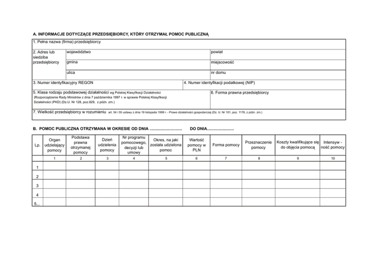 A. INFORMACJE DOTYCZĄCE PRZEDSIĘBIORCY, KTÓRY OTRZYMAŁ POMOC PUBLICZNĄ 1. Pełna nazwa (firma) przedsiębiorcy 2. Adres lub siedziba przedsiębiorcy województwo powiat gmina miejscowość ulica nr domu 3. Numer identyfikacyjny REGON 4. Numer identyfikacji podatkowej (NIP) 5. Klasa rodzaju podstawowej działalności wg Polskiej Klasyfikacji Działalności 6. Forma prawna przedsiębiorcy (Rozporządzenie Rady Ministrów z dnia 7 października 1997 r. w sprawie Polskiej Klasyfikacji Działalności (PKD) (Dz.U. Nr 128, poz.829, z późn. zm.) 7. Wielkość przedsiębiorcy w rozumieniu art. 54 i 55 ustawy z dnia 19 listopada 1999 r. - Prawo działalności gospodarczej (Dz. U. Nr 101, poz. 1178, z późn. zm.) B. POMOC PUBLICZNA OTRZYMANA W OKRESIE OD DNIA ............................. Lp. 1 2 3 4 5... Organ udzielający pomocy Podstawa prawna otrzymanej pomocy Dzień udzielenia pomocy 1 2 3 Nr programu Okres, na jaki pomocowego, została udzielona decyzji lub pomoc umowy 4 5 DO DNIA........................ Wartość pomocy w PLN Forma pomocy Przeznaczenie pomocy 6 7 8 Koszty kwalifikujące się Intensyw do objęcia pomocą ność pomocy 9 10 C. Dane osoby upowaŜnionej do udzielania informacji ....................................... (imię i nazwisko) .................................... .................................................... (stanowisko słuŜbowe) (data i podpis) Dane osoby upowaŜnionej do kontaktów z organem udzielającym pomocy w sprawie informacji zawartych w formularzu ....................................... (imię i nazwisko) .................................... telefon ....................................... (stanowisko słuŜbowe) faks ....................................... e-mail ....................................... Uwaga: Zgodnie z art. 47 ust. 2 ustawy z dnia 27 lipca 2002 r. o warunkach dopuszczalności i nadzorowaniu pomocy publicznej dla przedsiębiorców (Dz. U. Nr 141, poz. 1177) w przypadku przekazania informacji, o których mowa w art. 44 ust. 1 tej ustawy, niezgodnych ze stanem faktycznym organ nadzorujący moŜe, w drodze decyzji, nałoŜyć na przedsiębiorcę karę pienięŜną w wysokości do 1 % wartości udzielonej pomocy.
