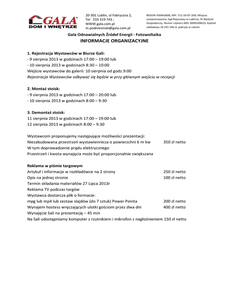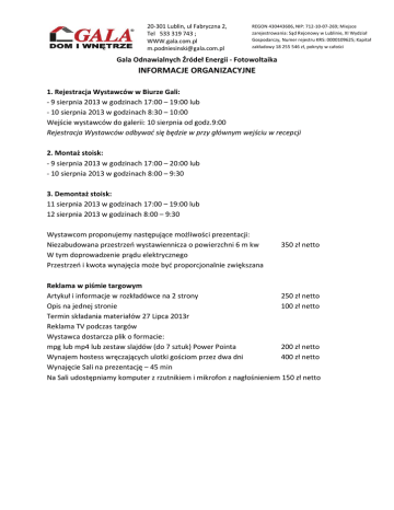 20-301 Lublin, ul Fabryczna 2, Tel 533 319 743 ; WWW.gala.com.pl [email protected] REGON 430443606, NIP: 712-10-07-269; Miejsce zarejestrowania: Sąd Rejonowy w Lublinie, XI Wydział Gospodarczy, Numer rejestru KRS: 0000109625; Kapitał zakładowy 18 255 546 zł, pokryty w całości Gala Odnawialnych Źródeł Energii - Fotowoltaika INFORMACJE ORGANIZACYJNE 1. Rejestracja Wystawców w Biurze Gali: - 9 sierpnia 2013 w godzinach 17:00 – 19:00 lub - 10 sierpnia 2013 w godzinach 8:30 – 10:00 Wejście wystawców do galerii: 10 sierpnia od godz.9:00 Rejestracja Wystawców odbywać się będzie w przy głównym wejściu w recepcji 2. Montaż stoisk: - 9 sierpnia 2013 w godzinach 17:00 – 20:00 lub - 10 sierpnia 2013 w godzinach 8:00 – 9:30 3. Demontaż stoisk: 11 sierpnia 2013 w godzinach 17:00 – 19:00 lub 12 sierpnia 2013 w godzinach 8:00 – 9:30 Wystawcom proponujemy następujące możliwości prezentacji: Niezabudowana przestrzeń wystawiennicza o powierzchni 6 m kw W tym doprowadzenie prądu elektrycznego Przestrzeń i kwota wynajęcia może być proporcjonalnie zwiększana 350 zł netto Reklama w piśmie targowym Artykuł i informacje w rozkładówce na 2 strony 250 zł netto Opis na jednej stronie 100 zł netto Termin składania materiałów 27 Lipca 2013r Reklama TV podczas targów Wystawca dostarcza plik o formacie: mpg lub mp4 lub zestaw slajdów (do 7 sztuk) Power Pointa 200 zł netto Wynajem hostess wręczających ulotki gościom przez dwa dni 400 zł netto Wynajęcie Sali na prezentację – 45 min Na Sali udostępniamy komputer z rzutnikiem i mikrofon z nagłośnieniem 150 zł netto 20-301 Lublin, ul Fabryczna 2, Tel 533 319 743 ; WWW.gala.com.pl [email protected] REGON 430443606, NIP: 712-10-07-269; Miejsce zarejestrowania: Sąd Rejonowy w Lublinie, XI Wydział Gospodarczy, Numer rejestru KRS: 0000109625; Kapitał zakładowy 18 255 546 zł, pokryty w całości Ostateczny termin składania zgłoszeń w imprezie to 30 lipca 2013r. Jednocześnie informujemy, że pełnej rezerwacji miejsca można dokonać poprzez podpisanie formularza zgłoszenia oraz dokonania przelewu zadatku w wysokości 100 zł netto + VAT do 29 lipca. Prosimy także o zgłaszanie do biura Gali - kolportaży materiałów odbywających się poza stoiskiem. Kolportaż materiałów reklamowych jest usługą płatną, prowadzoną przez specjalnie wyznaczone osoby i prowadzenie kolportażu poza stoiskiem we własnym zakresie będzie skutkować wystawieniem faktury VAT za tę usługę 150zł netto za każdy dzień kolportażu. Zgodnie z Regulaminem zabrania się umieszczania eksponatów i materiałów reklamowych za pomocą technik, które powodują trwałe uszkodzenia elementów zabudowy (np. przewiercanie, wbijanie gwoździ, przyklejanie, itp.). W przypadku stwierdzenia uszkodzeń Organizator obciąży Uczestnika wg własnej wyceny. Po zakończeniu targów należy doprowadzić miejsce wynajmu i jego okolice do porządku. Kontakt: Organizator: Maciej Podniesiński [email protected] 533 319 743 Niniejsze informacje nie mają charakteru oferty handlowej, proszę traktować je jedynie informacyjnie, pełne informacje handlowe niebawem doślemy w formularzu zamówienia. 20-301 Lublin, ul Fabryczna 2, Tel 533 319 743 ; WWW.gala.com.pl [email protected] REGON 430443606, NIP: 712-10-07-269; Miejsce zarejestrowania: Sąd Rejonowy w Lublinie, XI Wydział Gospodarczy, Numer rejestru KRS: 0000109625; Kapitał zakładowy 18 255 546 zł, pokryty w całości