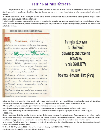 Na przełomie lat 1975/1985 polska flota rybacka zrzeszona u kilku polskich armatorów posiadała na swoim stanie ponad 140 statków rybackich. Była to licząca się na tym rynku flota, która łowiła na wszystkich akwenach świata. W swoim posiadaniu miała nie tylko statki, które łowiły, ale również statki przetwórnie. Łza się w oku kręci i ciśnie się na usta pytanie, co stało się z tą flotą? Z wiadomości prasowych dowiadujemy się, że prawie nie istnieje: sprzedano, wydzierżawiono, przejedzono. W tym czasie PLL LOT realizowały swoje interesy organizując loty czarterowe na podmianę załóg rybackich do najdalszych zakątków świata. Miało to dobre strony dla załóg lotniczych, które latały na IŁ-62, bo zwiedziliśmy prawie cały świat od Alaski po Południowy Pacyfik. Na przełomie lat 1980 PLL LOT wprowadziły do użytku nowe samoloty IŁ-62M (M-modyfikowany) z oszczędniejszymi silnikami, które zużywały mniej paliwa. Dotychczas zużycie paliwa na długich trasach kształtowało się w granicach 8000 kg/na 1 godz. lotu. Teraz z oszczędniejszymi silnikami (D30-KU) zużycie spadło i utrzymywało się w granicach 6500-6800 kg/na 1 godz. lotu. Nowe samoloty IŁ-62M miały jeszcze jedną dodatkową zmianę konstrukcyjną. Zamontowano w tylnej części statecznika pionowego dodatkowy zbiornik na 2 tony paliwa. Oszczędniejsze silniki i dodatkowy zbiornik paliwa zwiększał zasięg samolotu i poprawiał ekonomię. Teraz w zasięgu naszych samolotów były również porty w Ameryce Południowej. Porty bazowe, w których wymieniały się załogi lotnicze to: Rio de Janeiro, Santiago de Chile, Montevideo, Buenos Aires. W dniach 03-09 grudnia 1982 roku wykonywałem 2 rejsy na DZIEWICZEJ TRASIE: Rio de Janeiro-Trelew (Argentyna)- Rio de Janeiro. Z Warszawy cała moja załoga poleciała samolotem PLL LOT do Rzymu, tam przesiedliśmy się na samolot ALITALI Boeing 747 Jumbo, którym polecieliśmy bezpośrednio do Rio de Janeiro. Takie długie rejsy sprawiają zawsze kłopoty z aklimatyzacją i zmianą stref czasowych. W Warszawie mróz -10 stopni w Rzymie +15 w Rio de Janeiro +30 stopni C. Koniecznie trzeba wozić letnie ciuchy. W Rio de Janeiro drobiazgowa kontrola paszportowa. W paszportach mamy wizy, jako załoga, wszyscy po cywilnemu w dodatku ubrani jak „Eskimosi” a tu środek lata i wysokie temperatury. Ceregiele trwają dosyć długo, fotografują nasze paszporty. Wreszcie koniec odprawy jedziemy do hotelu OTHON PALACE. Hotel pięknie położony przy głównej słynnej promenadzie Copacabana, na której koncentruje się większość życia mieszkańców Rio de Janeiro. Widać gości z całego świata, słychać różne języki. W okresie przedświątecznym pięknie udekorowane sklepy, które kontrastują z szarością życia w Polsce. Z okna hotelu widzę piękną szeroką plażę nad Oceanem Atlantyckim. W hotelowym barku serwują kilka rodzajów świetnej kawy. Jak zapewniają najlepsza „palheta”. Z hotelu są dwa wyjścia bezpośrednio na Copacabanę oraz w podziemiach prosto na plażę. Nie zamierzamy się opalać, idziemy lekko ubrani zwiedzić plażę i przy okazji coś przekąsić w małych licznych barach wzdłuż plaży. W podziemiach hotelu prysznice, przy każdej kabinie duży biały miękki ręcznik zachęca do kąpieli. SECURITY hotelowe ostrzega nas, aby być ostrożnym na plaży, pilnować portfeli i aparatów fotograficznych, ponieważ grasują gangi, które sypią piaskiem w oczy i kradną, co mają pod ręką. Na plaży widoczny okres świąteczny, wypoczywa dużo ludzi przy każdej rodzinie z dziećmi stoi mała choinka. NASZ REJS ZYSKAŁ MIANO REJS NA KONIEC ŚWIATA. Samolot startuje z Warszawy do Dakaru wymiana załogi i start do Rio de Janeiro. Prawie tą samą trasą, którą leciał Stanisław SKARŻYŃSKI w 1933 roku pokonując na małym polskim samolocie RWD-5 ocean atlantycki. Wystartował z Senegalu lądował w MACEIDO w Brazylii z tą małą różnicą, że on pokonał ocean atlantycki lecąc 21 godzin. (Uczestnik bitwy o Anglię w II wojnie światowej, zginął w locie bojowym).Nasza załoga przejmuje samolot w Rio de Janeiro i po raz pierwszy lecę w tym rejonie świata do Trelew w Argentynie. Na pokładzie mamy 85 marynarzy + 6 ton frachtu. Lotnisko Trelew leży na wschodnim wybrzeżu Argentyny nad oceanem atlantyckim. Argentyna, to na zachodzie wzdłuż granicy z Chile olbrzymie góry Andy a raczej południowa część Andów o długości około 2000km. Na wschodzie nizina LA PLATA na południu wyżyna PATAGONI. Klimat bardzo zróżnicowany od zwrotnikowego po polarny nad ZIEMIĄ OGNISTĄ ze słynnym przylądkiem HORN. W rejonie TRELEW pogoda potrafi się zmieniać diametralnie w bardzo krótkim czasie ( 5- 6 godzin), czego doświadczyłem osobiście od pełnego zachmurzenia z deszczem do pełnego błękitu bez jednej chmurki. Po zasięgnięciu informacji w biurze meteo synoptyk informuje mnie, że przez większą część roku na trasie RIOTRELEW występują układy baryczne, które dają składowe wiatru czołowego 150-200 km/h. Tak jest i tym razem. Na wypadek awarii zapoznaję się z lotniskami leżącymi wzdłuż naszej trasy Sao Paulo, Florianopolis, Porto Allegre, Bahia Blanca. Składamy plan lotu i startujemy. W powietrzu przez większą część trasy w korespondencji radiowej dominuje język hiszpański. Mało załóg posługuje się językiem angielskim, jednak przy każdym wywołaniu kontroli w języku angielskim odpowiadają w tym języku. W związku z tym nasza załoga nie ma pełnej kontroli odnośnie ruchu lotniczego w najbliższej odległości od naszego samolotu. Prowincjonalne lotnisko TRELEW położone jest na dużym płaskowyżu dysponuje pasem startowym długości 2560 metrów na kierunku 060-240 stopni, oraz skromnym budynkiem portowym. Cały rejon porośnięty jest niską roślinnością (pampa) Lotnisko obsługuje regionalny ruch małymi samolotami 3-5 rejsów tygodniowo pomimo małego ruchu 
