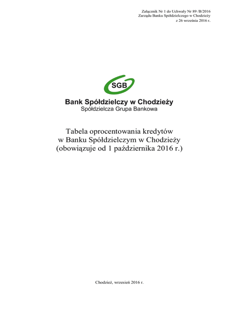 Załącznik Nr 1 do Uchwały Nr 89 /B/2016 Zarządu Banku Spółdzielczego w Chodzieży z 26 września 2016 r. Tabela oprocentowania kredytów w Banku Spółdzielczym w Chodzieży (obowiązuje od 1 października 2016 r.) Chodzież, wrzesień 2016 r. Tabela oprocentowania kredytów w Banku Spółdzielczym w Chodzieży Spis treści KLIENCI INDYWIDUALNI Tab. 1. Kredyty konsumenckie ...............................................................................................3 Tab. 2. Kredyty mieszkaniowe i pożyczki hipoteczne .............................................................3 Tab. 3. Kredyty preferencyjne ........................................................................................................ 4 Tab. 4. Karty kredytowe ................................................................................................................. 4 KLIENCI INSTYTUCJONALNI Tab. 5. Kredyty na działalność gospodarczą ................................................................................. 4 Tab. 6. Kredyty na działalność rolniczą ........................................................................................ 5 Tab. 7. Kredyty preferencyjne ........................................................................................................ 6 Tab. 8. Usługi faktoringowe ........................................................................................................... 6 Tab. 9. Karty kredytowe ................................................................................................................. 6 POZOSTAŁE Tab. 10. Dyskonto weksli ............................................................................................................... 6 KREDYTY, KTÓRYCH OKRES WYCOFANE Z OFERTY BANKU UDZIELANIA UPŁYNĄŁ ORAZ Tab. 11. Kredyty, których okres udzielania upłynął oraz wycofane z oferty Banku .................. 7 OPROCENTOWANIE MAKSYMALNE Tab. 12. Oprocentowanie maksymalne........................................................................................ 11 26/IX/2016 2 Tabela oprocentowania kredytów w Banku Spółdzielczym w Chodzieży KLIENCI INDYWIDUALNI Tab. 1 Kredyty konsumenckie Lp. 1. 2. 3. 4. 5. Rodzaj kredytu oprocentowanie w stosunku rocznym stałe zmienne Kredyt w ROR do 60 miesięcy Kredyt konsumencki do 60 miesięcy dla posiadaczy Karty Dużej Rodziny oprocentowanie obniżone o 0,50 p.p. za każdy ROR w Banku Spółdzielczym w Chodzieży członka/członków rodziny (maksymalnie do 5%) udzielany od 03.08.2015 r. do 31.12.2016 r. Kredyt konsumpcyjny zabezpieczony hipotecznie od 36 miesięcy do 60 miesięcy Kredyt Uniwersalny „Czas jesienno-zimowych radości” udzielany od 01.10.2016 r. do 31.03.2017 r. do 12 miesięcy powyżej 12 miesięcy do 24 miesięcy powyżej 24 miesięcy do 36 miesięcy Kredyt okazjonalny dla określonych grup klientów detalicznych – „Trzymajmy się razem” dla Członków Chodzieskiego Towarzystwa Narciarskiego oraz pracowników spółdzielni udzielany od 26.08.2015 r. do 31.08.2018 r. do 12 miesięcy dla posiadaczy ROR lub rachunku bieżącego w Banku Spółdzielczym w Chodzieży dla pozostałych osób 10,00% - 10,00% - 10,00%6 - 5,00% 6,00% 7,00% - 6,00% - 8,00% - Tab. 2 Kredyty mieszkaniowe i pożyczki hipoteczne Lp. 1. Rodzaj kredytu oprocentowanie w stosunku rocznym stałe zmienne Kredyt mieszkaniowy dla posiadaczy ROR oraz rachunków rozliczeniowych w Banku Spółdzielczym w Chodzieży przy udziale środków własnych w wysokości 50% i powyżej dla posiadaczy ROR oraz rachunków rozliczeniowych w Banku Spółdzielczym w Chodzieży dla osób nie posiadających ROR oraz rachunków rozliczeniowych w Banku Spółdzielczym w Chodzieży przy udziale środków własnych w wysokości 50% i powyżej dla osób nie posiadających ROR oraz rachunków rozliczeniowych w Banku Spółdzielczym w Chodzieży 26/IX/2016 3 - WIBOR 3 M1 + 2,00 p.p. 2,6 - WIBOR 3 M1 + 2,50 p.p. 2,6 - WIBOR 3 M1 + 3,00 p.p. 2,6 - WIBOR 3 M1 + 3,50 p.p. 2,6 Tabela oprocentowania kredytów w Banku Spółdzielczym w Chodzieży 2. „Dobra pożyczka hipoteczna” dla posiadaczy rachunków rozliczeniowych (bieżące/pomocnicze) lub ROR w Banku Spółdzielczym w Chodzieży dla pozostałych osób - WIBOR 3 M1 + 4,00 p.p. 2,6 - WIBOR 3 M1 + 5,00 p.p. 2,6 Tab. 3 Kredyty preferencyjne Lp. Rodzaj kredytu oprocentowanie w stosunku rocznym stałe zmienne 1. Kredyt studencki 2. Kredyt mieszkaniowy „Mieszkanie dla Młodych” udzielany od 17.09.2014 r. dla posiadaczy ROR oraz rachunków rozliczeniowych w Banku Spółdzielczym w Chodzieży przy udziale środków własnych w wysokości 50% i powyżej dla posiadaczy ROR oraz rachunków rozliczeniowych w Banku Spółdzielczym w Chodzieży dla osób nie posiadających ROR oraz rachunków rozliczeniowych w Banku Spółdzielczym w Chodzieży przy udziale środków własnych w wysokości 50% i powyżej dla osób nie posiadających ROR oraz rachunków rozliczeniowych w Banku Spółdzielczym w Chodzieży - 1,20 stopy redyskonta weksli NBP 3 - WIBOR 3 M1 + 2,00 p.p. 2,6 - WIBOR 3 M1 + 2,50 p.p. 2,6 - - WIBOR 3 M1 + 3,00 p.p. 2,6 WIBOR 3 M1 + 3,50 p.p. 2,6 Tab. 4 Karty kredytowe Lp. 1. Rodzaj kredytu oprocentowanie w stosunku rocznym stałe zmienne Karty kredytowe oprocentowanie transakcji bezgotówkowych oprocentowanie transakcji gotówkowych - WIBOR 12M 4 + 8,00 p.p. 2 WIBOR 12M 4 + 8,00 p.p. 2 KLIENCI INSTYTUCJONALNI Tab. 5 Kredyty na działalność gospodarczą Lp. 1. 2. 3. Rodzaj kredytu Kredyt w rachunku bieżącym Kredyt na działalność gospodarczą do 6 miesięcy do 12 miesięcy powyżej 12 miesięcy Kredyt obrotowy „Dobry Biznes” dla posiadaczy rachunków rozliczeniowych (bieżące/pomocnicze) lub ROR w Banku Spółdzielczym w Chodzieży dla pozostałych osób/podmiotów 26/IX/2016 4 oprocentowanie w stosunku rocznym stałe zmienne 10,00% WIBOR 3 M 5 + 6,20 p.p. 2 7,25% 10,00% - WIBOR 3 M 5 + 6,75 p.p. 2 WIBOR 3 M 5 + 7,00 p.p. 2 - WIBOR 3 M 5 + 5,00 p.p. 2 - WIBOR 3 M 5