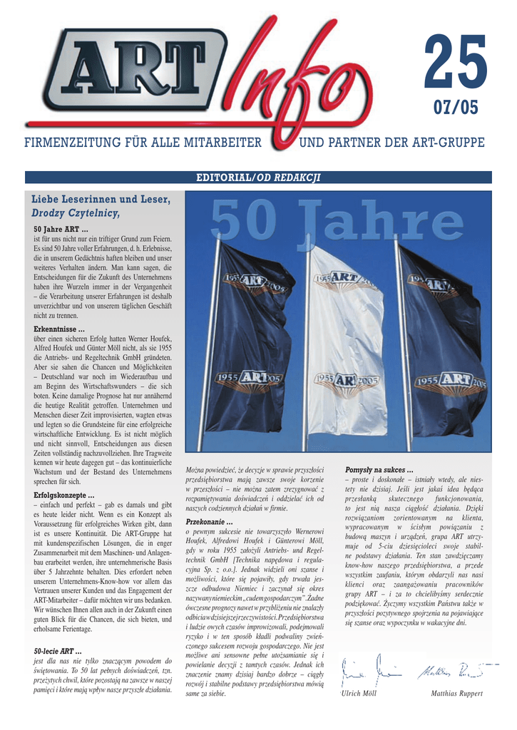 25 07/05 FIRMENZEITUNG FÜR ALLE MITARBEITER UND PARTNER DER ART-GRUPPE EDITORIAL/OD REDAKCJI Liebe Leserinnen und Leser, Drodzy Czytelnicy, 50 Jahre ART … ist für uns nicht nur ein triftiger Grund zum Feiern. Es sind 50 Jahre voller Erfahrungen, d. h. Erlebnisse, die in unserem Gedächtnis haften bleiben und unser weiteres Verhalten ändern. Man kann sagen, die Entscheidungen für die Zukunft des Unternehmens haben ihre Wurzeln immer in der Vergangenheit – die Verarbeitung unserer Erfahrungen ist deshalb unverzichtbar und von unserem täglichen Geschäft nicht zu trennen. Erkenntnisse … über einen sicheren Erfolg hatten Werner Houfek, Alfred Houfek und Günter Möll nicht, als sie 1955 die Antriebs- und Regeltechnik GmbH gründeten. Aber sie sahen die Chancen und Möglichkeiten – Deutschland war noch im Wiederaufbau und am Beginn des Wirtschaftswunders – die sich boten. Keine damalige Prognose hat nur annähernd die heutige Realität getroffen. Unternehmen und Menschen dieser Zeit improvisierten, wagten etwas und legten so die Grundsteine für eine erfolgreiche wirtschaftliche Entwicklung. Es ist nicht möglich und nicht sinnvoll, Entscheidungen aus diesen Zeiten vollständig nachzuvollziehen. Ihre Tragweite kennen wir heute dagegen gut – das kontinuierliche Wachstum und der Bestand des Unternehmens sprechen für sich. Erfolgskonzepte … – einfach und perfekt – gab es damals und gibt es heute leider nicht. Wenn es ein Konzept als Voraussetzung für erfolgreiches Wirken gibt, dann ist es unsere Kontinuität. Die ART-Gruppe hat mit kundenspezifischen Lösungen, die in enger Zusammenarbeit mit dem Maschinen- und Anlagenbau erarbeitet werden, ihre unternehmerische Basis über 5 Jahrzehnte behalten. Dies erfordert neben unserem Unternehmens-Know-how vor allem das Vertrauen unserer Kunden und das Engagement der ART-Mitarbeiter – dafür möchten wir uns bedanken. Wir wünschen Ihnen allen auch in der Zukunft einen guten Blick für die Chancen, die sich bieten, und erholsame Ferientage. 50-lecie ART … jest dla nas nie tylko znaczącym powodem do świętowania. To 50 lat pełnych doświadczeń, tzn. przeżytych chwil, które pozostają na zawsze w naszej pamięci i które mają wpływ nasze przyszłe działania. Można powiedzieć, że decyzje w sprawie przyszłości przedsiębiorstwa mają zawsze swoje korzenie w przeszłości – nie można zatem zrezygnować z rozpamiętywania doświadczeń i oddzielać ich od naszych codziennych działań w firmie. Przekonanie … o pewnym sukcesie nie towarzyszyło Wernerowi Houfek, Alfredowi Houfek i Günterowi Möll, gdy w roku 1955 założyli Antriebs- und Regeltechnik GmbH [Technika napędowa i regulacyjna Sp. z o.o.]. Jednak widzieli oni szanse i możliwości, które się pojawiły, gdy trwała jeszcze odbudowa Niemiec i zaczynał się okres nazywany niemieckim „cudem gospodarczym”. Żadne ówczesne prognozy nawet w przybliżeniu nie znalazły odbicia w dzisiejszej rzeczywistości. Przedsiębiorstwa i ludzie owych czasów improwizowali, podejmowali ryzyko i w ten sposób kładli podwaliny zwieńczonego sukcesem rozwoju gospodarczego. Nie jest możliwe ani sensowne pełne utożsamianie się i powielanie decyzji z tamtych czasów. Jednak ich znaczenie znamy dzisiaj bardzo dobrze – ciągły rozwój i stabilne podstawy przedsiębiorstwa mówią same za siebie. Pomysły na sukces … – proste i doskonałe – istniały wtedy, ale niestety nie dzisiaj. Jeśli jest jakaś idea będąca przesłanką skutecznego funkcjonowania, to jest nią nasza ciągłość działania. Dzięki rozwiązaniom zorientowanym na klienta, wypracowanym w ścisłym powiązaniu z budową maszyn i urządzeń, grupa ART utrzymuje od 5-ciu dziesięcioleci swoje stabilne podstawy działania. Ten stan zawdzięczamy know-how naszego przedsiębiorstwa, a przede wszystkim zaufaniu, którym obdarzyli nas nasi klienci oraz zaangażowaniu pracowników grupy ART – i za to chcielibyśmy serdecznie podziękować. Życzymy wszystkim Państwu także w przyszłości pozytywnego spojrzenia na pojawiające się szanse oraz wypoczynku w wakacyjne dni. Ulrich Möll Matthias Ruppert Ein halbes Jahrhundert Pół wieku firmy Wegen unüberbrückbarer Gegensätze zwischen den Westalliierten und der UDSSR scheitert 1954 die deutsche Wiedervereinigung. Die UDSSR erklärt die Souveränität der DDR (Deutsche Demokratische Republik) und kündigt deren Wiederbewaffnung an. In der BRD (Bundesrepublik Deutschland) ändert man das Grundgesetz, damit die allgemeine Wehrpflicht eingeführt werden kann. Der Kalte Krieg beginnt und wird die Weltgemeinschaft über Jahrzehnte in Atem halten. Von dieser Seite sicherlich kein Grund, um optimistisch nach vorne zu schauen. Andererseits, man war Fußballweltmeister und – viel wichtiger – das Land war mitten im Aufbau. Die Westmächte, allen voran die USA, hatten mit Finanzhilfen aus dem Marshallplan geholfen, die Wirtschaftswachstumsraten in der BRD auf über 10 % pro Jahr zu steigern. Mit aufgekrempelten Ärmeln wurde an sechs Tagen pro Woche deutschen Wirtschaftswunders, verlangt nach Steuerungs- und Regelungskomponenten. Es gibt noch keine elektronischen Geräte, keine Software und deshalb eine Vielfalt elektromechanischer Varianten. Um ihre Kunden noch besser zu versorgen, beginnt die ART 1956, elektromechanische Relais zu fertigen. Schnell werden die gemieteten Geschäftsräume zu klein und man beschließt, näher zum größten Kunden, der „Schnellpresse“, heute Heidelberger Druckmaschinen AG, insgesamt bis zu 48,6 Stunden gearbeitet, z. B. in einem Mannheimer Hinterhofgebäude. Hier montiert das Ingenieurbüro Werner Houfek, Industrievertretung für elektromechanische Komponenten, seit 1953 mit 6 Mitarbeitern Steuerungen. Damit die Produktion sich unabhängig von der Industrievertretung entwickeln kann, beschließen die Brüder Werner und Alfred Houfek gemeinsam mit dem vierundzwanzigjährigen Ingenieur Günther Möll eine Produktio