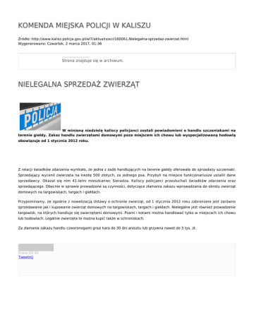 KOMENDA MIEJSKA POLICJI W KALISZU Źródło: http://www.kalisz.policja.gov.pl/wl7/aktualnosci/160061,Nielegalna-sprzedaz-zwierzat.html Wygenerowano: Czwartek, 2 marca 2017, 01:36 Strona znajduje się w archiwum. NIELEGALNA SPRZEDAŻ ZWIERZĄT W minioną niedzielę kaliscy policjanci zostali powiadomieni o handlu szczeniakami na terenie giełdy. Zakaz handlu zwierzętami domowymi poza miejscem ich chowu lub wyspecjalizowaną hodowlą obowiązuje od 1 stycznia 2012 roku. Z relacji świadków zdarzenia wynikało, że jedna z osób handlujących na terenie giełdy oferowała do sprzedaży szczeniaki. Sprzedający wycenił zwierzęta na kwotę 500 złotych, za jednego psa. Przybyli na miejsce funkcjonariusze ustalili dane sprzedawcy. Okazał się nim 41-letni mieszkaniec Sieradza. Kaliscy policjanci przesłuchali świadków zdarzenia oraz sprzedającego. Obecnie w sprawie prowadzone są czynności, dotyczące złamania zakazu wprowadzania do obrotu zwierząt domowych na targowiskach, targach i giełdach. Przypominamy, że zgodnie z nowelizacją Ustawy o ochronie zwierząt, od 1 stycznia 2012 roku zabronione jest zarówno sprzedawanie jak i kupowanie zwierząt domowych na targowiskach, targach i giełdach. Nielegalne jest również prowadzenie targowisk, na których handluje się zwierzętami domowymi. Psami i kotami można handlować tylko w miejscach ich chowu lub hodowlach. Legalnie zwierzęta te można kupić także w schroniskach. Za złamanie zakazu handlu czworonogami grozi kara do 30 dni aresztu lub grzywna nawet do 5 tys. zł. Ocena: 0/5 (0) Tweetnij