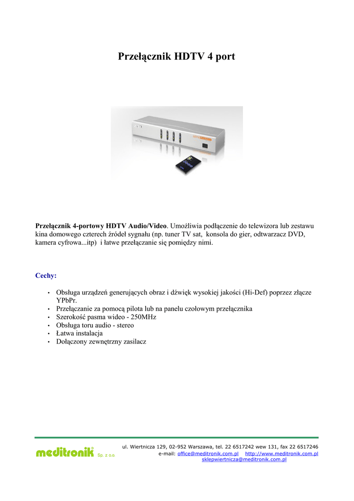 Przełącznik HDTV 4 port Przełącznik 4-portowy HDTV Audio/Video. Umożliwia podłączenie do telewizora lub zestawu kina domowego czterech źródeł sygnału (np. tuner TV sat, konsola do gier, odtwarzacz DVD, kamera cyfrowa...itp) i łatwe przełączanie się pomiędzy nimi. Cechy: • • • • • • Obsługa urządzeń generujących obraz i dźwięk wysokiej jakości (Hi-Def) poprzez złącze YPbPr. Przełączanie za pomocą pilota lub na panelu czołowym przełącznika Szerokość pasma wideo - 250MHz Obsługa toru audio - stereo Łatwa instalacja Dołączony zewnętrzny zasilacz ul. Wiertnicza 129, 02-952 Warszawa, tel. 22 6517242 wew 131, fax 22 6517246 e-mail: [email protected] http://www.meditronik.com.pl [email protected] Widok z przodu: Widok z tyłu: Diagram: ul. Wiertnicza 129, 02-952 Warszawa, tel. 22 6517242 wew 131, fax 22 6517246 e-mail: [email protected] http://www.meditronik.com.pl [email protected] Specyfikacja: Connections 4 Port Selection Front panel switches, IR remote controller Connectors Input Video Audio Output Video Audio LEDs Buttons Y 4 x RCA Female (Green) Pb 4 x RCA Female (Blue) Pr 4 x RCA Female (Red) L 2 x RCA Female (White) R 2 x RCA Female (Red) Y 1 x RCA Female (Green) Pb 1 x RCA Female (Blue) Pr 1 x RCA Female (Red) L 1 x RCA Female (White) R 1 x RCA Female (Red) Power 1 x DC Jack Online 4 (Orange) Selected 4 (Green) Port Selection 4 Power Consumption DC 5.3V, 0.8W Video 1600 x 1200 @ 60Hz; DDC2B and 480p, 720p, 1080i, 1080p Video Bandwidth 250MHz Environmen Operating t Temperature 0 ~50° C Storage Temperature -20 ~ 60° C Humidity 0 - 80% RH, Non-condensing ul. Wiertnicza 129, 02-952 Warszawa, tel. 22 6517242 wew 131, fax 22 6517246 e-mail: [email protected] http://www.meditronik.com.pl [email protected]