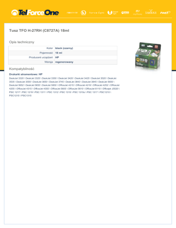Tusz TFO H-27RH (C8727A) 18ml Opis techniczny Kolor black (czarny) Pojemność 18 ml Producent urządzeń HP Wersja regenerowany Kompatybilność Drukarki atramentowe: HP DeskJet 3320 \ DeskJet 3325 \ DeskJet 3350 \ DeskJet 3420 \ DeskJet 3425 \ DeskJet 3520 \ DeskJet 3535 \ DeskJet 3550 \ DeskJet 3650 \ DeskJet 3745 \ DeskJet 3843 \ DeskJet 3845 \ DeskJet 5650 \ DeskJet 5652 \ DeskJet 5655 \ DeskJet 5850 \ OfficeJet 4215 \ OfficeJet 4219 \ OfficeJet 4252 \ OfficeJet 4255 \ OfficeJet 4315 \ OfficeJet 4355 \ OfficeJet 5605 \ OfficeJet 5610 \ OfficeJet 6110 \ Officejet J5520 \ PSC 1217 \ PSC 1219 \ PSC 1311 \ PSC 1312 \ PSC 1315 \ PSC 1315s \ PSC 1317 \ PSC1210 \ PSC1215 \ PSC1315