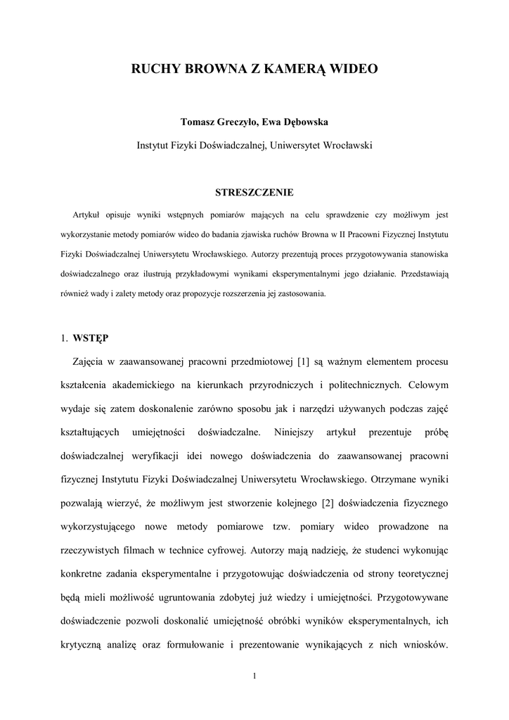 RUCHY BROWNA Z KAMER WIDEO Tomasz Greczyło, Ewa D bowska Instytut Fizyki Do wiadczalnej, Uniwersytet Wrocławski STRESZCZENIE Artykuł opisuje wyniki wst pnych pomiarów maj cych na celu sprawdzenie czy mo liwym jest ę ą Ŝ wykorzystanie metody pomiarów wideo do badania zjawiska ruchów Browna w II Pracowni Fizycznej Instytutu Fizyki Do wiadczalnej Uniwersytetu Wrocławskiego. Autorzy prezentuj proces przygotowywania stanowiska ś ą do wiadczalnego oraz ilustruj przykładowymi wynikami eksperymentalnymi jego działanie. Przedstawiaj ś ą ą równie wady i zalety metody oraz propozycje rozszerzenia jej zastosowania. Ŝ 1. WST P Zaj cia w zaawansowanej pracowni przedmiotowej [1] s wa nym elementem procesu kształcenia akademickiego na kierunkach przyrodniczych i politechnicznych. Celowym wydaje si zatem doskonalenie zarówno sposobu jak i narz dzi u ywanych podczas zaj kształtuj cych umiej tno ci do wiadczalne. Niniejszy artykuł prezentuje prób do wiadczalnej weryfikacji idei nowego do wiadczenia do zaawansowanej pracowni fizycznej Instytutu Fizyki Do wiadczalnej Uniwersytetu Wrocławskiego. Otrzymane wyniki pozwalaj wierzy , e mo liwym jest stworzenie kolejnego [2] do wiadczenia fizycznego wykorzystuj cego nowe metody pomiarowe tzw. pomiary wideo prowadzone na rzeczywistych filmach w technice cyfrowej. Autorzy maj nadziej , e studenci wykonuj c konkretne zadania eksperymentalne i przygotowuj c do wiadczenia od strony teoretycznej b d mieli mo liwo ugruntowania zdobytej ju wiedzy i umiej tno ci. Przygotowywane do wiadczenie pozwoli doskonali umiej tno krytyczn analiz obróbki wyników eksperymentalnych, ich oraz formułowanie i prezentowanie wynikaj cych z nich wniosków. 1 Do wiadczenie to umo liwi tak e wykorzystanie komputera oraz narz dzi programowych wspomagaj cych procesy do wiadczalne. 2. TEMATYKA I APARATURA Podstawy teoretyczne Posta Roberta Brown’a jest zazwyczaj kojarzona z ruchem drobin (pyłków ro linnych) rozpuszczonych w wodzie, które to ruchy biolog dostrzegł w 1828 roku. Niezale ne prace Mariana Smoluchowskiego i Alberta Einstein’a, prowadzone na pocz tku ubiegłego stulecia, rzuciły wiatło na przyczyny obserwowanego zachowania si drobin [3]. Je li rozwa amy jednowymiarowe bł dzenie przypadkowe [4] mo emy przyj , e jeden krok to jednostkowe przesuni cie: x1 = ± 1. Po dwóch krokach przesuni cie mo emy zapisa jako x2 = x1 ± 1, wówczas: x22 = x12 ± 2x1 + 1. Wiedz c, e <x1> = 0 i wyznaczaj c rednie <x22> otrzymujemy <x22> = <x12 > + 1 = 2. Kontynuuj c takie rozwa ania dla kolejnych kroków mo emy zapisa : <xN2> = N. W oparciu o teori kinetyczno-molekularn otrzyma analogiczny wynik wi dla przestrzeni trójwymiarowej mo na cy redni kwadrat przemieszczenia <r2> dla sferycznej cz stki, która jest bombardowana przez du o mniejsze molekuły, w ród których si znajduje, z czasem t: < r 2 > ave = RT t, 3πaηN A 2 (1) gdzie: R – stała gazowa, T – temperatura cieczy, a – rednica cz stki, η - współczynnik lepko ci cieczy, NA – stała Avogadro oraz t – czas obserwacji. Równanie to nosi nazw równania Einstein’a-Smoluchowskiego. W roku 1908 Jean Perrin potwierdził do wiadczalnie słuszno o wyniki do wiadczalne [5] wyznaczył warto tego równania i w oparciu stałej Avogadro, za co w roku 1926 otrzymał nagrod Nobla z fizyki. Idea do wiadczalna Wyznaczenie stałej Avogadro z wykorzystaniem prezentowanego poni ej zestawu pomiarowego jest mo liwe przy zało eniu, e znany jest współczynnik lepko cieczy , jej η temperatura T, oraz rednica a drobin w kształcie sfer. Dla przypadku dwóch wymiarów, z którym mamy do czynienia w opisywanym do wiadczeniu, równanie (1) przyjmuje posta : < r 2 > ave = RT t. 2πaηN A (2) Do wiadczenie przeprowadzono w temperaturze pokojowej, st d T=(293±1)K, natomiast współczynnik lepko ci u ytej cieczy wynosił =(1,00±0,05)N·s/m2, a rednia rednica drobin η w kształcie sfer a=(850±10)nm. Zjawisko ruchów Browna – ruchu male kich drobin zawiesiny w cieczy – jest najcz ciej u ywane do ilustrowania realno ci kinetyczno-molekularnego modelu budowy ciał [6]. Rzeczywiste ruchy Browna na przykładzie zawiesiny tłuszczu lub dymu papierosowego w cieczy cz sto prezentowane s podczas wykładów kursowych z fizyki. Autorzy uwa aj , e zastosowanie techniki pozwalaj cego na przeprowadzonych pomiarów ilo ciowe przez Jean wideo umo liwia badanie tego Perrin’a, stanowi przygotowanie zjawiska. do wiadczenia Powtórzenie doskonały temat pomiarów do wiadczenia studenckiego. Autorzy postanowili oceni mo liwo ci przygotowania do wiadczenia studenckiego przeprowadzaj c pomiary maj ce na celu wyznaczenie stałej Avogadro w oparciu o 3 obserwacje i pomiar poło enia kulek lateksowych o okre lonej rednicy w roztworze wodnym o znanej lepko ci. Planowane jest stworzenie w tym roku akademickim do wiadczenia studenckiego zatytułowanego Ruchy Browna. 3. ZESTAW POMIAROWY Do przygotowania zestawu pomiarowego autorzy wykorzystali aparatur znajduj c si w posiadaniu II Pracowni Fizycznej oraz Zakładu Nauczania Fizyki w IFD UWr. Składaj si na ni elementy widoczne na rysunku 1: Rys.1 Widok poszczególnych elementów zestawu pomiarowego 1. mikroskop optyczny BAD Carlzeiss Jena nr 469634 ze stołem pomiarowym umo liwiaj cy rejestrowanie powi kszonego obrazu – fabrycznie mikroskop przystosowany był do wykonywania zdj fotograficznych, ale został przystosowany do monta u kamery wideo; 2. analogowa, przemysłowa kamera wideo Unitra Polkolor TP-K16 rejestruj ca obraz czarno-biały; 3. monochromatyczny monitor Unitra WZT TWM-315 słu cy do precyzyjnej oceny ostro ci obrazu rejestrowanego przez kamer ; zastosowano monitor, gdy okno w programie słu cym do przechwytywania filmów wideo jest zbyt małe by dostatecznie precyzyjnie ustawi ostro obrazu; 4. zestaw komputerowy z systemem operacyjnym Windows 95 oraz oprogramowaniem edukacyjnym Coach 5, w skład którego wchodzi oprogramowanie do pomiarów wideo; 4 5. karta wideo miroVIDEO DC 10 (