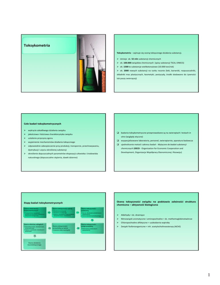 Toksykometria Toksykometria – zajmuje się oceną toksycznego działania substancji. istnieje ok. 52 mln substancji chemicznych ok. 100.000 związków chemicznych (spisy substancji TSCA, EINECS) ok. 1500 to substancje wielkotonażowe (10.000 ton/rok) ok. 2000 nowych substancji na rynku rocznie (leki, barwniki, rozpuszczalniki, składniki mas plastycznych, kosmetyki, pestycydy, środki dodawane do żywności lub paszy zwierzęcej) Cele badań toksykometrycznych wykrycie szkodliwego działania związku jakościowa i ilościowa charakterystyka związku ustalenie przyczyny zgonu badania toksykometryczne przeprowadzane są na zwierzętach i testach in vitro (względy etyczne) wyspecjalizowane laboratoria, personel, zwierzętarnie, aparatura badawcza wyjaśnienie mechanizmów działania toksycznego odpowiednie zabezpieczenie przy produkcji, transporcie, przechowywaniu, ujednolicenie metod i zakresu badań ‐ Wytyczne do badań substancji chemicznych (OECD ‐ Organization for Economic Cooperation and dystrybucji i użyciu określonej substancji Development, Organizacja Współpracy Ekonomicznej i Rozwoju) określenie dopuszczalnych parametrów ekspozycji człowieka i środowiska naturalnego (dopuszczalne stężenia, dawki dzienne) Ocena toksyczności związku na podstawie zależności struktura chemiczna – aktywność biologiczna Etapy badań toksykometrycznych Ocena właściwości fizykochemicznych • Porównanie ze związkami podobnymi (struktura chemiczna – aktywność biologiczna) Ocena toksyczności ostrej • Działania drażniącego • Działania uczulającego • Badania dodatkowe (drogi podania, toksykokinetyka, metabolizm) Ocena efektów odległych • Genotoksyczność, rakotwórczość, teratotwórczość • Wpływ na płodność, rozrodczość i potomstwo Ocena toksyczności przewlekłej w teście 2‐letnim (lub rocznym) Ocena toksyczności podostrej • 14, 21, 28 dni (przy powtarzanym dawkowaniu) • Ocena działania kumulatywnego Ocena toksyczności podprzewlekłej Aldehydy = dz. drażniące Nitrozwiązki aromatyczne i aminopochodne = dz. methemoglobinotwórcze Chloropochodne alifatyczne = uszkodzenia wątroby Związki fosforoorganiczne = inh. acetylocholinoesterazy (AChE) • 90 dni (przy powtarzanym dawkowaniu) Ocena działania neurotoksycznego 1 Ocena toksyczności związku na podstawie zależności struktura chemiczna – aktywność biologiczna Zależność aktywności działania toksycznego i kancerogennego od struktury chemicznej i właściwości fizykochemicznych związku (QSAR – quantitative structure activity relationship) Ocena toksyczności związku na podstawie zależności struktura chemiczna – aktywność biologiczna Ze wzrostem liczby atomów C w cząsteczce alkoholi alifatycznych rośnie siła ich narkotycznego działania (prawo Richardsona, 1869 r.), podobnie alkany, alkeny, chloropochodne węglowodory, ketony, estry. Budowa chemiczna Toksyczność węglowodorów alifatycznych rośnie ze wzrostem rozgałęzienia łańcucha Węglowodory nienasycone (benzen) są bardziej toksyczne niż nasycone Właściwości fizykochemiczne Aktywność chemiczna (cykloheksan) Aktywność biologiczna Ocena toksyczności związku na podstawie zależności struktura chemiczna – aktywność biologiczna Ocena toksyczności związku na podstawie zależności struktura chemiczna – aktywność biologiczna Toksyczność związków zwiększa się, gdy dodane podstawniki: Toksyczność związków zmniejsza się, gdy dodane podstawniki: ‐OH w związkach aromatycznych (fenol bardziej toksyczny niż benzen) ‐COOH w związkach łańcuchowych i pierścieniowych (zwiększa ‐NH2 dz. methemoglobinotwórcze ‐OH w związkach alifatycznych (glicerol bardzo mało toksyczny w porównaniu z propanolem) ‐CH3 w związkach pierścieniowych ‐NO2, ‐NO silne działanie utleniające ‐CN, ‐F prowadzi do syntezy letalnej rozpuszczalność i ułatwia wydalanie przez nerki) ‐SO3H zwiększa rozpuszczalność związków w wodzie, lepsze wydalanie przez nerki ‐SH, ‐CH3CO –CH3O –C2H5O, ‐N=N‐ Ocena toksyczności związku na podstawie zależności struktura chemiczna – aktywność biologiczna Właściwości fizykochemiczne wpływają na toksyczność (temperatura wrzenia benzenu 80oC, niższa niż homologów, np. toluenu, ksylenu), zbliżone wartości LD50 a ryzyko zatrucia benzenem największe Lipofilowość substancji (współczynnik podziału olej/woda) ‐ Łazariew, 1944 r. Ułatwia transport do receptora (przenikanie przez bariery lipidowe), ale nadmierna lipofilowość powoduje zatrzymanie substancji w pierwszej napotkanej warstwie lipidowej. Po / w Zwierzęta doświadczalne Zalecane stosowanie dwóch różnych gatunków zwierząt (jeden z nich nie może być gryzoniem), najczęściej myszy i szczury W szczególnych przypadkach koty, psy, naczelne, jednodniowe kurczęta, kury, pstrągi, świnki morskie , chomiki Używa się obu płci (wpływ hormonów i różna aktywność enzymów) Zwierzęta zdrowe, młode, dojrzałe płciowo, o zbliżonej masie ciała (+/‐ 10%), aklimatyzowane do warunków doświadczalnych min. 5 dni Stabilne warunki klimatyczne (temp. 23 oC, wilgotność wzgl. 30‐70 %), cykl Co Cw oświetlenia 12h/12h Swobodny dostęp do wody i karmy (kontrola zanieczyszczeń) Grupa kontrolna przebywa w tych samych warunkach 2 Drogi narażenia Ocena toksyczności ostrej Toksyczność ostra jest to zdolność substancji do wywołania efektu toksycznego po doustnie (p.o. ‐ per os) jej podaniu (wchłonięciu) do organizmu w dawce jednorazowej lub po inhalacyjnie (inh. ‐ inhalation) jednorazowym narażeniu. Toksyczność ostrą określa się ilościowo, wyznaczając dożylnie (i.v. ‐ via intervenosa) LD50 powodującą śmierć 50% zwierząt użytych w doświadczeniu. skórnie (cutanous, derm) podskórnie (s.c. ‐ via subcutanea) Daje odpowiedź na pytania: naskórnie (p.c. ‐ via percutanea) 1. Jaka jest dawka potrzebna, aby zwierzę padło? domię