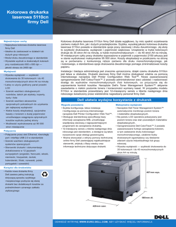 Kolorowa drukarka laserowa 5110cn firmy Dell Najważniejsze cechy • Najszybsza kolorowa drukarka laserowa firmy Dell • Idealna do zastosowań w działach lub dużych grup roboczych • Moduł druku dwustronnego w standardzie • Wyraziste wydruki w doskonałych kolorach przy rozdzielczości 600 x 600 dpi — jakość obrazu do 2400 dpi Wydajność • Wysoka wydajność — szybkość drukowania do 35 kolorowych i do 40 monochromatycznych stron A4 na minutę • Łatwy w użyciu graficzny panel przedni LCD • Szeroki wachlarz obsługiwanych nośników, takich jak etykiety, koperty, karty i folie • Szeroki wachlarz akcesoriów opcjonalnych potrzebnych do uzyskania jak najlepszej wydajności • Niskie koszty eksploatacji, opcjonalne kasety z tonerem o dużej pojemności umożliwiające osiągnięcia optymalnych kosztów wydruku jednej strony • Możliwość wydrukowania aż 95 000 stron miesięcznie Połączenia • Połączenie przez sieć Ethernet, równoległy port i interfejs USB 2.0 w standardzie • Szeroki wachlarz obsługiwanych systemów operacyjnych • Sterowniki drukarki i dokumentacja zlokalizowana w 12 językach europejskich (angielski, francuski, włoski, niemiecki, hiszpański, duński, holenderski, fiński, norweski, polski, portugalski i szwedzki) Kolorowa drukarka laserowa 5110cn firmy Dell działa wyjątkowo, by móc spełnić oczekiwania zarówno małych firm, jak i dużych przedsiębiorstw. Szybka, wysokiej jakości kolorowa drukarka laserowa 5110cn posiada w standardzie opcje pracy sieciowej i druku dwustronnego. Jej atuty to szybkość drukowania, wydajność i pojemność wejściowa. Urządzenie w trybie kolorowym drukuje do 35 stron A4 na minutę, w trybie monochromatycznym — do 40 stron A4 na minutę. W miesięcznym cyklu pracy drukarka wyposażona w pojemnik o pojemności 2150 arkuszy jest w stanie wydrukować maksymalnie 95 000 stron. Koszty eksploatacji w przeliczeniu na stronę są w porównaniu z konkurencją niższe zarówno dla druku monochromatycznego, jak i kolorowego, a standardowa opcja drukowania dwustronnego pomaga zminimalizować koszty papieru. Instalacja i bieżąca administracja jest znacznie uproszczona, dzięki czemu drukarka 5110cn jest łatwa w obsłudze. Drukarki sieciowe firmy Dell można obsługiwać zdalnie za pomocą internetowego narzędzia Dell Printer Configuration Web Tool™. Nowe zaawansowane oprogramowanie Dell ColourTrack™ 2 pozwala administratorowi sieci udzielać i nadzorować dostęp do wydruków monochromatycznych i/lub kolorowych, co przyczynia się do usprawnienia kontroli kosztów. Narzędzie Dell’s Toner Management System™ aktywnie zawiadamia o niskim poziomie tonera i konieczności wymiany kaset. W przypadku modelu 5110cn w standardzie przewidziany jest 12-miesięczny serwis u klienta następnego dnia roboczego świadczony przez wielokrotnie nagradzany personel firmy Dell. Dell ułatwia wydajne korzystanie z drukarek Wygoda posiadania • Szybka konfiguracja, łatwa instalacja i konfiguracja za pomocą internetowego narzędzia Dell Printer Configuration Web Tool™. • Obsługuje standardową specyfikację bazy informacji zarządzania MIB, umożliwiając współpracę sieciową z najpopularniejszymi programami do zarządzania drukarką. • 12-miesięczny serwis u klienta następnego dnia roboczego jest standardem, a dostępne są także rozszerzone opcje obsługi gwarancyjnej. • Można skorzystać z witryny pomocy technicznej online firmy Dell zawierającej najaktualniejsze sterowniki, artykuły z Bazy wiedzy oraz informacje techniczne dotyczące drukarki. Korzyści dla środowiska • Każda nowa drukarka firmy Dell zawiera pełną instrukcję dotyczącą sposobu szybkiego i bezpiecznego pozbycia się starej drukarki bez dodatkowych kosztów za pośrednictwem uznanego zakładu utylizacyjnego Maksymalna wydajność • Narzędzie Dell Toner Management System™ automatycznie monitoruje poziom tonera i materiałów eksploatacyjnych. • Na panelu LCD operatora pokazywany jest poziom tonera oraz stan pozostałych materiałów eksploatacyjnych. • Oprogramowanie Dell ColorTrack™ 2 posiada zaawansowane funkcje zarządzania kolorem, w tym zadawanie druku kolorowego/ monochromatycznego, ustalenie liczby drukowanych egzemplarzy czy śledzenie zdarzeń użycia indywidualnego lub grupy roboczej. • Wysoka wydajność — szybkość drukowania do 35 kolorowych i do 40 monochromatycznych stron A4 na minutę. 497 mm wys. 580 mm dł. 429 mm szer. ODWIEDŹ WITRYNĘ WWW.EURO.DELL.COM, ABY UZYSKAĆ WIĘCEJ INFORMACJI. Kolorowa drukarka laserowa 5110cn firmy Dell Cechy Opis produktu Dane techniczne drukarki Szybkość druku1 Czas oczekiwania na pierwszą stronę Rozdzielczość wydruku Interfejs użytkownika Strumienie danych Procesor Pamięć (RAM) Rozszerzenie pamięci Pamięć dyskowa drukarki Cykl pracy Typowe miesięczne obciążenie drukarki Obsługa papieru Standardowe źródła wejściowe Dodatkowe szuflady wejściowe Maksymalna pojemność podajnika papieru Moduł druku dwustronnego Maksymalna pojemność wyjściowa Obsługiwane rodzaje nośników Podajnik wielofunkcyjny Standardowa szuflada na 500 arkuszy Opcjonalna szuflada na 500 arkuszy Opcjonalna szuflada na 1000 arkuszy Moduł druku dwustronnego Opcje układu stron Obszar wydruku Krawędź marginesów strony Połączenia Interfejsy Języki i czcionki Klienckie systemy operacyjne Sieciowe systemy operacyjne Protokoły sieciowe Opcje łączności bezprzewodowej Materiały eksploatacyjne Zarządzanie tonerem Pojemność kaset z tonerem w opakowaniu3 Opis Szybka kolorowa drukarka laserowa przystosowana do pracy w sieci dla działów lub grup roboczych Do 35 kolorowych i do 40 monochromatycznych stron A4 na minutę przy rozdzielczości 600 x 600 dpi W trybie gotowości (Simplex, format A4, 600 dpi, wydruk monochromatyczny lub kolorowy) 16 sekund lub mniej. W trybie oszczędzania energii (Simplex, format A4, 600 dpi, wydruk monochromatyczny lub kolorowy)