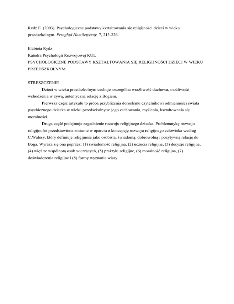 Rydz E. (2003). Psychologiczne podstawy kształtowania się religijności dzieci w wieku przedszkolnym. Przegląd Homiletyczny, 7, 213-226. Elżbieta Rydz Katedra Psychologii Rozwojowej KUL PSYCHOLOGICZNE PODSTAWY KSZTAŁTOWANIA SIĘ RELIGIJNOŚCI DZIECI W WIEKU PRZEDSZKOLNYM STRESZCZENIE Dzieci w wieku przedszkolnym cechuje szczególna wrażliwość duchowa, możliwość wchodzenia w żywą, autentyczną relację z Bogiem. Pierwsza część artykułu to próba przybliżenia dorosłemu czytelnikowi odmienności świata psychicznego dziecka w wieku przedszkolnym: jego zachowania, myślenia, kształtowania się moralności. Druga część podejmuje zagadnienie rozwoju religijnego dziecka. Problematykę rozwoju religijności przedstawiona zostanie w oparciu o koncepcję rozwoju religijnego człowieka według C.Walesy, który definiuje religijność jako osobistą, świadomą, dobrowolną i pozytywną relację do Boga. Wyraża się ona poprzez: (1) świadomość religijna, (2) uczucia religijne, (3) decyzje religijne, (4) więź ze wspólnotą osób wierzących, (5) praktyki religijne, (6) moralność religijna, (7) doświadczenia religijne i (8) formy wyznania wiary. Elżbieta Rydz PSYCHOLOGICZNE PODSTAWY KSZTAŁTOWANIA SIĘ RELIGIJNOŚCI DZIECI W WIEKU PRZEDSZKOLNYM W rozmowach z młodzieżą i osobami dorosłymi, w których opowiadają nam one „dzieje” swojej religijności, czy też najważniejsze momenty swojego życia religijnego, pojawiają się często wspomnienia z wczesnego dzieciństwa: żywa atmosfera świąt Bożego Narodzenia czy Wielkanocy, ich niepowtarzalne piękno, niemal wyczuwalna obecność Boga. Dorośli wspominają nie tylko wiele szczegółów, które utkwiły im w pamięci (zapach siana na stole wigilijnym, skrzypienie śniegu w drodze na Pasterkę, tajemnicze światła w półmroku kościoła, aniołka, który skinieniem głowy dziękował za drobne monety wrzucane dla ubogich, który naprawdę miał żywe oczy i naprawdę patrzył na dziecko z wdzięcznością, różne szelesty i szmery napełniające Kościół, jakaś niepowtarzalna atmosfera skupienia, jednocześnie lęku i fascynacji, potem nieoczekiwana ulga i ogromna radość przy śpiewaniu kolęd). Wspomnieniom tym towarzyszy szczególne przekonanie o ich realności. Pamiętamy, że wierzyliśmy całym sercem, bez poddawania w jakąkolwiek wątpliwość, w przekazywane nam treści religijne. Opisy te wskazują na szczególną wrażliwość duchową dzieci (Augustyn 2002), na możliwość wchodzenia w żywą i dynamiczną relację z Bogiem już od najwcześniejszych okresów życia (Walesa 2003). „Rodzice nie zawsze są świadomi niezwykłej otwartości duchowej dzieci, Rzeczywistość duchowa i religijna jest dla dziecka czymś naturalnym i spontanicznym. Dziecko ufnie przyjmuje nawet najtrudniejsze prawdy wiary jako pewną oczywistość. Jest tylko jeden warunek: musi być ono świadkiem takiej samej otwartości swoich rodziców na sprawy duchowe.” (Augustyn 2002, s. 39). 1. Podstawy kształtowania religijności ludzkiej Czym jest religijność człowieka? Religijność człowieka definiuje się jako osobistą, świadomą , dobrowolną i pozytywną relacją do Boga (Walesa 1980, 1989, 1992, 2003 ). Rozwija się ona w oparciu o pozytywne relacje dziecka z najbliższymi osobami. Małe dziecko, od poczęcia, pozostaje w ścisłej interakcji z matką. Matki, nosząc dziecko w swoim łonie i wyczuwając jego ruchy, stwierdzają coś, co w psychologii prenatalnej nazwano synchronią interakcyjną: gdy one są aktywne, spacerują, pracują – dziecko nie przejawia większej aktywności, często śpi, ukołysane ruchem, natomiast w czasie wypoczynku kobiety – dziecko uaktywnia się, wykonuje cały szereg ruchów. Od poczęcia jest ono w głębokiej relacji do drugiego człowieka. Jest to pierwszy, niewerbalny dialog dwóch najbliższych istot. Jeszcze przed narodzeniem cała maleńka istota jest w aktywnej interakcji. Dialog ten kontynuowany jest po urodzeniu dziecka na głębszych, bogatszych, bardziej różnorodnych płaszczyznach: wzrokowej, dotykowej, słuchowej. Interesujące jest, że matka uprzedza rozwój dziecka, wytycza mu strefę najbliższego rozwoju: mówi do niego, pomimo, że ono nie rozumie jeszcze słów. Dziecko uczy się komunikacji na poziomie: wyrażanych emocji (pozytywnych, negatywnych), intonacji głosu, melodyki języka, którym posługuje się matka. Maleńkie dziecko jest nie tylko biernym odbiorcą tych komunikatów, reagującym jedynie na inicjatywy ze strony dorosłego. Ono samo inicjuje kontakt, uśmiechając się, wydając różne nieartykułowane dźwięki, gaworząc. Jego potrzeba „bycia w relacji”, to przede wszystkim potrzeba relacji emocjonalnej, doznawania opieki, troski, czynności pielęgnacyjnych, mówienia do niego – wykonywanych z uczuciem miłości. W tego typu relacji uczy się ono ufnego przywiązania, które zaowocuje poczuciem bezpieczeństwa w relacjach z innymi, towarzyszącym mu przez całe życie. Dziecko, które przy czynnościach pielęgnacyjnych nie doświadcza przepływu pozytywnych emocji – popada w apatię, reaguje wrogością lub całkowitą obojętnością na obecność osoby dorosłej, sprawującej nad nią opiekę (Ainsworth, Bowlby, za: Harwas-Napierała, Trempała 2000). Warto o tym pamiętać, wchodząc w relację z drugim człowiekiem z dwóch powodów: po pierwsze, patrząc na czyjąś nieufność, obojętność czy wrogość, należy zastanowić się, czy jego potrzeba miłości, przywiązania nie została zraniona w bardzo wczesnym dzieciństwie, co odebrało mu poczucie bezpieczeństwa, nadzieję, zamknęła go na pozytywną relację z drugim człowiekiem, blokując automatycznie jego relację do Boga; po drugie, wchodząc w kontakt z człowiekiem na każdym etapie rozwoju ontogenetycznego, osobowego, szczególnie wchodząc w kontakt z dzieckiem, pamiętajmy, że tworzymy przestrzeń jego rozwoju (strefę najbliższego rozwoju)