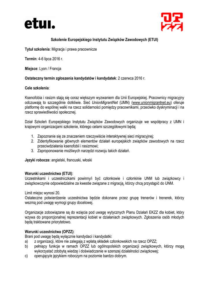 Szkolenie Europejskiego Instytutu Związków Zawodowych (ETUI) Tytuł szkolenia: Migracja i prawa pracownicze Termin: 4-6 lipca 2016 r. Miejsce: Lyon / Francja Ostateczny termin zgłoszenia kandydatów i kandydatek: 2 czerwca 2016 r. Cele szkolenia: Ksenofobia i rasizm stają się coraz większym wyzwaniem dla Unii Europejskiej. Pracownicy migracyjny odczuwają to szczególnie dotkliwie. Sieć UnionMigrantNet (UMN) (www.unionmigrantnet.eu) oferuje platformę do wspólnej walki na rzecz solidarności pomiędzy pracownikami, przeciwko dyskryminacji i na rzecz sprawiedliwości społecznej. Dział Szkoleń Europejskiego Instytutu Związków Zawodowych organizuje we współpracy z UMN i krajowymi organizacjami szkolenie, którego celami szczegółowymi będą: 1. Zapoznanie się ze znaczeniem rzeczywiście interaktywnej sieci migracyjnej; 2. Zidentyfikowanie głównych elementów działań europejskich związków zawodowych na rzecz przeciwdziałania ksenofobii i rasizmowi; 3. Zaproponowanie możliwych narzędzi rozwoju takich działań. Języki robocze: angielski, francuski, włoski Warunki uczestnictwa (ETUI): Uczestnikami i uczestniczkami powinny/i być członkowie i członkinie UNM lub związkowcy i związkowczynie odpowiedzialne za kwestie związane z migracją, którzy chcą przystąpić do UNM. Limit miejsc wynosi 20. Ostateczne potwierdzenie uczestnictwa będzie dokonane przez grupę trenerów i trenerek, którzy wezmą pod uwagę wymogi grupy docelowej. Organizacje zobowiązane są do wzięcia pod uwagę wytycznych Planu Działań EKZZ dla kobiet, który wzywa do proporcjonalnej reprezentacji kobiet w działaniach związkowych. Zgłoszenia osób młodych będą traktowane priorytetowo. Warunki uczestnictwa (OPZZ): Brani pod uwagę będą wyłącznie kandydaci i kandydatki: a) z organizacji, które nie zalegają z wpłatą składek członkowskich na rzecz OPZZ; b) pełniący funkcje w ramach OPZZ lub ogólnopolskich organizacji związkowych, którzy mogą wykorzystać zdobytą wiedzę i doświadczenie w szerszej działalności związkowej; c) operujący/e językiem roboczym na poziomie bardzo dobrym. Organizacja zgłaszająca kandydata / kandydatkę jest zobowiązana do wpłaty kwoty wpisowego na konto OPZZ. Koszty: Wpisowe wynosi 500 PLN, którą – podobnie jak koszt diety zagranicznej – w całości pokrywa organizacja członkowska OPZZ (tj. zgłaszająca do OPZZ swojego kandydata / kandydatkę). Koszty podróży są refundowane. Koszty zakwaterowania i wyżywienia są pokrywane przez organizatorów. Informacje dodatkowe: Zgłoszenia przyjmujemy wyłącznie za pośrednictwem ogólnokrajowej organizacji członkowskiej OPZZ lub rady wojewódzkiej OPZZ. Zgłoszenie powinno zawierać: imię i nazwisko kandydata / kandydatki oraz pełnione funkcje, nazwę i adres (również internetowy) organizacji rekomendującej, adres e-mail kandydata / kandydatki, telefon kontaktowy kandydata / kandydatki, znajomość języków obcych (jakie?, w jakim stopniu?) doświadczenie w pracy projektowej i zarządzaniu projektami Osobą kontaktową w sprawach szkoleń ETUI jest kol. Dominika Pyzowska (kom.: 603 192 204, e-mail: [email protected]).
