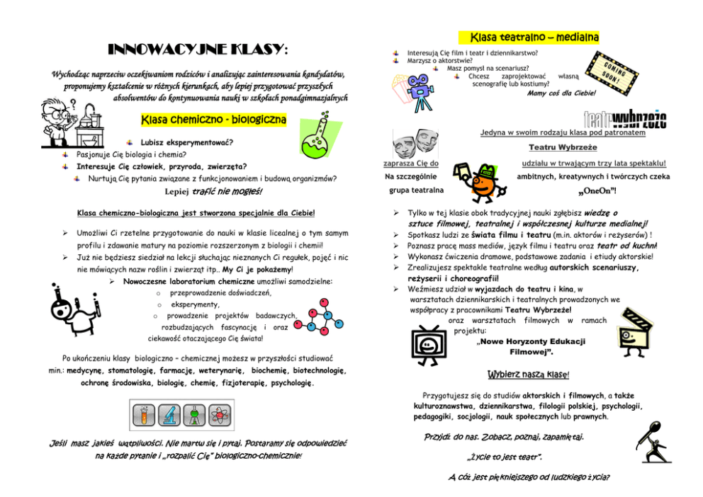 Klasa teatralno – medialna INNOWACYJNE KLASY: Interesują Cię film i teatr i dziennikarstwo? Marzysz o aktorstwie? Masz pomysł na scenariusz? Chcesz zaprojektować scenografię lub kostiumy? Wychodząc naprzeciw oczekiwaniom rodziców i analizując zainteresowania kandydatów, proponujemy kształcenie w różnych kierunkach, aby lepiej przygotować przyszłych absolwentów do kontynuowania nauki w szkołach ponadgimnazjalnych własną Mamy coś dla Ciebie! Klasa chemiczno - biologiczna Jedyna w swoim rodzaju klasa pod patronatem Lubisz eksperymentować? Teatru Wybrzeże Pasjonuje Cię biologia i chemia? Interesuje Cię człowiek, przyroda, zwierzęta? Nurtują Cię pytania związane z funkcjonowaniem i budową organizmów? Lepiej trafić nie mogłeś! udziału w trwającym trzy lata spektaklu! Na szczególnie ambitnych, kreatywnych i twórczych czeka Klasa chemiczno-biologiczna jest stworzona specjalnie dla Ciebie! Umożliwi Ci rzetelne przygotowanie do nauki w klasie licealnej o tym samym Już nie będziesz siedział na lekcji słuchając nieznanych Ci regułek, pojęć i nic nie mówiących nazw roślin i zwierząt itp.. My Ci je pokażemy! Nowoczesne laboratorium chemiczne umożliwi samodzielne: o przeprowadzenie doświadczeń, o eksperymenty, o prowadzenie rozbudzających projektów badawczych, fascynację „OneOn”! grupa teatralna profilu i zdawanie matury na poziomie rozszerzonym z biologii i chemii! zaprasza Cię do i oraz ciekawość otaczającego Cię świata! Po ukończeniu klasy biologiczno – chemicznej możesz w przyszłości studiować min.: medycynę, stomatologię, farmację, weterynarię, biochemię, biotechnologię, ochronę środowiska, biologię, chemię, fizjoterapię, psychologię. Tylko w tej klasie obok tradycyjnej nauki zgłębisz wiedzę o sztuce filmowej, teatralnej i współczesnej kulturze medialnej! Spotkasz ludzi ze świata filmu i teatru (m.in. aktorów i reżyserów) ! Poznasz pracę mass mediów, język filmu i teatru oraz teatr od kuchni! Wykonasz ćwiczenia dramowe, podstawowe zadania i etiudy aktorskie! Zrealizujesz spektakle teatralne według autorskich scenariuszy, reżyserii i choreografii! Weźmiesz udział w wyjazdach do teatru i kina, w warsztatach dziennikarskich i teatralnych prowadzonych we współpracy z pracownikami Teatru Wybrzeże! oraz warsztatach filmowych w ramach projektu: „Nowe Horyzonty Edukacji Filmowej”. Wybierz naszą klasę! Przygotujesz się do studiów aktorskich i filmowych, a także kulturoznawstwa, dziennikarstwa, filologii polskiej, psychologii, pedagogiki, socjologii, nauk społecznych lub prawnych. Jeśli masz jakieś wątpliwości. Nie martw się i pytaj. Postaramy się odpowiedzieć na każde pytanie i „rozpalić Cię” biologiczno-chemicznie! Przyjdź do nas. Zobacz, poznaj, zapamiętaj. „Życie to jest teatr”. A cóż jest piękniejszego od ludzkiego życia? Klasa matematyczno-fizyczna To klasa dla osób, które wiążą swoją przyszłość z naukami ścisłymi. Ten profil ułatwi Ci dalszą naukę w celu zdobycia wykształcenia, na które jest aktualnie największe zapotrzebowanie na rynku pracy. Jeśli chcesz: mieć możliwość nauki matematyki i fizyki w zakresie rozszerzonym, o zwiększonej ilości godzin z wykorzystaniem technik multimedialnych, mieć szansę na zdobycie wiedzy wykraczającej poza program gimnazjum, czego efektem będzie dobre przygotowanie do nauki w szkole średniej, dzięki współpracy ze szkołami licealnymi sprawdzić swoje uzdolnienia i predyspozycje, biorąc udział w konkursach matematycznych, fizycznych i projektach edukacyjnych Nowopowstała nowoczesna pracownia fizyczna umożliwi ci samodzielne przeprowadzania doświadczeń i eksperymentów To klasa dla Ciebie! Nauka w tej klasie dobrze przygotuje Cię do studiowania na wielu uczelniach oferujących kształcenie w kierunkach inżynierskich, ekonomicznych i przyrodniczych. Klasa językowa z rozszerzoną nauką j. angielskiego Zabytkowa szkoła o bogatej tradycji Przyjdź! Zobacz! Przekonaj się! Chcesz dobrze zdać egzamin gimnazjalny z angielskiego? A może masz zamiar za kilka lat wyjechać za granicę? Chcesz zdobyć świetną pracę? A może oglądać filmy bez lektora i napisów? Nie musisz już płacić za kurs w szkole językowej! My uczymy za darmo! W klasie językowej przez 5 godzin tygodniowo uczymy, słuchać, czytać i pisać po angielsku w nowoczesnej pracowni językowej! Będziesz miał okazję ćwiczyć rozmówki, odtwarzać prawdziwe sytuacje życiowe, słuchać różnych rodzajów wypowiedzi, czytać ze zrozumieniem. Nauczysz się jak pisać e-maile, listy lub notatki po angielsku. Poznasz kulturę krajów anglojęzycznych- poprzez cyklicznie organizowane wycieczki zagraniczne do Wielkiej Brytanii i innych krajów, Weźmiesz udział w warsztatach językowych Euroweek! Klasa językowa to szansa na doskonalenie języka i poznawanie świata! TA SZKOŁA MOŻE BYĆ TWOJĄ SZKOŁĄ! Zapraszamy na Dzień Otwarty 21 marca 2016r.o godz. 9.00 Szczegółowe informacje o warunkach naboru: http://www.g1.malbork.pl/oraz w sekretariacie Gimnazjum nr 1; ul. Żeromskiego 45, 82-200 Malbork; tel. 55 272 25 11