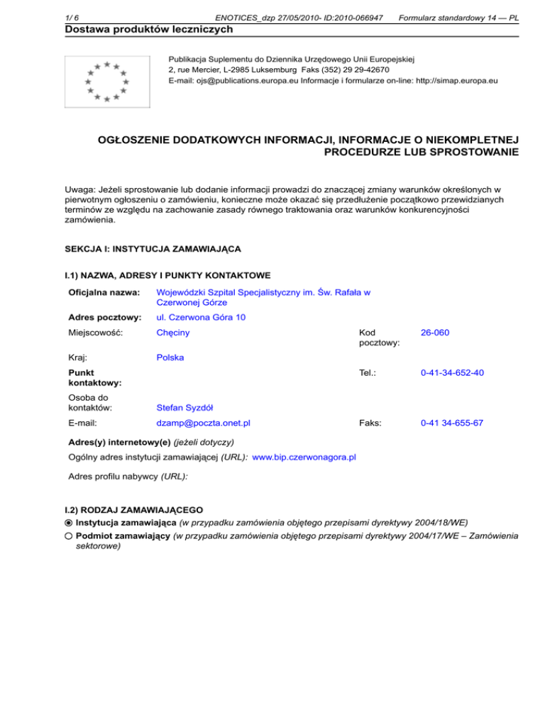 1/ 6 ENOTICES_dzp 27/05/2010- ID:2010-066947 Dostawa produktów leczniczych Formularz standardowy 14 — PL Publikacja Suplementu do Dziennika Urzędowego Unii Europejskiej 2, rue Mercier, L-2985 Luksemburg Faks (352) 29 29-42670 E-mail: [email protected] Informacje i formularze on-line: http://simap.europa.eu OGŁOSZENIE DODATKOWYCH INFORMACJI, INFORMACJE O NIEKOMPLETNEJ PROCEDURZE LUB SPROSTOWANIE Uwaga: Jeżeli sprostowanie lub dodanie informacji prowadzi do znaczącej zmiany warunków określonych w pierwotnym ogłoszeniu o zamówieniu, konieczne może okazać się przedłużenie początkowo przewidzianych terminów ze względu na zachowanie zasady równego traktowania oraz warunków konkurencyjności zamówienia. SEKCJA I: INSTYTUCJA ZAMAWIAJĄCA I.1) NAZWA, ADRESY I PUNKTY KONTAKTOWE Oficjalna nazwa: Wojewódzki Szpital Specjalistyczny im. Św. Rafała w Czerwonej Górze Adres pocztowy: ul. Czerwona Góra 10 Miejscowość: Chęciny Kraj: Polska Punkt kontaktowy: Osoba do kontaktów: Stefan Syzdół E-mail: [email protected] Kod pocztowy: 26-060 Tel.: 0-41-34-652-40 Faks: 0-41 34-655-67 Adres(y) internetowy(e) (jeżeli dotyczy) Ogólny adres instytucji zamawiającej (URL): www.bip.czerwonagora.pl Adres profilu nabywcy (URL): I.2) RODZAJ ZAMAWIAJĄCEGO Instytucja zamawiająca (w przypadku zamówienia objętego przepisami dyrektywy 2004/18/WE) Podmiot zamawiający (w przypadku zamówienia objętego przepisami dyrektywy 2004/17/WE – Zamówienia sektorowe) 2/ 6 ENOTICES_dzp 27/05/2010- ID:2010-066947 Dostawa produktów leczniczych Formularz standardowy 14 — PL SEKCJA II: PRZEDMIOT ZAMÓWIENIA II.1) OPIS II.1.1) Nazwa nadana zamówieniu przez instytucję zamawiającą (podano w pierwotnym ogłoszeniu) Dostawa produktów leczniczych II.1.2) Krôtki opis (podano w pierwotnym ogłoszeniu) Dostawa produktów leczniczych. Zamówienie powyżej 193 000 Euro II.1.3) Wspólny Słownik Zamówień (CPV) (podano w pierwotnym ogłoszeniu) Słownik główny Główny przedmiot 33600000 Dodatkowe przedmioty 33141500 Słownik uzupełniający (jeżeli dotyczy) 3/ 6 ENOTICES_dzp 27/05/2010- ID:2010-066947 Dostawa produktów leczniczych Formularz standardowy 14 — PL SEKCJA IV: PROCEDURA IV.1) RODZAJ PROCEDURY IV.1.1) Rodzaj procedury (podano w pierwotnym ogłoszeniu) Otwarta Ograniczona Ograniczona przyspieszona Negocjacyjna Negocjacyjna przyspieszona Dialog konkurencyjny IV.2) INFORMACJE ADMINISTRACYJNE IV.2.1) Numer referencyjny nadany sprawie przez instytucję zamawiającą /podmiot zamawiający (podano w pierwotnym ogłoszeniu, o ile dotyczy) DZ-169-2010 IV.2.2) Dane referencyjne ogłoszenia w przypadku ogłoszeń przesłanych drogą elektroniczną (jeżeli są znane): Pierwotne ogłoszenie przesłane przez: SIMAP OJS eSender Login: ENOTICES_dzp Dane referencyjne ogłoszenia: 2010-057348 (rok i numer dokumentu) IV.2.3) Ogłoszenie, którego dotyczy niniejsza publikacja (jeżeli dotyczy) Numer ogłoszenia w Dz.U.: 2010/S 91-136389 z dnia 11/05/2010 IV.2.4) Data wysłania niniejszego ogłoszenia: 06/05/2010 (dd/mm/rrrr) (dd/mm/rrrr) 4/ 6 ENOTICES_dzp 27/05/2010- ID:2010-066947 Formularz standardowy 14 — PL Dostawa produktów leczniczych SEKCJA VI: INFORMACJE UZUPEŁNIAJĄCE VI.1) OGŁOSZENIE DOTYCZY (o ile ma zastosowanie; zaznaczyć tyle punktów, ile jest to konieczne) Procedury niepełnej Sprostowania Informacji dodatkowych VI.2) INFORMACJE NA TEMAT NIEPEŁNEJ PROCEDURY UDZIELENIA ZAMÓWIENIA (o ile ma zastosowanie; zaznaczyć tyle punktów, ile jest to konieczne) Postępowanie o udzielenie zamówienia została przerwane. Postępowanie o udzielenie zamówienia uznano za nieskuteczne. Zamówienia nie udzielono. Zamówienie może być przedmiotem ponownej publikacji. Wszystkich części Jednej lub więcej części VI.3) INFORMACJE DO POPRAWIENIA LUB DODANIA (o ile dotyczy; należy określić miejsce, w którym tekst lub daty mają być zmienione lub dodane, proszę zawsze podawać odpowiedni numer sekcji i akapitu pierwotnego ogłoszenia) VI.3.1) Zmiana oryginalnej informacji lub publikacja w witrynie TED niezgodna z oryginalnymi informacjami. Zmiana oryginalnej informacji podanej przez instytucję zamawiającą Publikacja w witrynie TED niezgodna z oryginalną informacją, przekazaną przez instytucję zamawiającą W obu przypadkach VI.3.2) Ogłoszenie lub odpowiednia dokumentacja przetargowa W ogłoszeniu pierwotnym W odpowiedniej dokumentacji przetargowej (więcej informacji w odpowiedniej dokumentacji przetargowej) W obu przypadkach (więcej informacji w odpowiedniej dokumentacji przetargowej) VI.3.3) Tekst, który należy poprawić w pierwotnym ogłoszeniu (jeżeli dotyczy) Miejsce, w którym znajduje się zmieniany tekst: Zamiast: Powinno być: Informacje na temat części zamówienia Brak części nr 23 Brak części nr 24 Nazwa Zadanie nr 23 1) Krótki opis Dostawa produktów leczniczych 2) Wspólny słownik zamówień (CPV) 33600000, 33141500 3) Wielkość lub zakres 4) Wskazanie innej daty rozpoczęcia zamówienia i/lub czasu trwania zamówienia Termin wykonania zamówienia do dnia 15.07.2011 Nazwa Zadanie nr 24 1) Krótki opis Dostawa produktów leczniczych 2) Wspólny słownik zamówień 5/ 6 ENOTICES_dzp 27/05/2010- ID:2010-066947 Formularz standardowy 14 — PL Dostawa produktów leczniczych Miejsce, w którym znajduje się zmieniany tekst: Zamiast: Powinno być: (CPV) 33600000, 33141500 3) Wielkość lub zakres 4) Wskazanie innej daty rozpoczęcia zamówienia i/lub czasu trwania zamówienia Termin wykonania zamówienia do dnia 15.07.2011 III.1.1) Wymagane wadia i gwarancje Brak zadania 23 Brak zadania 24 Zadanie nr 23 - 200,00 PLN Zadanie nr 24 - 600,00 PLN III.2.2) Zdolność ekonomiczna i finansowa Zadanie nr 1 - 805 000,00 PLN Brak zadania 23 Brak zadania 24 Zadanie nr 1 - 770 000,00 PLN Zadanie nr 23 - 7 000,00 PLN Zadanie nr 24 - 23 000,00 PLN III.2.3) Zdolność techniczna Zadanie nr 1 - 860 000,00 PLN Brak zadania 23 Brak zadania 24 Zadanie nr 1 - 830 000,00 PLN Zadanie nr 