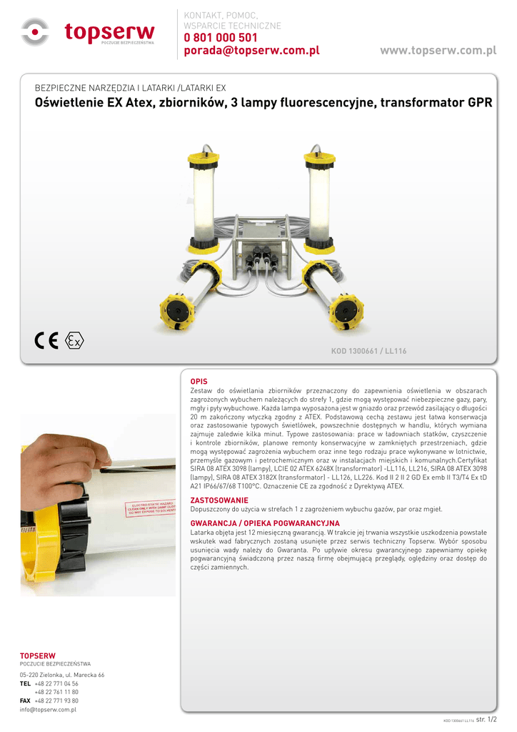 KONTAKT, POMOC, WSPARCIE TECHNICZNE 0 801 000 501 [email protected] www.topserw.com.pl BEZPIECZNE NARZĘDZIA I LATARKI /LATARKI EX Oświetlenie EX Atex, zbiorników, 3 lampy fluorescencyjne, transformator GPR KOD 1300661 / LL116 OPIS Zestaw do oświetlania zbiorników przeznaczony do zapewnienia oświetlenia w obszarach zagrożonych wybuchem należących do strefy 1, gdzie mogą występować niebezpieczne gazy, pary, mgły i pyły wybuchowe. Każda lampa wyposażona jest w gniazdo oraz przewód zasilający o długości 20 m zakończony wtyczką zgodny z ATEX. Podstawową cechą zestawu jest łatwa konserwacja oraz zastosowanie typowych świetlówek, powszechnie dostępnych w handlu, których wymiana zajmuje zaledwie kilka minut. Typowe zastosowania: prace w ładowniach statków, czyszczenie i kontrole zbiorników, planowe remonty konserwacyjne w zamkniętych przestrzeniach, gdzie mogą występować zagrożenia wybuchem oraz inne tego rodzaju prace wykonywane w lotnictwie, przemyśle gazowym i petrochemicznym oraz w instalacjach miejskich i komunalnych.Certyfikat SIRA 08 ATEX 3098 (lampy), LCIE 02 ATEX 6248X (transformator) -LL116, LL216, SIRA 08 ATEX 3098 (lampy), SIRA 08 ATEX 3182X (transformator) - LL126, LL226. Kod II 2 II 2 GD Ex emb II T3/T4 Ex tD A21 IP66/67/68 T100°C. Oznaczenie CE za zgodność z Dyrektywą ATEX. ZASTOSOWANIE Dopuszczony do użycia w strefach 1 z zagrożeniem wybuchu gazów, par oraz mgieł. GWARANCJA / OPIEKA POGWARANCYJNA Latarka objęta jest 12 miesięczną gwarancją. W trakcie jej trwania wszystkie uszkodzenia powstałe wskutek wad fabrycznych zostaną usunięte przez serwis techniczny Topserw. Wybór sposobu usunięcia wady należy do Gwaranta. Po upływie okresu gwarancyjnego zapewniamy opiekę pogwarancyjną świadczoną przez naszą firmę obejmującą przeglądy, oględziny oraz dostęp do części zamiennych. TOPSERW POCZUCIE BEZPIECZEŃSTWA 05-220 Zielonka, ul. Marecka 66 TEL +48 22 771 04 56 +48 22 761 11 80 FAX +48 22 771 93 80 [email protected] KOD 1300661 LL116 str. 1/2 KONTAKT, POMOC, WSPARCIE TECHNICZNE 0 801 000 501 [email protected] www.topserw.com.pl BEZPIECZNE NARZĘDZIA I LATARKI /LATARKI EX Oświetlenie EX Atex, zbiorników, 3 lampy fluorescencyjne, transformator GPR DANE TECHNICZNE Kod produktu Kod zestawu Wolf do oświetlania zbiorników 1300661 1300667 1300664 1300670 LL-116 LL-216 LL-126 LL-226 Kod certyfikacji II 2 GD Ex emb II T3/T4 Ex tD A21 IP66/67/68 T100°C Modele lamp* 3 x LL-524/20 i 1 x LL-544/20 Moc wyjściowa lamp Transformator Typ transformatora Napięcie transformatora 3 x 72W i 1 x 144W (360W) LL-114 LL-214 LL-124 Tworzywo poliestrowe wzmocnione włóknem szklanym (GRP) 110 V 230 V LL-224 Stal nierdzewna 110 V 230 V TOPSERW POCZUCIE BEZPIECZEŃSTWA 05-220 Zielonka, ul. Marecka 66 TEL +48 22 771 04 56 +48 22 761 11 80 FAX +48 22 771 93 80 [email protected] KOD 1300661 LL116 str. 2/2
