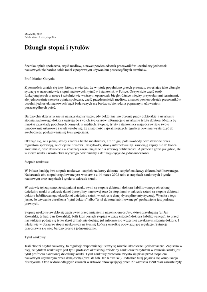 March 04, 2016 Publication: Rzeczpospolita Dżungla stopni i tytułów Szeroka opinia społeczna, część mediów, a nawet pewien odsetek pracowników uczelni czy jednostek naukowych nie bardzo sobie radzi z poprawnym używaniem poszczególnych terminów. Prof. Marian Gorynia Z pewnością znajdą się tacy, którzy stwierdzą, że w tytule popełniono grzech przesady, określając jako dżunglę sytuację w nazewnictwie stopni naukowych, tytułów i stanowisk w Polsce. Oczywiście część osób funkcjonujących w nauce i szkolnictwie wyższym opanowała biegle różnice między przywołanymi terminami, ale jednocześnie szeroka opinia społeczna, część przedstawicieli mediów, a nawet pewien odsetek pracowników uczelni, jednostek naukowych bądź badawczych nie bardzo sobie radzi z poprawnym używaniem poszczególnych pojęć. Bardzo charakterystyczne są na przykład sytuacje, gdy doktoranci po obronie pracy doktorskiej i uzyskaniu stopnia naukowego doktora wpisują do swoich życiorysów informację o uzyskaniu tytułu doktora. Można by mnożyć przykłady podobnych pomyłek w mediach. Stopnie, tytuły i stanowiska mają oczywiście swoje umocowanie ustawowe i wydawałoby się, że znajomość najważniejszych regulacji powinna wystarczyć do swobodnego posługiwania się tymi pojęciami. Okazuje się, że z jednej strony znaczna liczba możliwości, a z drugiej pole swobody pozostawione przez regulatora sprawiają, że oficjalne firmówki, wizytówki, strony internetowe itp. zawierają zapisy nie do końca zrozumiałe, dość dowolne i w znacznej części niejasne dla szerszej publiczności. A przecież gdzie jak gdzie, ale w sferze nauki i szkolnictwa wyższego powinniśmy z definicji dążyć do jednoznaczności. Stopnie naukowe W Polsce istnieją dwa stopnie naukowe - stopień naukowy doktora i stopień naukowy doktora habilitowanego. Nadawanie obu stopni uregulowane jest w ustawie z 14 marca 2003 roku o stopniach naukowych i tytule naukowym oraz stopniach i tytule w zakresie sztuki. W ustawie tej zapisano, że stopniami naukowymi są stopnie doktora i doktora habilitowanego określonej dziedziny nauki w zakresie danej dyscypliny naukowej oraz że stopniami w zakresie sztuki są stopnie doktora i doktora habilitowanego określonej dziedziny sztuki w zakresie danej dyscypliny artystycznej. Wynika z tego jasno, że używanie określenia "tytuł doktora" albo "tytuł doktora habilitowanego" pozbawione jest podstaw prawnych. Stopnie naukowe zwykło się zapisywać przed imieniem i nazwiskiem osoby, której przysługują (dr Jan Kowalski, dr hab. Jan Kowalski). Jeśli ktoś posiada stopień wyższy (stopień doktora habilitowanego), to przed nazwiskiem podaje się tylko skrót dr hab, nie dodając już informacji o wcześniej uzyskanym stopniu doktora. I właściwie w obszarze stopni naukowych na tym się kończą wszelkie obowiązujące regulacje. Sytuacja przedstawia się więc bardzo prosto i jednoznacznie. Tytuł naukowy Jeśli chodzi o tytuł naukowy, to regulacje wspomnianej ustawy są równie lakoniczne i jednoznaczne. Zapisano w niej, że tytułem naukowym jest tytuł profesora określonej dziedziny nauki oraz że tytułem w zakresie sztuki jest tytuł profesora określonej dziedziny sztuki. Tytuł naukowy profesora zwykło się pisać przed stopniem naukowym uzyskanym przez daną osobę (prof. dr hab. Jan Kowalski). Jednakże tutaj pojawia się komplikacja historyczna. Otóż w dość odległych czasach w ustawie obowiązującej przed 27 września 1990 roku zawarte były regulacje rozróżniające dwa tytuły naukowe profesora, między którymi istniała określona gradacja: niższy tytuł profesora nadzwyczajnego i wyższy tytuł profesora zwyczajnego. Ustawa przestała obowiązywać, ale osoby, które uzyskały określone tytuły pod jej rządami, miały prawo do czasu wejścia w życie ustawy z 2003 roku posługiwać się wówczas uzyskanymi tytułami (prof. zw. dr hab. Jan Kowalski; prof. nadzw. dr hab. Jan Kowalski. W tej sprawie warto zacytować treść art. 41 ust. 3 ustawy z 12 września 1990 roku o tytule i stopniach naukowych (wprowadzającej jeden tytuł naukowy profesora): "Art. 41. 3. Tytuły naukowe profesora zwyczajnego i profesora nadzwyczajnego, nadane na podstawie dotychczasowych przepisów, stają się tytułem naukowym profesora, określonym w niniejszej ustawie, z tym że osoby posiadające tytuł profesora zwyczajnego lub profesora nadzwyczajnego zachowują prawo używania nadal tytułów naukowych w dotychczasowym brzmieniu". Przytoczony artykuł wraz z całą ustawą z 12 września 1990 roku został uchylony 1 maja 2003 roku, tj. z dniem wejścia w życie aktualnej ustawy z 14 marca 2003 roku o stopniach naukowych i tytule naukowym oraz o stopniach i tytule w zakresie sztuki. Nowa ustawa nie zawiera postanowienia o zachowaniu prawa osób posiadających tytuł naukowy profesora zwyczajnego lub profesora nadzwyczajnego do używania tytułów naukowych w brzmieniu z daty ich nadania. Taki stan prawny wskazuje, że to prawo wygasło 1 maja 2003 roku i od tego dnia informacja o posiadanym tytule naukowym powinna brzmieć: profesor. Za takim rozstrzygnięciem przemawiają też względy celowościowe zmian w zakresie tytułów naukowych (ujednolicenie i uproszczenie) - jeden tytuł naukowy. Innymi słowy, zgodnie z zapisami ustawy z 2003 roku, informacja o posiadanym tytule naukowym powinna obecnie zawsze brzmieć: profesor, tj. także w sytuacji, gdy nauczycielowi akademickiemu nadano tytuł naukowy (przed 27 września 1990 roku) profesora zwyczajnego albo profesora nadzwyczajnego. Wydaje się jednak, że mając na uwadze konstytucyjną zasadę ochrony praw słusznie nabytych oraz szczególny prestiż społeczny związany z posiadaniem tytułu naukowego profesora zwyczajnego, należy uważać za słuszne i usprawiedliwione kontynuowanie praktyki używania tego tytułu naukowego zarówno przez osoby, którym został nadany przed wejściem w życie ustaw