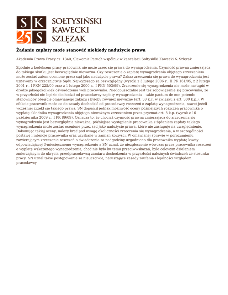 Żądanie zapłaty może stanowić niekiedy nadużycie prawa Akademia Prawa Pracy cz. 1340, Sławomir Paruch wspólnik w kancelarii Sołtysińki Kawecki & Szlęzak Zgodnie z kodeksem pracy pracownik nie może zrzec się prawa do wynagrodzenia. Czynność prawna zmierzająca do takiego skutku jest bezwzględnie nieważna. Czy roszczenie o zapłatę wynagrodzenia objętego zrzeczeniem może zostać zatem ocenione przez sąd jako nadużycie prawa? Zakaz zrzeczenia się prawa do wynagrodzenia jest uznawany w orzecznictwie Sądu Najwyższego za bezwzględny (wyroki z 3 lutego 2006 r., II PK 161/05, z 2 lutego 2001 r., I PKN 225/00 oraz z 1 lutego 2000 r., I PKN 503/99). Zrzeczenie się wynagrodzenia nie może nastąpić w drodze jakiegokolwiek oświadczenia woli pracownika. Niedopuszczalne jest też zobowiązanie się pracownika, że w przyszłości nie będzie dochodził od pracodawcy zapłaty wynagrodzenia – takie pactum de non petendo stanowiłoby obejście omawianego zakazu i byłoby również nieważne (art. 58 k.c. w związku z art. 300 k.p.). W efekcie pracownik może co do zasady dochodzić od pracodawcy roszczeń o zapłatę wynagrodzenia, nawet jeżeli wcześniej zrzekł się takiego prawa. SN dopuścił jednak możliwość oceny późniejszych roszczeń pracownika o wypłatę składnika wynagrodzenia objętego nieważnym zrzeczeniem przez pryzmat art. 8 k.p. (wyrok z 16 października 2009 r., I PK 89/09). Oznacza to, że chociaż czynność prawna zmierzająca do zrzeczenia się wynagrodzenia jest bezwzględnie nieważna, późniejsze wystąpienie pracownika z żądaniem zapłaty takiego wynagrodzenia może zostać ocenione przez sąd jako nadużycie prawa, które nie zasługuje na uwzględnienie. Dokonując takiej oceny, należy brać pod uwagę okoliczności zrzeczenia się wynagrodzenia, a w szczególności postawę i intencje pracownika oraz uzyskane w zamian korzyści. W omawianej sprawie w porozumieniu zawierającym zrzeczenie roszczeń o świadczenia za nadgodziny uzgodniono dla pracownika wypłatę kwoty odpowiadającej 3-miesięcznemu wynagrodzeniu a SN uznał, że niezgłoszenie wówczas przez pracownika roszczeń o wypłatę wskazanego wynagrodzenia, choć nie było ku temu przeciwwskazań, było celowym działaniem zmierzającym do ukrycia przedpracodawcą zamiaru dochodzenia w przyszłości należnych świadczeń ze stosunku pracy. SN uznał takie postępowanie za nieuczciwie, naruszające zasady zaufania i lojalności względem pracodawcy