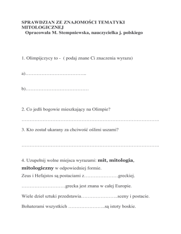 MITOLOGICZNEJ !" , nauczycielka j. polskiego 1. Olimpijczycy to - ( podaj znane Ci znaczenia wyrazu) a)……………………………….. b)………………………………… 2. Co jedli bogowie ? …………………………………………………………………………. 3. …………………………………………………………………………. 4. w odpowiedniej formie. !!!!!!!" !!!!!!!!!" % ' & & # $ # !!!!!!!# # !!!!!!!# # # ( # 5. Z pionowych kolumn magicznego k &" & + " #, poziomo, & & # K I I R R K E . D B O G I N I Z A E A U S E W K E O R R A H A C D E S A M I T K Y S N E K H T A R N C O B O L A I K P A U L R & )* , czytane H E R E M E S !!!!!!!!!!!!!!!!!!!!!! 6. Pro / & mitologicznych. & & 0/ / grecki heros &( 1 & dla dobra ludzi +( " + + + a. Zastosuj ……………………………………………………………………… ……………………………………………………………………… ……………………………………………………………………… ……………………………………………………………………… ……………………………………………………………………… ……………………………………………………………………… ……………………………………………………………………… …………………………………………………………………….. ……………………………………………………………………. 7. 2 greckich bogów? Hypnos ( bóg snu)………………………….. Chronos (bóg czasu )………………………. Helios 3(4" 1 5! ! ! ! ! ! ! ! ! # # Hermes ( bóg wiedzy tajemnej )………………………….. Hygieja (bogini zdrowia )………………………………… Higiena, hipnoza, chronologiczny, heliocentryczny, hermetyczny. 4/ & pokrewnymi. & & ( ………………………………………………………………………… ………………………………………………………………………… ………………………………………………………………………… ………………………………………………………………………… ………………………………………………………………………… 8. / & + 6 0 paniczny strach. / 0 0 6 " 0 ………………………………………………………………………… ………………………………………………………………………… ………………………………………………………………………… ………………………………………………………………………… ………………………………………………………………………… ………………………………………………………………………… 9. , & / Grecji . a) olimpiada b)surfing c)stadion d)dysk 10., & a) silny, & / b) 5 d) " ))# 7 a) + (5 +& 4 + c) z + d) + + , który nie pochodzi ze 0 4 & # & oznacza: 3 & & &85 12. Jak rozumiesz zdania: 1) Pokój Karola to istna stajnia Augiasza. ……………………………………………………………………… ……………………………………………………………………... 2) + & # ……………………………………………………………………… ……………………………………………………………………… 3) # …………………………………………………………………….. …………………………………………………………………….. 13. Masz m / " #% ( 0 formie. & & " ( ( & ( 0 4 " #, + 9+ & ……………………………………………………………………….. ………………………………………………………………………. ………………………………………………………………………. ………………………………………………………………………. ………………………………………………………………………. ……………………………………………………………………… ……………………………………………………………………… …………………………………………………………………….. …………………………………………………………………….. …………………………………………………………………….. ……………………………………………………………………. ……………………………………………………………………. …………………………………………………………………… ……………………………………………………………………. 14) Zadanie dodatkowe. , imiona bogów i ich przydomki: ( Zaproponuj przydomek dla Hadesa ). : " & Afrodyta bezradosna & 6 , + & & Zeus szybkonogi Hades ……………………