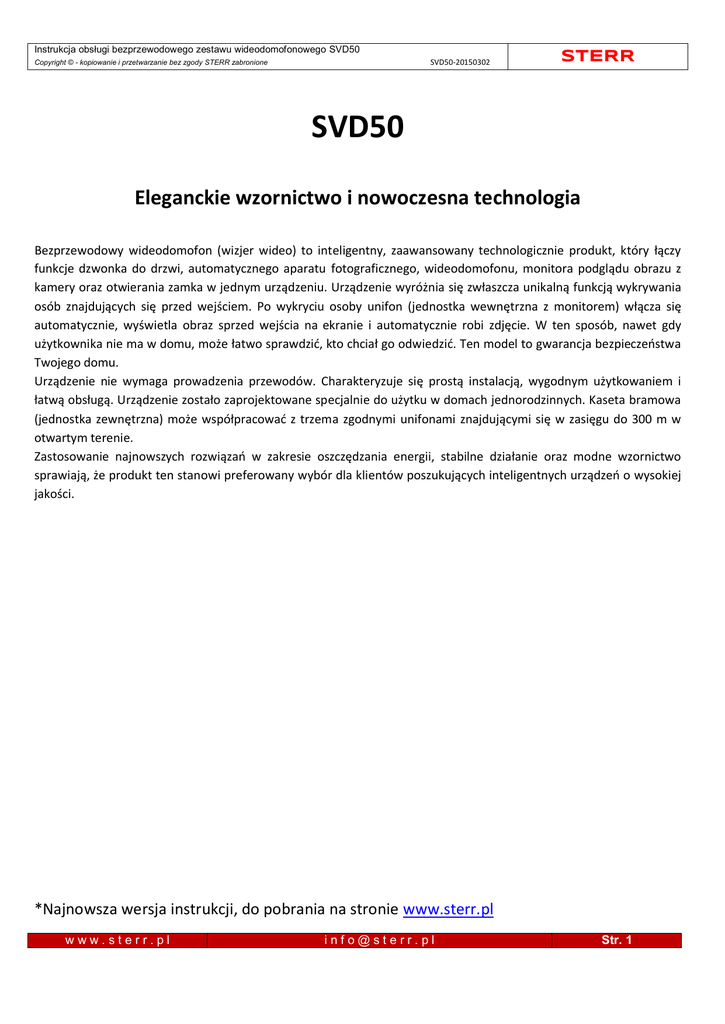 Instrukcja obs ugi bezprzewodowego zestawu wideodomofonowego SVD50 SVD50-20150302 Copyright © - kopiowanie i przetwarzanie bez zgody STERR zabronione STERR SVD50 Eleganckie wzornictwo i nowoczesna technologia Bezprzewodowy wideodomofon (wizjer wideo) to inteligentny, zaawansowany technologicznie produkt, który czy funkcje dzwonka do drzwi, automatycznego aparatu fotograficznego, wideodomofonu, monitora podgl du obrazu z kamery oraz otwierania zamka w jednym urz dzeniu. Urz dzenie wyró nia si zw aszcza unikaln funkcj wykrywania osób znajduj cych si przed wej ciem. Po wykryciu osoby unifon (jednostka wewn trzna z monitorem) w cza si automatycznie, wy wietla obraz sprzed wej cia na ekranie i automatycznie robi zdj cie. W ten sposób, nawet gdy ytkownika nie ma w domu, mo e atwo sprawdzi , kto chcia go odwiedzi . Ten model to gwarancja bezpiecze stwa Twojego domu. Urz dzenie nie wymaga prowadzenia przewodów. Charakteryzuje si prost instalacj , wygodnym u ytkowaniem i atw obs ug . Urz dzenie zosta o zaprojektowane specjalnie do u ytku w domach jednorodzinnych. Kaseta bramowa (jednostka zewn trzna) mo e wspó pracowa z trzema zgodnymi unifonami znajduj cymi si w zasi gu do 300 m w otwartym terenie. Zastosowanie najnowszych rozwi za w zakresie oszcz dzania energii, stabilne dzia anie oraz modne wzornictwo sprawiaj , e produkt ten stanowi preferowany wybór dla klientów poszukuj cych inteligentnych urz dze o wysokiej jako ci. *Najnowsza wersja instrukcji, do pobrania na stronie www.sterr.pl www.sterr.pl [email protected] Str. 1 Instrukcja obs ugi bezprzewodowego zestawu wideodomofonowego SVD50 Copyright © - kopiowanie i przetwarzanie bez zgody STERR zabronione SVD50-20150302 STERR Spis tre ci Wprowadzenie .............................................................................................................................................................. 3 Ostrze enia dotycz ce bezpiecze stwa oraz zalecenia ................................................................................................... 3 Informacje o produkcie .................................................................................................................................................. 5 Schemat urz dzenia....................................................................................................................................................... 7 Instrukcja monta u ........................................................................................................................................................ 8 Procedura monta u ....................................................................................................................................................... 9 Zalecenia dotycz ce monta u ........................................................................................................................................ 9 Wk adanie akumulatora............................................................................................................................................... 10 Funkcje i obs uga urz dzenia ....................................................................................................................................... 10 czanie kasety bramowej ........................................................................................................................................ 10 czanie i wy czanie ................................................................................................................................................ 10 Widzenie nocne ........................................................................................................................................................... 11 Menu ustawie ............................................................................................................................................................ 11 Ustawianie daty i czasu (Date & Time Setting) ............................................................................................................. 11 Ustawianie dzwonka (Ringing Setting) ......................................................................................................................... 11 Opó nienie w czenia blokady (Lock Delay Setting) ..................................................................................................... 11 czanie/ wy czanie czujnika PIR (PIR: ON/OFF)....................................................................................................... 11 Opis funkcji czujnika PIR .............................................................................................................................................. 12 Funkcja dzwonka kasety bramowej (wywo ywanie unifonu) ........................................................................................ 12 Wywo ywanie kasety bramowej z unifonu (monitorowanie obrazu sprzed wej cia) ..................................................... 12 Regulacja ekspozycji .................................................................................................................................................... 13 Podgl d i usuwanie zdj ............................................................................................................................................. 13 Akumulator i adowanie............................................................................................................................................... 14 Konfiguracja ................................................................................................................................................................ 14 wiadczenie .............................................................................................................................................................. 14 Typowe problemy i ich rozwi zywanie ............................................................................................................