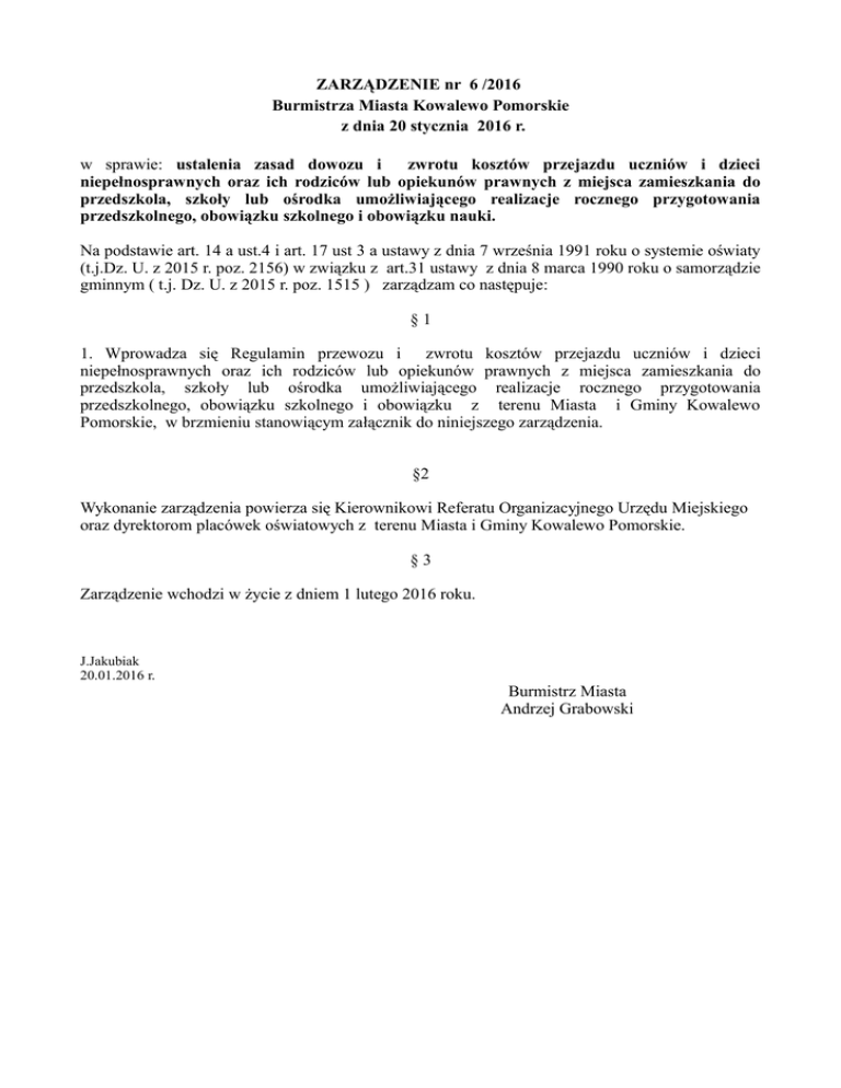 ZARZĄDZENIE nr 6 /2016 Burmistrza Miasta Kowalewo Pomorskie z dnia 20 stycznia 2016 r. w sprawie: ustalenia zasad dowozu i zwrotu kosztów przejazdu uczniów i dzieci niepełnosprawnych oraz ich rodziców lub opiekunów prawnych z miejsca zamieszkania do przedszkola, szkoły lub ośrodka umożliwiającego realizacje rocznego przygotowania przedszkolnego, obowiązku szkolnego i obowiązku nauki. Na podstawie art. 14 a ust.4 i art. 17 ust 3 a ustawy z dnia 7 września 1991 roku o systemie oświaty (t.j.Dz. U. z 2015 r. poz. 2156) w związku z art.31 ustawy z dnia 8 marca 1990 roku o samorządzie gminnym ( t.j. Dz. U. z 2015 r. poz. 1515 ) zarządzam co następuje: §1 1. Wprowadza się Regulamin przewozu i zwrotu kosztów przejazdu uczniów i dzieci niepełnosprawnych oraz ich rodziców lub opiekunów prawnych z miejsca zamieszkania do przedszkola, szkoły lub ośrodka umożliwiającego realizacje rocznego przygotowania przedszkolnego, obowiązku szkolnego i obowiązku z terenu Miasta i Gminy Kowalewo Pomorskie, w brzmieniu stanowiącym załącznik do niniejszego zarządzenia. §2 Wykonanie zarządzenia powierza się Kierownikowi Referatu Organizacyjnego Urzędu Miejskiego oraz dyrektorom placówek oświatowych z terenu Miasta i Gminy Kowalewo Pomorskie. §3 Zarządzenie wchodzi w życie z dniem 1 lutego 2016 roku. J.Jakubiak 20.01.2016 r. Burmistrz Miasta Andrzej Grabowski Załącznik do zarządzenia nr 6/2016 Burmistrza Miasta z dnia 20 stycznia 2016 r. Regulamin przewozu i zwrotu kosztów przejazdu uczniów i dzieci niepełnosprawnych oraz ich rodziców lub opiekunów prawnych z miejsca zamieszkania do przedszkola, szkoły lub ośrodka umożliwiającego realizacje rocznego przygotowania przedszkolnego, obowiązku szkolnego i obowiązku z terenu Miasta i Gminy Kowalewo Pomorskie §1 Uprawnieni do korzystania z dowozu lub dofinansowania dojazdu do przedszkola, szkoły, ośrodka są 1. Niepełnosprawne dzieci do najbliższego przedszkola, oddziału przedszkolnego w szkole podstawowej, innej formy wychowania przedszkolnego lub ośrodka umożliwiającego dzieciom, o którym mowa w art. 16 ust. 7 ustawy o systemie oświaty, a także dzieciom z upośledzeniem umysłowym z niepełnosprawnościami sprzężonymi realizującymi obowiązek, o którym mowa a art. 14 ust. 3 ustawy o systemie oświaty. 2. Uczniowie niepełnosprawni, których kształcenie i wychowanie odbywa się na podstawie art. 71 b ustawy o systemie oświaty do najbliższej szkoły podstawowej i gimnazjum, nie dłużej jednak niż do ukończenia 21 roku życia. 3. Uczniowie z niepełnosprawnością ruchową, upośledzeniem umysłowym w stopniu umiarkowanym lub znacznym do najbliższej szkoły podstawowej, gimnazjum oraz szkoły ponadgimnazjalnej, nie dłużej jednak niż do ukończenia 21 roku życia. 4. Dzieci i młodzieży, o których mowa w art. 16 ust. 7 ustawy o systemie oświaty, a także dzieci i młodzieży z upośledzeniem umysłowym z niepełnosprawnościami sprzężonymi, do ośrodka umożliwiającego tym dzieciom i młodzieży realizację obowiązku szkolnego i obowiązku nauki, nie dłużej jednak niż do ukończenia 25 roku życia. 5. Rodzice, opiekunowie prawni dzieci uczniów niepełnosprawnych. §2 Zadanie dowozu dzieci i uczniów niepełnosprawnych zamieszkałych na terenie miasta i gminy Kowalewo Pomorskie do przedszkola, szkoły ( ośrodka ) obejmuje: 1. Bezpłatny dowóz ucznia niepełnosprawnego i zapewnienie mu opieki w czasie przewozu do najbliższego przedszkola, szkoły podstawowej, gimnazjum lub ośrodka, które umożliwiają realizację obowiązkowego przygotowania przedszkolnego, obowiązku szkolnego i obowiązku nauki lub odpowiedni do najbliższej szkoły ponadgimnazjalnej; 2. Zwrot kosztów dojazdu ucznia niepełnosprawnego i jego opiekuna środkami komunikacji publicznej do najbliższego przedszkola, szkoły podstawowej, gimnazjum lub ośrodka, które umożliwiają realizację obowiązkowego przygotowania przedszkolnego, obowiązku szkolnego i obowiązku nauki 3. Zwrot kosztów przejazdu ucznia niepełnosprawnego i jego opiekuna do najbliższego przedszkola, szkoły podstawowej, gimnazjum lub ośrodka, które umożliwiają realizację obowiązkowego przygotowania przedszkolnego, obowiązku szkolnego i obowiązku nauki, jeżeli przejazd realizują rodzice ( prawni opiekunowie), na zasadach określonych w umowie zawartej pomiędzy Burmistrzem Miasta Kowalewo Pomorskie, a rodzicami ( opiekunami prawnymi ) dziecka, ucznia niepełnosprawnego. 1. §3 1. Wniosek o objęcie bezpłatnym dowozem dziecka, ucznia niepełnosprawnego lub dofinansowanie dowozu sporządza się wg wzoru stanowiącego stanowi załącznik Nr 1do niniejszego regulaminu. 2. Zainteresowani rodzice ( opiekunowie prawni ) składają wniosek sporządzony na formularzu, stanowiącym załącznik nr 1 o realizację dowozu ucznia niepełnosprawnego w sekretariacie Urzędu Miejskiego w Kowalewie Pomorskim. 3. Druk pobiera się ze strony internetowej Urzędu Miejskiego lub w Referacie Organizacyjnym Urzędu Miejskiego w Kowalewie Pomorskim ( biuro nr 4 ). 4. Do wniosku należy dołączyć niżej wymienione dokumenty: a) kserokopię aktualnego orzeczenia o niepełnosprawności dziecka, ucznia; b) kserokopię aktualnego orzeczenia poradni psychologiczno-pedagogicznej o potrzebie kształcenia specjalnego lub potrzebie zajęć rewalidacyjno-wychowawczych, c) zaświadczenie potwierdzające przyjęcie dziecka do szkoły lub ośrodka specjalnego, wydane przez dyrektora szkoły (ośrodka), d/ kserokopię dowodu rejestracyjnego samochodu, którym uczeń jest dowożony ( w przypadku, gdy dowożenie zapewniają rodzice, opiekunowie prawni ) 5. W przypadku braku kompletu wymaganych dokumentów, wnioskodawca zostanie wezwany do ich uzupełnienia. §4 1. Gmina przy realizacji obowiązku wynikającego z art. 14 a ust. 4 i 17 ust. 3a ustawy o systemie oświaty na podstawie złożonych wniosków przez rodziców prowadzi w formie: a) Dowozu zorganizowanego z miej