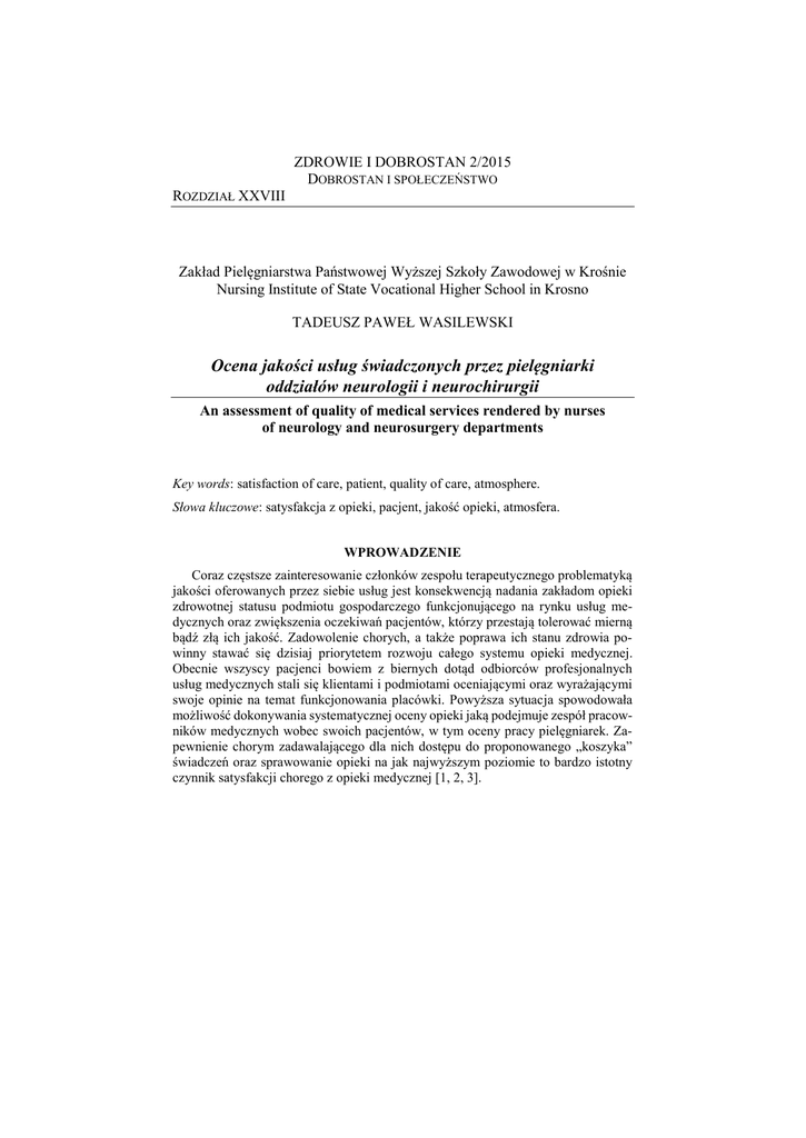 ZDROWIE I DOBROSTAN 2/2015 DOBROSTAN I SPOŁECZEŃSTWO ROZDZIAŁ XXVIII Zakład Pielęgniarstwa Państwowej Wyższej Szkoły Zawodowej w Krośnie Nursing Institute of State Vocational Higher School in Krosno TADEUSZ PAWEŁ WASILEWSKI Ocena jakości usług świadczonych przez pielęgniarki oddziałów neurologii i neurochirurgii An assessment of quality of medical services rendered by nurses of neurology and neurosurgery departments Key words: satisfaction of care, patient, quality of care, atmosphere. Słowa kluczowe: satysfakcja z opieki, pacjent, jakość opieki, atmosfera. WPROWADZENIE Coraz częstsze zainteresowanie członków zespołu terapeutycznego problematyką jakości oferowanych przez siebie usług jest konsekwencją nadania zakładom opieki zdrowotnej statusu podmiotu gospodarczego funkcjonującego na rynku usług medycznych oraz zwiększenia oczekiwań pacjentów, którzy przestają tolerować mierną bądź złą ich jakość. Zadowolenie chorych, a także poprawa ich stanu zdrowia powinny stawać się dzisiaj priorytetem rozwoju całego systemu opieki medycznej. Obecnie wszyscy pacjenci bowiem z biernych dotąd odbiorców profesjonalnych usług medycznych stali się klientami i podmiotami oceniającymi oraz wyrażającymi swoje opinie na temat funkcjonowania placówki. Powyższa sytuacja spowodowała możliwość dokonywania systematycznej oceny opieki jaką podejmuje zespół pracowników medycznych wobec swoich pacjentów, w tym oceny pracy pielęgniarek. Zapewnienie chorym zadawalającego dla nich dostępu do proponowanego „koszyka” świadczeń oraz sprawowanie opieki na jak najwyższym poziomie to bardzo istotny czynnik satysfakcji chorego z opieki medycznej [1, 2, 3]. ZDROWIE I DOBROSTAN 2/2015 Dobrostan i społeczeństwo Zdaniem Miller i wsp. [4] satysfakcja jest stanem emocjonalnym i poznawczym wynikającym z ukierunkowania wszelkich działań terapeutycznych na potrzeby chorego, a także umiejętności rozwiązywania wielu jego problemów i oczekiwań. Sytuacja ta wymaga także od pracowników medycznych zwrócenia szczególnej uwagi na respektowanie praw oraz kształtowanie podmiotowości pacjenta. W efekcie podejmowanych profesjonalnych działań wysoka satysfakcja z opieki powinna prowadzić do aktywizacji pacjentów i stworzyć im sytuację ułatwiającą samodzielne podejmowanie decyzji i czynności na rzecz utrzymania i poprawy własnego zdrowia. Celem prezentowanej pracy była próba subiektywnej oceny wybranych aspektów satysfakcji z pobytu w szpitalu w zakresie atmosfery panującej w oddziałach szpitalnych oraz postaw pielęgniarek wobec pacjentów. MATERIAŁ I METODA Badaniami objęto pacjentów, którzy byli hospitalizowani w Klinikach Neurochirurgii i Neurochirurgii Dziecięcej oraz Neurologii Samodzielnego Publicznego Szpitala Klinicznego Lublinie. Badania przeprowadzono wśród 173 chorych. Pierwszą grupę pacjentów stanowiły osoby z uszkodzeniem prawej półkuli mózgu (P=57), drugą grupę chorzy z uszkodzeniem lewej półkuli mózgu (L=55), a trzecią grupę chorzy hospitalizowani z powodu dyskopatii (D=61) na różnych poziomach kręgosłupa. W badaniach uczestniczyło 100 mężczyzn i 73 kobiety. Najliczniejszą grupę kobiet, tj. 28 osób (50,9%) stanowiły pacjentki z uszkodzeniami lewej półkuli mózgu, natomiast mniejszy odsetek kobiet wystąpił w grupach z uszkodzeniem prawej półkuli mózgu, tj. 22 osoby (38,6%) i w grupie kontrolnej 23 osoby (37,7%). W badanych grupach mężczyzn chorzy stanowili odpowiednio 38 osób (62,3%) w grupie kontrolnej, 35 osób (61,4%) w grupie z uszkodzeniami prawej półkuli mózgu i 27 osób (49,1%) w grupie z uszkodzeniami lewej półkuli mózgu. Wiek badanych pacjentów wahał się od 17 do 79 lat, w tym do 40 roku życia było 52 osoby (30,0%), między 40 a 59 rokiem życia było 80 osób (46,3%) a powyżej 60 roku życia było 41 osób (23,7%). W trzech badanych grupach pacjentów największy odsetek stanowili chorzy w związkach małżeńskich, tj. 128 osób (74,0%), pozostały procent stanowiły osoby owdowiałe, tj. 15 (8,7%), rozwiedzione, tj. 5 osób (2,9%) i stanu wolnego, tj. 25 osób (14,4%). Najliczniej reprezentowaną grupę stanowili chorzy z wykształceniem zawodowym i średnim, tj. 112 osób (64,7%), a mniej liczną z podstawowym i wyższym, tj. 61 osób (35,3%). W badaniach uczestniczyło 44 (25,4%) pacjentów mieszkających w dużych miastach, 68 (39,3%) pacjentów mieszkających w małych miastach i 61 (35,3%) chorych mieszkających na wsi. Źródłem utrzymania dla większości pacjentów, tj. 88 osób (50,9%) była praca zawodowa i inne źródła utrzymania, a emerytura i renta stanowiły źródło utrzymania dla 84 chorych (48,6%). Ocenę satysfakcji pacjentów z opieki pielęgniarskiej oparto o metodę sondażu diagnostycznego w postaci Kwestionariusza Satysfakcji Pacjenta z Pobytu w Szpitalu w zakresie atmosfery panującej w oddziałach szpitalnych oraz postaw pielęgniarek wobec pacjentów. 394 Tadeusz Paweł Wasilewski Ocena jakości usług świadczonych przez pielęgniarki oddziałów neurologii i neurochirurgii Oryginalna wersja kwestionariusza zakłada dwa rodzaje odpowiedzi pacjenta, tj. „tak” i „nie”, gdzie „tak” oznacza pozytywną ocenę usług pielęgniarskich i z tego tytułu satysfakcję z opieki, a „nie” ocenę negatywną i brak satysfakcji. W badaniach uwzględniono komentarz pacjenta na temat sprawowanej opieki i propozycję jej ewentualnej zmiany. Obliczeń wyników badań na podstawie powyższego kwestionariusza dokonano biorąc pod uwagę liczbę pacjentów, którzy wzięli udział w badaniach jako 100% dla każdej z grup. Ponadto, wyliczono średnią arytmetyczną z sum punktów dla poszczególnych grup pytań. WYNIKI BADAŃ W dobie intensywnych przemian społecznych i ekonomicznych społeczeństwo korzystające z opieki zdrowotnej, będąc bardziej wykształconym ma coraz większe wymagania wobec personelu medycznego, aniżeli miało to mi