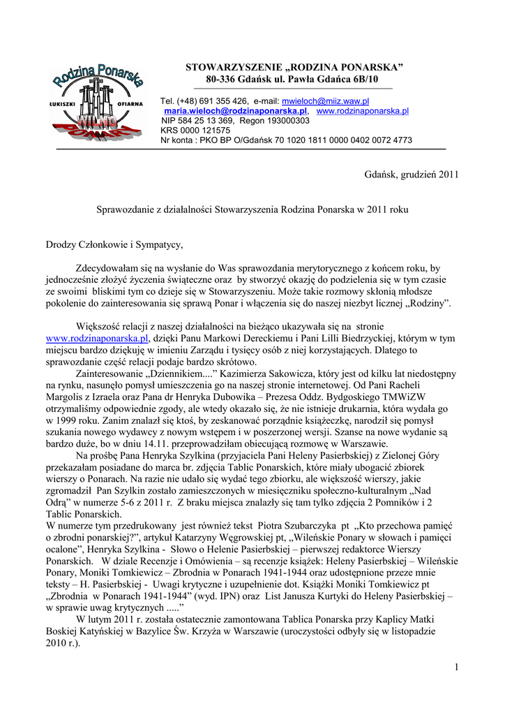 STOWARZYSZENIE „RODZINA PONARSKA” 80-336 Gdańsk ul. Pawła Gdańca 6B/10 mari Tel. (+48) 691 355 426, e-mail: [email protected] [email protected], www.rodzinaponarska.pl NIP 584 25 13 369, Regon 193000303 KRS 0000 121575 Nr konta : PKO BP O/Gdańsk 70 1020 1811 0000 0402 0072 4773 Gdańsk, grudzień 2011 Sprawozdanie z działalności Stowarzyszenia Rodzina Ponarska w 2011 roku Drodzy Członkowie i Sympatycy, Zdecydowałam się na wysłanie do Was sprawozdania merytorycznego z końcem roku, by jednocześnie złożyć życzenia świąteczne oraz by stworzyć okazję do podzielenia się w tym czasie ze swoimi bliskimi tym co dzieje się w Stowarzyszeniu. Może takie rozmowy skłonią młodsze pokolenie do zainteresowania się sprawą Ponar i włączenia się do naszej niezbyt licznej „Rodziny”. Większość relacji z naszej działalności na bieżąco ukazywała się na stronie www.rodzinaponarska.pl, dzięki Panu Markowi Dereckiemu i Pani Lilli Biedrzyckiej, którym w tym miejscu bardzo dziękuję w imieniu Zarządu i tysięcy osób z niej korzystających. Dlatego to sprawozdanie część relacji podaje bardzo skrótowo. Zainteresowanie „Dziennikiem....” Kazimierza Sakowicza, który jest od kilku lat niedostępny na rynku, nasunęło pomysł umieszczenia go na naszej stronie internetowej. Od Pani Racheli Margolis z Izraela oraz Pana dr Henryka Dubowika – Prezesa Oddz. Bydgoskiego TMWiZW otrzymaliśmy odpowiednie zgody, ale wtedy okazało się, że nie istnieje drukarnia, która wydała go w 1999 roku. Zanim znalazł się ktoś, by zeskanować porządnie książeczkę, narodził się pomysł szukania nowego wydawcy z nowym wstępem i w poszerzonej wersji. Szanse na nowe wydanie są bardzo duże, bo w dniu 14.11. przeprowadziłam obiecującą rozmowę w Warszawie. Na prośbę Pana Henryka Szylkina (przyjaciela Pani Heleny Pasierbskiej) z Zielonej Góry przekazałam posiadane do marca br. zdjęcia Tablic Ponarskich, które miały ubogacić zbiorek wierszy o Ponarach. Na razie nie udało się wydać tego zbiorku, ale większość wierszy, jakie zgromadził Pan Szylkin zostało zamieszczonych w miesięczniku społeczno-kulturalnym „Nad Odrą” w numerze 5-6 z 2011 r. Z braku miejsca znalazły się tam tylko zdjęcia 2 Pomników i 2 Tablic Ponarskich. W numerze tym przedrukowany jest również tekst Piotra Szubarczyka pt „Kto przechowa pamięć o zbrodni ponarskiej?”, artykuł Katarzyny Węgrowskiej pt, „Wileńskie Ponary w słowach i pamięci ocalone”, Henryka Szylkina - Słowo o Helenie Pasierbskiej – pierwszej redaktorce Wierszy Ponarskich. W dziale Recenzje i Omówienia – są recenzje książek: Heleny Pasierbskiej – Wileńskie Ponary, Moniki Tomkiewicz – Zbrodnia w Ponarach 1941-1944 oraz udostępnione przeze mnie teksty – H. Pasierbskiej - Uwagi krytyczne i uzupełnienie dot. Książki Moniki Tomkiewicz pt „Zbrodnia w Ponarach 1941-1944” (wyd. IPN) oraz List Janusza Kurtyki do Heleny Pasierbskiej – w sprawie uwag krytycznych .....” W lutym 2011 r. została ostatecznie zamontowana Tablica Ponarska przy Kaplicy Matki Boskiej Katyńskiej w Bazylice Św. Krzyża w Warszawie (uroczystości odbyły się w listopadzie 2010 r.). 1 W marcu na Wileńskie Kaziuki otrzymaliśmy zaproszenie od Ełckiego Oddziału Towarzystwa Miłośników Wilna i Ziemi Wileńskiej, niestety, z braku czasu, tylko duchowo byliśmy z nimi. A Członkowie nasi brali czynny udział w obchodach przygotowanych przez Oddział Pomorski TMWiZW wspólnie z Filią nr 18 WiMBP w Gdańsku-Wrzeszczu. Z pewnością wielu z nas z przyjemnością uczestniczyło w Kaziukowych obchodach w miejscu swojego zamieszkania. W pierwszą rocznicę śmierci śp. Heleny Pasierbskiej w dniu 12.03. odbyła się msza św. w Jej intencji w kościele pw. Matki Odkupiciela w Gdańsku-Wrzeszczu, która zgromadziła rodzinę i wielu przyjaciół. Po mszy św. z wielkim wzruszeniem Ballady Lecha Makowieckiego – „Katyń 1940 - Ostatni list” wysłuchali wszyscy zgromadzeni. W dniu 8 maja w uroczystościach Ponarskich w Wilnie i Zułowie (oraz z okazji zakończenia IIej wojny światowej i rocznicy śmierci Marszałka Piłsudskiego) uczestniczyła grupa Polaków, nie tylko związana z Ponarami. Po zbyt krótkich uroczystościach w Ponarach, gdzie przemawiał Prezes ZPL Michał Mackiewicz i Konsul RP w Wilnie - Stanisław Kargul oraz zwiedzeniu przez część uczestników Muzeum Żydowskiego (gdzie miłym zaskoczeniem były już dwujęzyczne podpisy pod zdjęciami Polaków) udaliśmy się do Zułowa – miejsca urodzin Marszałka Piłsudskiego. W Zułowie po wystąpieniach przedstawicieli ZPL i gości oraz bogatym programie artystycznym w wykonaniu Polskiego Zespołu Artystycznego Pieśni i Tańca „Wilia” oraz Polskiego Studium Teatralnego posadzono 4 dęby i poświęcono 4 stele upamiętniające: Błogosławionego Jana Pawła II, Aleksandra Krzyżanowskiego (ps. Wilk), Marszałka Senatu Andrzeja Stelmachowskiego oraz Ofiary Zbrodni Ponarskiej w latach 1941-1944. Dęby te i stele stanowią część tworzonej staraniem Związku Polaków na Litwie Alei Pamięci Narodowej. Z naszego Stowarzyszenia w dniu uroczystości obecny był Pan Jan Pilść oraz pp. Grażyna i Bogdan Potępa oraz ja. Gośćmi uroczystości były również rodziny A. Krzyżanowskiego i Andrzeja Stelmachowskiego. Każda z rodzin uczestniczyła czynnie przy sadzeniu dębów. Po poświęceniu steli i złożeniu wieńców pod każdą z nich udaliśmy się pod Pomnik Marszałka Józefa Piłsudskiego, by tu również złożyć wieniec. Po zakończeniu części oficjalnej wszyscy zostali ugoszczeni smakowitym posiłkiem ufundowanym przez Konsula RP. Pana Kargula, a przygotowanym przez członków ZPL. Uroczystość ta zgromadziła wielu Polaków mieszkających na Wileńszczyźnie, przedstawicieli wszystkich szczebli władz Związku Polaków na Litwie, gości z Polski, harcerzy, młodzież szkolną, duchowieństwo oraz miejscowe władze. W czasie poby