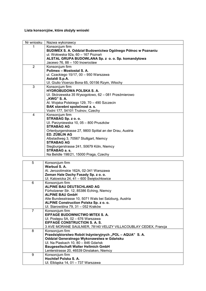 Lista konsorcjów, które złoŜyły wnioski Nr wniosku 1 2 3 4 5 6 7 8 9 Nazwa wykonawcy Konsorcjum firm BUDIMEX S. A. Oddział Budownictwa Ogólnego Północ w Poznaniu ul. Wołowska 92a, 60 – 167 Poznań ALSTAL GRUPA BUDOWLANA Sp. z o. o. Sp. komandytowa Jacewo 76, 88 – 100 Inowrocław Konsorcjum firm Polimex – Mostostal S. A. ul. Czackiego 15/17, 00 – 950 Warszawa Astaldi S.p.A. Ul. Giulio Vicenzo Bona 65, 00156 Rzym, Włochy Konsorcjum firm HYDROBUDOWA POLSKA S. A. Ul. Skórzewska 35 Wysogotowo, 62 – 081 Przeźmierowo „KWG” S. A. Al. Wojska Polskiego 129, 70 – 490 Szczecin BAK stavební společnost a. s. Vodni 177, 54101 Trutnov, Czechy Konsorcjum firm STRABAG Sp. z o. o. Ul. Parzyniewska 10, 05 – 800 Pruszków STRABAG AG Ortenburgerstrasse 27, 9800 Spittal an der Drau, Austria ED. ZÜBLIN AG Albstadtweg 3, 70567 Stuttgart, Niemcy STRABAG AG Siegburgerstrasse 241, 50679 Köln, Niemcy STRABAG a. s. Na Belidle 198/21, 15000 Praga, Czechy Konsorcjum firm Warbud S. A. Al. Jerozolimskie 162A, 02-341 Warszawa Zeman Hale Dachy Fasady Sp. z o. o. Ul. Katowicka 24, 41 – 600 Świętochłowice Konsorcjum firm ALPINE BAU DEUTSCHLAND AG Fürholzener Str. 12, 85386 Eching, Niemcy ALPINE BAU GmbH Alte Bundesstrasse 10, 5071 Wals bei Salzburg, Austria ALPINE Construction Polska Sp. z o. o. Ul. Starowiślna 79, 31 – 052 Kraków Konsorcjum firm EIFFAGE BUDOWNICTWO MITEX S. A. Ul. Postępu 5A, 02 – 676 Warszawa EIFFAGE CONSTRUCTION S. A. S. 3 AVE MORANE SAULNIER, 78140 VELIZY VILLACOUBLAY CEDEX, Francja Konsorcjum firm Przedsiębiorstwo Robót InŜynieryjnych „POL – AQUA” S. A. Oddział Generalnego Wykonawstwa w Gdańsku Ul. Na Piaskach 10, 80 – 846 Gdańsk Baugesellschaft Walter Hellmich GmbH Lenterstrasse 20, 46539 Dinslaken, Niemcy Konsorcjum firm Hochtief Polska S. A. Ul. Elbląska 14, 01 – 737 Warszawa 10 11 12 13 14 15 16 Hochtief Construction AG Opernplatz 2, 45128 Essen, Niemcy Konsorcjum firm Wrocławskie Przedsiębiorstwo Budownictwa Przemysłowego nr 2 „WROBIS“ S. A. Ul. Szewska 3, 50 – 053 Wrocław ACCIONA INFRAESTUCTURAS S. A. Avienda de Europa 18 Praque Emprearial la Moraleja, 28108 Alcobendas, Madryt, Hiszpania Mostostal Warszawa S. A. Ul. Konstruktorska 11a, 02 – 673 Warszawa Mostostal Puławy S. A. Ul. Budowlanych 5, 24 – 110 Puławy – Azoty Konsorcjum firm ERBUD S. A. Ul. Puławska 300A, 02 – 819 Warszawa Maxi – Star Sp. z o. o. Uścikówiec nr 4, 64 – 600 Oborniki PU – H – P „Maxi – Star Konstruktor” Tomasz Kaczmarek Uścikówiec nr 4, 64 – 600 Oborniki Konsorcjum firm Korporacja Budowlana DORACO Sp. z o. o. Ul. Opacka 12, 80 – 338 Gdańsk FHU MULTI PROJEKT Sp. z o. o. Sp. Komandytowa Ul. ZabuŜańska 38, 71 – 051 Szczecin Konsorcjum firm Energopol – Szczecin S. A. Ul. Św. Floriana 9/13, 70 – 646 Szczecin MEGA S. A. Ul. Hutnicza 42A, 81 – 038 Gdynia ARKOM Sp. z o. o. Ul. Marii Zaborowskiej 29, 76 – 200 Słupsk Konsorcjum firm Przedsiębiorstwo Budowlane „CALBUD” Sp. z o. o. Ul. Kapitańska 2, 71 – 602 Szczecin Wurst Stahlbau GmbH Sandtsraße 41, 49593 Besenbrück, Niemcy Przedsiębiorstwo Budowlano – Usługowe „INTERBUD – WEST” Sp. z o. o. Ul. Kosynierów Gdyńskich 51, 66 – 400 Gorzów TKT ENGINEERING Sp. z o. o. Ul. Pryzmaty 4, 02 – 226 Warszawa Konsorcjum firm Przedsiębiorstwo Budowlano – InŜynieryjne „KORNAS” Bogdan Kornas Ul. Św. Wojciecha 10, 78 – 100 Kołobrzeg PBI KORNAS Sp. z o. o. Ul. Św. Wojciecha 10, 78 – 100 Kołobrzeg ASENHAJMER Sp. z o. o. Ul. Kowalska 1 – 2/K, 82 – 300 Elbląg Konsorcjum firm MIRBUD S. A. Ul. Unii Europejskiej 18 96 – 100 Skierniewice OTWARTA SPÓŁKA AKCYJNa UKRSTALKONSTRUKCJA Ul. Architektura Horodeckoho 11- W, 01001 m. Kijów, Ukraina