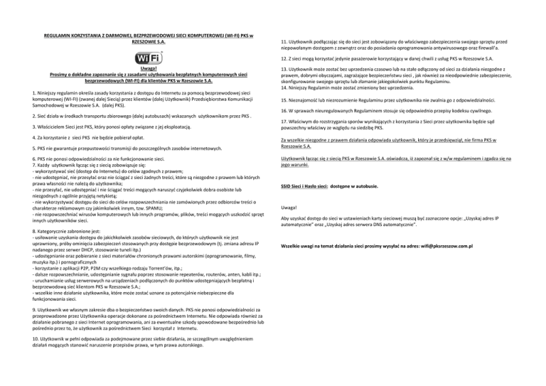 REGULAMIN KORZYSTANIA Z DARMOWEJ, BEZPRZEWODOWEJ SIECI KOMPUTEROWEJ (WI-FI) PKS w RZESZOWIE S.A. 11. Użytkownik podłączając się do sieci jest zobowiązany do właściwego zabezpieczenia swojego sprzętu przed niepowołanym dostępem z zewnątrz oraz do posiadania oprogramowania antywirusowego oraz firewall’a. 12. Z sieci mogą korzystad jedynie pasażerowie korzystający w danej chwili z usług PKS w Rzeszowie S.A. Uwaga! Prosimy o dokładne zapoznanie się z zasadami użytkowania bezpłatnych komputerowych sieci bezprzewodowych (WI-FI) dla klientów PKS w Rzeszowie S.A. 1. Niniejszy regulamin określa zasady korzystania z dostępu do Internetu za pomocą bezprzewodowej sieci komputerowej (WI-FI) (zwanej dalej Siecią) przez klientów (dalej Użytkownik) Przedsiębiorstwa Komunikacji Samochodowej w Rzeszowie S.A. (dalej PKS). 13. Użytkownik może zostad bez uprzedzenia czasowo lub na stałe odłączony od sieci za działania niezgodne z prawem, dobrymi obyczajami, zagrażające bezpieczeostwu sieci , jak również za nieodpowiednie zabezpieczenie, skonfigurowanie swojego sprzętu lub złamanie jakiegokolwiek punktu Regulaminu. 14. Niniejszy Regulamin może zostad zmieniony bez uprzedzenia. 15. Nieznajomośd lub niezrozumienie Regulaminu przez użytkownika nie zwalnia go z odpowiedzialności. 16. W sprawach nieuregulowanych Regulaminem stosuje się odpowiednio przepisy kodeksu cywilnego. 2. Sied działa w środkach transportu zbiorowego (dalej autobusach) wskazanych użytkownikom przez PKS . 3. Właścicielem Sieci jest PKS, który ponosi opłaty związane z jej eksploatacją. 4. Za korzystanie z sieci PKS nie będzie pobierał opłat. 5. PKS nie gwarantuje przepustowości transmisji do poszczególnych zasobów internetowych. 6. PKS nie ponosi odpowiedzialności za nie funkcjonowanie sieci. 7. Każdy użytkownik łącząc się z siecią zobowiązuje się: - wykorzystywad sied (dostęp do Internetu) do celów zgodnych z prawem; - nie udostępniad, nie przesyład oraz nie ściągad z sieci żadnych treści, które są niezgodne z prawem lub których prawa własności nie należą do użytkownika; - nie przesyład, nie udostępniad i nie ściągad treści mogących naruszyd czyjekolwiek dobra osobiste lub niezgodnych z ogólnie przyjętą netykietą; - nie wykorzystywad dostępu do sieci do celów rozpowszechniania nie zamówionych przez odbiorców treści o charakterze reklamowym czy jakimkolwiek innym, tzw. SPAMU; - nie rozpowszechniad wirusów komputerowych lub innych programów, plików, treści mogących uszkodzid sprzęt innych użytkowników sieci. 8. Kategorycznie zabronione jest: - usiłowanie uzyskania dostępu do jakichkolwiek zasobów sieciowych, do których użytkownik nie jest uprawniony, próby ominięcia zabezpieczeo stosowanych przy dostępie bezprzewodowym (tj. zmiana adresu IP nadanego przez serwer DHCP, stosowanie tuneli itp.) - udostępnianie oraz pobieranie z sieci materiałów chronionych prawami autorskimi (oprogramowanie, filmy, muzyka itp.) i pornograficznych - korzystanie z aplikacji P2P, P2M czy wszelkiego rodzaju Torrent’ów, itp.; - dalsze rozpowszechnianie, udostępnianie sygnału poprzez stosowanie repeaterów, routerów, anten, kabli itp.; - uruchamianie usług serwerowych na urządzeniach podłączonych do punktów udostępniających bezpłatną i bezprzewodową sied klientom PKS w Rzeszowie S.A.; - wszelkie inne działanie użytkownika, które może zostad uznane za potencjalnie niebezpieczne dla funkcjonowania sieci. 9. Użytkownik we własnym zakresie dba o bezpieczeostwo swoich danych. PKS nie ponosi odpowiedzialności za przeprowadzone przez Użytkownika operacje dokonane za pośrednictwem Internetu. Nie odpowiada również za działanie pobranego z sieci Internet oprogramowania, ani za ewentualne szkody spowodowane bezpośrednio lub pośrednio przez to, że użytkownik za pośrednictwem Sieci korzystał z Internetu. 10. Użytkownik w pełni odpowiada za podejmowane przez siebie działania, ze szczególnym uwzględnieniem działao mogących stanowid naruszenie przepisów prawa, w tym prawa autorskiego. 17. Właściwym do rozstrzygania sporów wynikających z korzystania z Sieci przez użytkownika będzie sąd powszechny właściwy ze względu na siedzibę PKS. Za wszelkie niezgodne z prawem działania odpowiada użytkownik, który je przedsięwziął, nie firma PKS w Rzeszowie S.A. Użytkownik łącząc się z siecią PKS w Rzeszowie S.A. oświadcza, iż zapoznał się z w/w regulaminem i zgadza się na jego warunki. SSID Sieci i Hasło sieci: dostępne w autobusie. Uwaga! Aby uzyskad dostęp do sieci w ustawieniach karty sieciowej muszą byd zaznaczone opcje: „Uzyskaj adres IP automatycznie” oraz „Uzyskaj adres serwera DNS automatycznie”. Wszelkie uwagi na temat działania sieci prosimy wysyład na adres: [email protected]