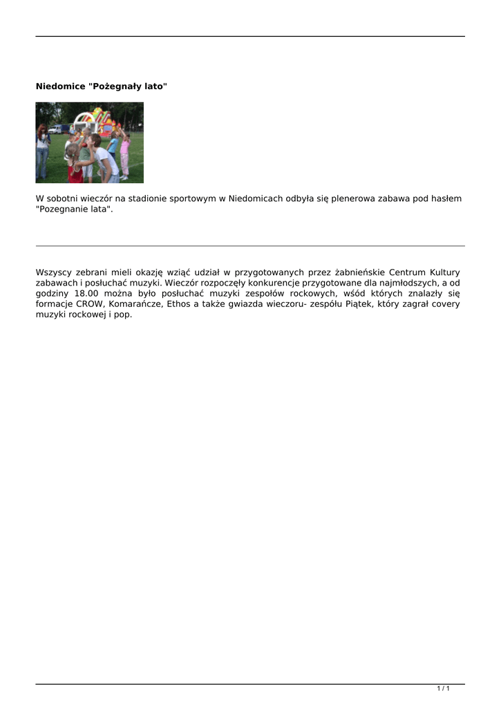 Niedomice "Pożegnały lato" W sobotni wieczór na stadionie sportowym w Niedomicach odbyła się plenerowa zabawa pod hasłem "Pozegnanie lata". Wszyscy zebrani mieli okazję wziąć udział w przygotowanych przez żabnieńskie Centrum Kultury zabawach i posłuchać muzyki. Wieczór rozpoczęły konkurencje przygotowane dla najmłodszych, a od godziny 18.00 można było posłuchać muzyki zespołów rockowych, wśód których znalazły się formacje CROW, Komarańcze, Ethos a także gwiazda wieczoru- zespółu Piątek, który zagrał covery muzyki rockowej i pop. 1/1 Powered by TCPDF (www.tcpdf.org)