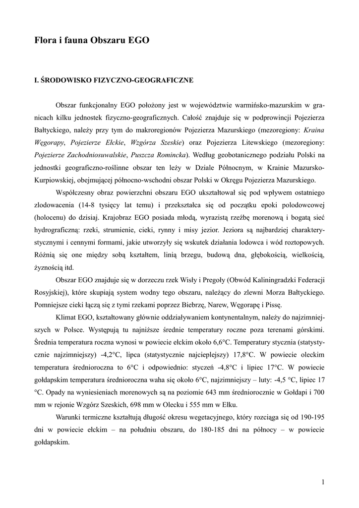 Flora i fauna Obszaru EGO I. ŚRODOWISKO FIZYCZNO-GEOGRAFICZNE Obszar funkcjonalny EGO położony jest w województwie warmińsko-mazurskim w granicach kilku jednostek fizyczno-geograficznych. Całość znajduje się w podprowincji Pojezierza Bałtyckiego, należy przy tym do makroregionów Pojezierza Mazurskiego (mezoregiony: Kraina Węgorapy, Pojezierze Ełckie, Wzgórza Szeskie) oraz Pojezierza Litewskiego (mezoregiony: Pojezierze Zachodniosuwalskie, Puszcza Romincka). Według geobotanicznego podziału Polski na jednostki geograficzno-roślinne obszar ten leży w Dziale Północnym, w Krainie MazurskoKurpiowskiej, obejmującej północno-wschodni obszar Polski w Okręgu Pojezierza Mazurskiego. Współczesny obraz powierzchni obszaru EGO ukształtował się pod wpływem ostatniego zlodowacenia (14-8 tysięcy lat temu) i przekształca się od początku epoki polodowcowej (holocenu) do dzisiaj. Krajobraz EGO posiada młodą, wyrazistą rzeźbę morenową i bogatą sieć hydrograficzną: rzeki, strumienie, cieki, rynny i misy jezior. Jeziora są najbardziej charakterystycznymi i cennymi formami, jakie utworzyły się wskutek działania lodowca i wód roztopowych. Różnią się one między sobą kształtem, linią brzegu, budową dna, głębokością, wielkością, żyznością itd. Obszar EGO znajduje się w dorzeczu rzek Wisły i Pregoły (Obwód Kaliningradzki Federacji Rosyjskiej), które skupiają system wodny tego obszaru, należący do zlewni Morza Bałtyckiego. Pomniejsze cieki łączą się z tymi rzekami poprzez Biebrzę, Narew, Węgorapę i Pissę. Klimat EGO, kształtowany głównie oddziaływaniem kontynentalnym, należy do najzimniejszych w Polsce. Występują tu najniższe średnie temperatury roczne poza terenami górskimi. Średnia temperatura roczna wynosi w powiecie ełckim około 6,6°C. Temperatury stycznia (statystycznie najzimniejszy) -4,2°C, lipca (statystycznie najcieplejszy) 17,8°C. W powiecie oleckim temperatura średnioroczna to 6°C i odpowiednio: styczeń -4,8°C i lipiec 17°C. W powiecie gołdapskim temperatura średnioroczna waha się około 6°C, najzimniejszy – luty: -4,5 °C, lipiec 17 °C. Opady na wyniesieniach morenowych są na poziomie 643 mm średniorocznie w Gołdapi i 700 mm w rejonie Wzgórz Szeskich, 698 mm w Olecku i 555 mm w Ełku. Warunki termiczne kształtują długość okresu wegetacyjnego, który rozciąga się od 190-195 dni w powiecie ełckim – na południu obszaru, do 180-185 dni na północy – w powiecie gołdapskim. 1 II. FLORA Duży obszar oraz jego znaczne zróżnicowanie siedliskowe warunkuje obecność na obszarze EGO licznej, także zróżnicowanej gatunkowo flory. Rozwój współczesnej szaty roślinnej na tym terenie rozpoczął się po ustąpieniu ostatniego zlodowacenia. Obecnie występuje tu około 2000 gatunków roślin wyższych, w tym około 25 gatunków drzew. Szata roślinna występuje w postaci zróżnicowanych zbiorowisk roślinnych. Trzeba jednak pamiętać, że w wyniku działalności gospodarczej człowieka nie ma obecnie zbiorowisk roślinnych w pierwotnej postaci. Również w kraju zbiorowisk naturalnych, tj. takich, w których przyroda zatarła działalność człowieka i zbliżyła je do pierwotnej postaci, jest niewiele (około 8%). Najwięcej na obszarze EGO jest zbiorowisk półnaturalnych, składających się zarówno z gatunków naturalnych, jak i wprowadzonych przez człowieka, np. łąki, pastwiska, część lasów. Występują też zbiorowiska sztuczne, czyli utworzone w wyniku działalności gospodarczej, np. pola uprawne, ogrody. 1. Zbiorowiska roślinne Zbiorowiska roślinne można podzielić na leśne i roślinności nieleśnej. W każdej z tych grup występuje kilka odmiennych typów. Charakterystyczną cechą szaty roślinnej obszaru EGO jest dominujący udział świerka w lasach, zarówno na glebach mineralnych jak i na torfowiskach oraz duży udział gatunków borealnych i subborealnych, borealno-górskich, a także gatunków stanowiących relikty poglacjalne, występujących w północno-wschodniej części Europy i północnej Azji. Wśród nich należy wymienić: turzycę kulistą Carex globularis, turzycę drobnozadziorkową C. mikroglochin, turzycę delikatną C. disperma, gwiazdnicę grubolistną Stellaria crassiflora, jaskier leżący Ranunkulus reptans, wełnianeczkę alpejską Scirpus hudsonianus, wielosił błękitny Polemonium coreleum, brzozę niską Betula humilis, gniadosza królewskiego Pedicilaris sceptrum-carolinum, skalnicę torfowiskową Saxifraga hirculus i inne. Niektóre z tych roślin mają tu zachodnie i południowo-zachodnie granice geograficznego zasięgu. Z drzew, poza świerkiem (Picea abies), powszechne są: sosna Pinus sylvestris, dąb szypułkowy Quercus robur, 2 grab Carpinus betulus, lipa drobnolistna Tilia cordata (będąca pozostałością wielkich lasów lipowych z okresu postglacjalnego), brzoza brodawkowata Betula pendula, brzoza omszona Betula pubescens, olsza czarna Alnus glutinosa, jesion Fraxinus excelsior, osika Populus tremula, jarzębina - jarząb zwyczajny Sorbus aucuparia , czeremcha Padus avium, klon Acer pseudoplatanus, wiąz górski – brzost Ulmus glabra, wiąz pospolity Ulmus minor, wiąz szypułkowy Ulmus laevis, wierzba krucha Salix fragilis, wierzba pięciopręcikowa Salix pentandra, wierzba biała Salix alba, wierzba iwa Salix caprea. Bardzo rzadkim drzewem jest cis Taxus baccata – jedynie w rezerwacie „Cisowy Jar”, gdzie najstarsze mają 250 lat. Z krzewów najbardziej rozpowszechnione są: jałowiec pospolity Juniperus communis, leszczyna Corylus avellana, kruszyna Frangula alnus, kalina koralowa Viburnum opulus, trzmielina brodawkowata Euonymus verrucosus, trzmielina zwyczajna Euonymus europaeus, wiciokrzew suchodrzew Lonicera caprifolium, porzeczka czerwona Ribes rubrum, porzeczka czarna Ribes nigrum, porzeczka alpejska Ribes alpinum, wawrzynek wilczełyko Daphne mezereum. Rzadko i tylko na torfowiskach spotyka się wie
