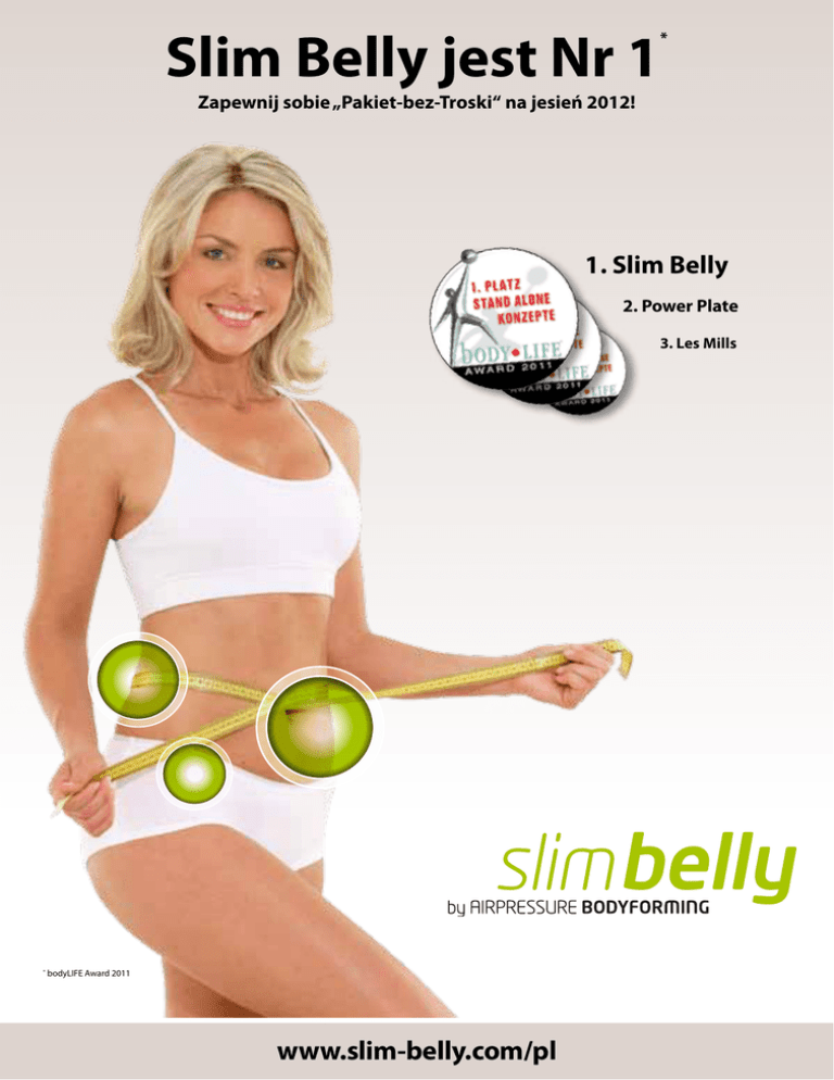 Slim Belly jest Nr 1 * Zapewnij sobie „Pakiet-bez-Troski“ na jesień 2012! 1. Slim Belly 2. Power Plate 3. Les Mills Greinwalder & Partner * bodyLIFE Award 2011 www.slim-belly.com/pl Wzmocnij swoją pozycję na rynku! Airpressure Bodyforming jest konceptem modelowania sylwetki. Przeznaczony jest wyłącznie dla klubów, które chcą się pozycjonować w branży fitness, jako specjaliści kształtowania figury. Liczy się tylko sukces! Metodę Airpressure Bodyforming stworzono z myślą o osobach, które mają problem z figurą. W szczególności, kiedy tradycyjne metody (dieta, trening) nie przynoszą wymarzonych efektów, czyli chudną „nieodpowiednie“ części ciała. Dzięki Airpressure Bodyforming redukujesz docelowo miejsca problemowe - Twoi klienci chudną dokładnie tam, gdzie tego chcą! Funkcjonowanie Aktywujące zabiegi zmiennym uciskiem stymulują ukrwienie w problemowych okolicach. Dzięki temu nie tylko zmniejsza się obwód, lecz także skóra odzyskuje jędrność i elastyczność. Airpressure Bodyforming wspomaga nawet redukcję rozstępów ciążowych! Powietrze jest Powietrze jest pompowane odpuszczane Funkcjonowanie 68 kg Przed kuracją odchudzającą 64 kg Efekty tradycyjnej kuracji odchudzającej 64 kg Efekty kuracji odchudzającej ze Slim Belly i Slim Legs Tkanka tłuszczowa Mięśnie brzucha Brak ucisku Nadciśnienie Komora powietrzna Transport krwi do komórek tłuszczowych Regionalne ukrwienie Metoda Airpressure Bodyforming składa się z kombinacji: 1) zasad odżywiania (żadna dieta), 2) treningu wytrzymałościowego (3x tygodniowo, po 30-40 minut) oraz 3) Slim Belly (brzuch, talia) i Slim Legs (pośladki, uda). 900 klubów partnerskich w Europie 500 000 uczestników Slim Belly 2011 najlepszy Stand Alone Concept* * wg instytutu badawczego Würtenberger dla bodyLife Award 2011 www.slim-belly.com/pl Fakty, które przekonują • średnio 40 uczestników na klub w pierwszych 4 tygodniach (w Polsce), • średnio o 8,3 cm1 mniejszy obwód brzucha w jedyne 4 tygodnie, • każdy uczestnik płaci co najmniej 59 zł/tydzień, • nowa grupa klientów: osoby, które nie chodzą do klubu fitness, • ponad 2200 uczestników programu łącznie od kwietnia 2011 w Polsce, • widoczne i wymierne sukcesy w jedyne 4 tygodnie, • obecnie ponad 40 klubów partnerskich w Polsce. 1 Mierzone w dwóch miejscach (min. 2,5 cm, max. 23,5 cm – udowodniono w ramach badań prowadzonych przez kluby fitness). Doświadczenia polskich klubów fitness Katarzyna Staśkiewicz, KSA, Śrem „Slim Belly w Śremie jest hitem! 80 osób zredukowało obwód brzucha łącznie o 680 cm, czyli na osobę średnio 8,5 cm. Nasi klienci są zachwyceni wynikami a my osiągniętym obrotem- w 4 tygodnie 25.000 zł - WOW!“ Wojciech Wiśniewski, Atlas, Jarocin „Slim Belly to świetnie przygotowany produkt, gotowy do wdrożenia w każdym klubie. Nie ma potrzeby zastanawiać się, jak przeprowadzić program. Wystarczy zaangażować odpowiednio pracowników do działania na własną wspólną korzyść - korzyść klientów. Marcin Ratajczyk, Geotermia, Grudziądz „Slim Belly zagwarantowało nam pozycję lidera na lokalnym rynku! Program Slim Belly znakomicie zaadoptował się w naszym klubie. Średni wynik osiągany podczas badań w naszym klubie to - 9,2 cm w obwodzie pasa. Rezultaty są realnie zauważalne przez ćwiczących, co wpływa znakomicie na pozyskiwanie nowych klubowiczów.“ Reszta to ciąg przyczynowoskutkowy dobrze przeprowadzonych działań, który w ostateczności prowadzi do zadowolenia wszystkich uczestników, a zadowolenie jest wprost proporcjonalne do włożonego zaangażowania.“ Zostań częścią tej historii sukcesu! Przygotowaliśmy dla Ciebie prezent: „Pakiet-bez-Troski“ o wartości 5.600 zł. Zgłoś się do 30 września 2012 i startuj z konceptem Slim Belly! Twój „Pakiet-bez-Troski“: • sprzęt Slim Belly, • szkolenie personelu w Twoim klubie fitness, • intensywne doradztwo, • wykluczenie konkurentów, • pakiet materiałów reklamowych z kuponami, ulotkami, plakatami do dekoracji klubu, • tekst i ogłoszenie prasowe, wzór listu do klientów, etc. do ważna Ofertaześnia 2012 30 wr Firma dystrybucyjna w Polsce Star Fitness S.A. ul. Bolesława Krzywoustego 72 61-144 Poznań Tel. +48 (61) 853 30 02 GSM +48 515 146 211 Fax +48 (61) 853 34 19 [email protected] www.slim-belly.com/pl Wyłączny partner firmy Greinwalder & Partner