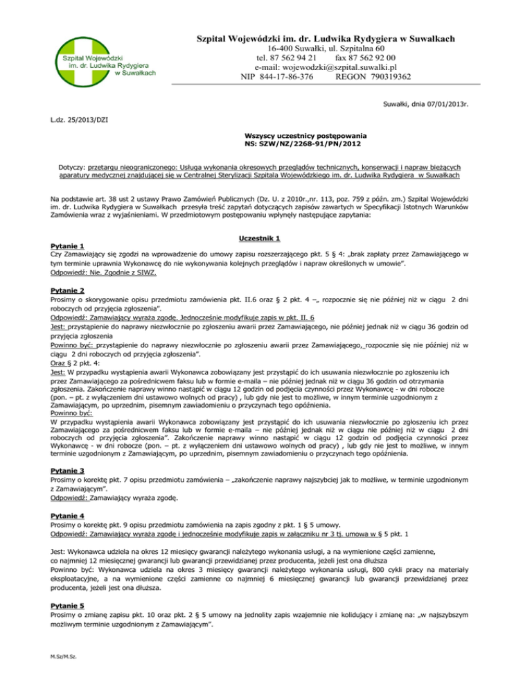 Szpital Wojewódzki im. dr. Ludwika Rydygiera w Suwałkach 16-400 Suwałki, ul. Szpitalna 60 tel. 87 562 94 21 fax 87 562 92 00 e-mail: [email protected] NIP 844-17-86-376 REGON 790319362 Suwałki, dnia 07/01/2013r. L.dz. 25/2013/DZI Wszyscy uczestnicy postępowania NS: SZW/NZ/2268-91/PN/2012 Dotyczy: przetargu nieograniczonego: Usługa wykonania okresowych przeglądów technicznych, konserwacji i napraw bieżących aparatury medycznej znajdującej się w Centralnej Sterylizacji Szpitala Wojewódzkiego im. dr. Ludwika Rydygiera w Suwałkach Na podstawie art. 38 ust 2 ustawy Prawo Zamówień Publicznych (Dz. U. z 2010r.,nr. 113, poz. 759 z późn. zm.) Szpital Wojewódzki im. dr. Ludwika Rydygiera w Suwałkach przesyła treść zapytań dotyczących zapisów zawartych w Specyfikacji Istotnych Warunków Zamówienia wraz z wyjaśnieniami. W przedmiotowym postępowaniu wpłynęły następujące zapytania: Uczestnik 1 Pytanie 1 Czy Zamawiający się zgodzi na wprowadzenie do umowy zapisu rozszerzającego pkt. 5 § 4: „brak zapłaty przez Zamawiającego w tym terminie uprawnia Wykonawcę do nie wykonywania kolejnych przeglądów i napraw określonych w umowie”. Odpowiedź: Nie. Zgodnie z SIWZ. Pytanie 2 Prosimy o skorygowanie opisu przedmiotu zamówienia pkt. II.6 oraz § 2 pkt. 4 –„ rozpocznie się nie później niż w ciągu 2 dni roboczych od przyjęcia zgłoszenia”. Odpowiedź: Zamawiający wyraża zgodę. Jednocześnie modyfikuje zapis w pkt. II. 6 Jest: przystąpienie do naprawy niezwłocznie po zgłoszeniu awarii przez Zamawiającego, nie później jednak niż w ciągu 36 godzin od przyjęcia zgłoszenia Powinno być: przystąpienie do naprawy niezwłocznie po zgłoszeniu awarii przez Zamawiającego, rozpocznie się nie później niż w ciągu 2 dni roboczych od przyjęcia zgłoszenia”. Oraz § 2 pkt. 4: Jest: W przypadku wystąpienia awarii Wykonawca zobowiązany jest przystąpić do ich usuwania niezwłocznie po zgłoszeniu ich przez Zamawiającego za pośrednicwem faksu lub w formie e-maila – nie później jednak niż w ciągu 36 godzin od otrzymania zgłoszenia. Zakończenie naprawy winno nastąpić w ciągu 12 godzin od podjęcia czynności przez Wykonawcę - w dni robocze (pon. – pt. z wyłączeniem dni ustawowo wolnych od pracy) , lub gdy nie jest to możliwe, w innym terminie uzgodnionym z Zamawiającym, po uprzednim, pisemnym zawiadomieniu o przyczynach tego opóźnienia. Powinno być: W przypadku wystąpienia awarii Wykonawca zobowiązany jest przystąpić do ich usuwania niezwłocznie po zgłoszeniu ich przez Zamawiającego za pośrednicwem faksu lub w formie e-maila – nie później jednak niż w ciągu nie później niż w ciągu 2 dni roboczych od przyjęcia zgłoszenia”. Zakończenie naprawy winno nastąpić w ciągu 12 godzin od podjęcia czynności przez Wykonawcę - w dni robocze (pon. – pt. z wyłączeniem dni ustawowo wolnych od pracy) , lub gdy nie jest to możliwe, w innym terminie uzgodnionym z Zamawiającym, po uprzednim, pisemnym zawiadomieniu o przyczynach tego opóźnienia. Pytanie 3 Prosimy o korektę pkt. 7 opisu przedmiotu zamówienia – „zakończenie naprawy najszybciej jak to możliwe, w terminie uzgodnionym z Zamawiającym”. Odpowiedź: Zamawiający wyraża zgodę. Pytanie 4 Prosimy o korektę pkt. 9 opisu przedmiotu zamówienia na zapis zgodny z pkt. 1 § 5 umowy. Odpowiedź: Zamawiający wyraża zgodę i jednocześnie modyfikuje zapis w załączniku nr 3 tj. umowa w § 5 pkt. 1 Jest: Wykonawca udziela na okres 12 miesięcy gwarancji należytego wykonania usługi, a na wymienione części zamienne, co najmniej 12 miesięcznej gwarancji lub gwarancji przewidzianej przez producenta, jeżeli jest ona dłuższa Powinno być: Wykonawca udziela na okres 3 miesięcy gwarancji należytego wykonania usługi, 800 cykli pracy na materiały eksploatacyjne, a na wymienione części zamienne co najmniej 6 miesięcznej gwarancji lub gwarancji przewidzianej przez producenta, jeżeli jest ona dłuższa. Pytanie 5 Prosimy o zmianę zapisu pkt. 10 oraz pkt. 2 § 5 umowy na jednolity zapis wzajemnie nie kolidujący i zmianę na: „w najszybszym możliwym terminie uzgodnionym z Zamawiającym”. M.Sz/M.Sz. Odpowiedź: Zamawiający wyraża zgodę. Jednocześnie Zamawiający modyfikuje zapisy umowy w zakresie § 5 pkt. 2 oraz rozdz. II pkt. 10 SIWZ ujednolicając zapis. Jest: Wykonawca zobowiązuje się że w okresie gwarancji będzie usuwać nieodpłatnie wszelkie wady wynikające z nienależytego wykonania wcześniejszej usługi w terminie 72 godzin w dni robocze od momentu dostarczenia uszkodzonego urządzenia do serwisu, na koszt Wykonawcy. Powinno być: Wykonawca zobowiązuje się że w okresie gwarancji będzie usuwać nieodpłatnie wszelkie wady wynikające z nienależytego wykonania wcześniejszej usługi w najszybszym możliwym terminie uzgodnionym z Zamawiającym na koszt Wykonawcy. Pytanie 6 Prosimy o wykreślenie pkt. 5 § 2, ponieważ koliduje z zapisami terminów zgłoszenia usterki, czasu reakcji i czasu naprawy. Odpowiedź: Zamawiający wyraża zgodę i jednocześnie modyfikuje załącznik nr 3 tj. u umowę w zakresie § 2 pkt. 5 poprzez wykreślenie w/w pkt. Powyższe pismo stanowi uzupełnienie treści specyfikacji istotnych warunków zamówienia znak: SZW/NZ/2268-91/PN/2012 z dnia 28/12/2012r. Z poważaniem Adam Szałanda Dyrektor Szpitala Wojewódzkiego im. Dr. Ludwika Rydygiera w Suwałkach M.Sz/M.Sz.