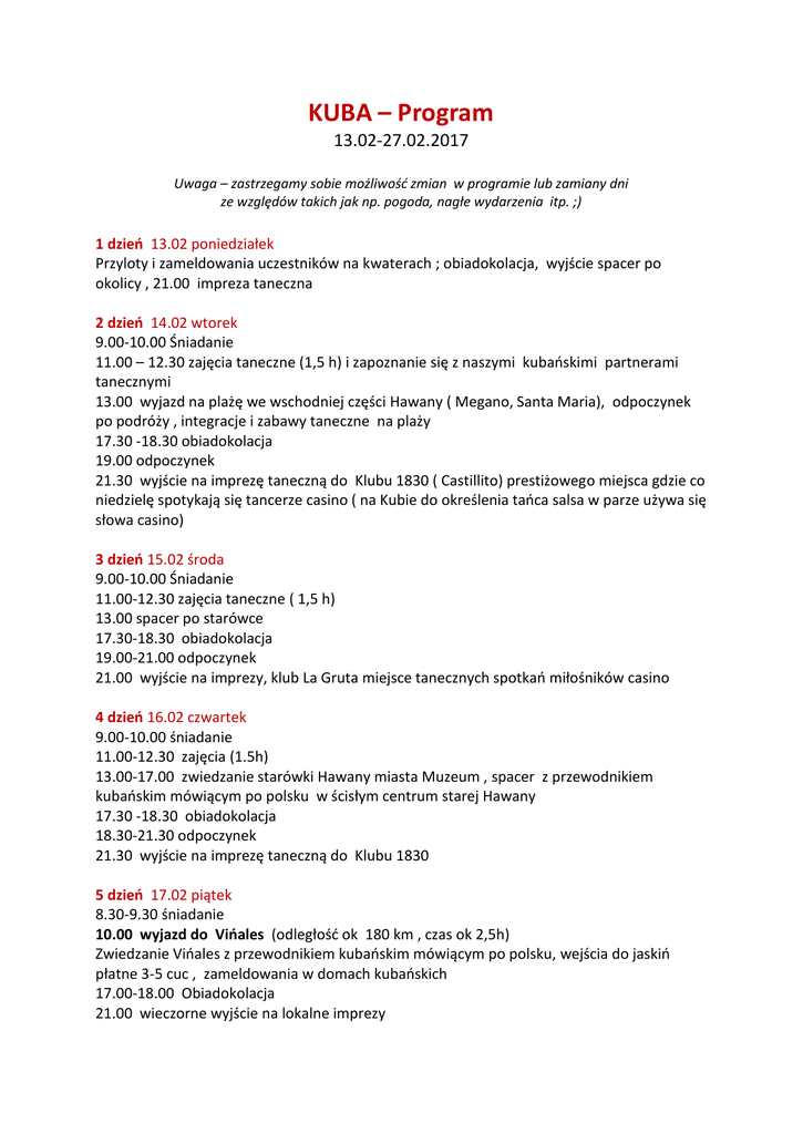 KUBA – Program 13.02-27.02.2017 Uwaga – zastrzegamy sobie możliwość zmian w programie lub zamiany dni ze względów takich jak np. pogoda, nagłe wydarzenia itp. ;) 1 dzień 13.02 poniedziałek Przyloty i zameldowania uczestników na kwaterach ; obiadokolacja, wyjście spacer po okolicy , 21.00 impreza taneczna 2 dzień 14.02 wtorek 9.00-10.00 Śniadanie 11.00 – 12.30 zajęcia taneczne (1,5 h) i zapoznanie się z naszymi kubańskimi partnerami tanecznymi 13.00 wyjazd na plażę we wschodniej części Hawany ( Megano, Santa Maria), odpoczynek po podróży , integracje i zabawy taneczne na plaży 17.30 -18.30 obiadokolacja 19.00 odpoczynek 21.30 wyjście na imprezę taneczną do Klubu 1830 ( Castillito) prestiżowego miejsca gdzie co niedzielę spotykają się tancerze casino ( na Kubie do określenia tańca salsa w parze używa się słowa casino) 3 dzień 15.02 środa 9.00-10.00 Śniadanie 11.00-12.30 zajęcia taneczne ( 1,5 h) 13.00 spacer po starówce 17.30-18.30 obiadokolacja 19.00-21.00 odpoczynek 21.00 wyjście na imprezy, klub La Gruta miejsce tanecznych spotkań miłośników casino 4 dzień 16.02 czwartek 9.00-10.00 śniadanie 11.00-12.30 zajęcia (1.5h) 13.00-17.00 zwiedzanie starówki Hawany miasta Muzeum , spacer z przewodnikiem kubańskim mówiącym po polsku w ścisłym centrum starej Hawany 17.30 -18.30 obiadokolacja 18.30-21.30 odpoczynek 21.30 wyjście na imprezę taneczną do Klubu 1830 5 dzień 17.02 piątek 8.30-9.30 śniadanie 10.00 wyjazd do Vińales (odległość ok 180 km , czas ok 2,5h) Zwiedzanie Vińales z przewodnikiem kubańskim mówiącym po polsku, wejścia do jaskiń płatne 3-5 cuc , zameldowania w domach kubańskich 17.00-18.00 Obiadokolacja 21.00 wieczorne wyjście na lokalne imprezy 6 dzień 18.02 sobota 9.00-10.00 śniadanie 10.30 zwiedzanie Vińales cd z przewodnikiem; dla chętnych przejażdżka na koniu lub rowerze (10 cuc), druga opcja wyjazd na plaże Cayo Jutias ( 60 km do Vińales) Powrót do Hawany 17.30 -18.30 Obiadokolacja 18.30 odpoczynek 22.00 wieczorne wyjście na lokalne imprezy 7 dzień 19.02 niedziela 9.00- 10.00 śniadanie 11.00-12.30 zajęcia taneczne (1,5h) 13.00 -17.00 zwiedzanie Hawany z przewodnikiem kubańskim mówiącym po polsku 17.30-18.30 obiadokolacja 18.30-21.00 odpoczynek 21.30 Wyjście na imprezy – klub 1830, koncerty, inne 8 dzień 20.02 poniedziałek 8.30-9.30 śniadanie 10.00 wyjazd wyjazd do Trynidad ( 350 km od Hawany , czas podróży ok 4,5h) zameldowania w domach w Trynidadzie Spacer po Trynidadzie z przewodnikiem lub odpoczynek na plaży 17.00-18.30 obiadokolacja 18.30-21.00 odpoczynek 21.00 wspólne wyjście na spacer, imprezy, koncerty - i zapoznanie naszych nowych nauczycieli tańca ze studia salsy w Trynidadzie 9 dzień 21.02 wtorek 8.30-9.30 śniadanie 10.00-12.00 zajęcia taneczne ( 1,5h) 12.00 Wycieczki do wyboru * Góry Escambray Topes de Collantes w którym znajduje się Narodowy Park Przyrody. Czekają nas na wysokości ok 800 m n.p.m. przepiękne widokowe miejsca, krystalicznie czyste powietrze, płyniemy motorówką po 20 km rzece Hanabanilla , dojeżdżamy do malowniczego miejsca z wodospadami i kąpielą w naturalnych kaskadach (Cena : 30 cuc) * Zwiedzanie okolic na koniu, dojazd do malowniczej kaskady, na miejscu kąpiel i odpoczynek w niezwykle urokliwym, malowniczym parku przyrody ( Cena :20 cuc) * Wyprawa dla nurków ( do ustalenia w zależności od miejsca, czasu i ilości nurkowań) * Odpoczynek na plaży Ancon, tym razem okazja poznania pejzaży południowych plaż wyspy 18.00 Obiadokolacja 21.00 Wyjście na imprezy 10 dzień 22.02 środa 9.00-10.00 śniadanie 10.00-12.00 zajęcia taneczne (1.5 h) 12.00 Wycieczki opcje do wyboru jak wyżej 18.00 Obiadokolacja 21.00 Wyjście na imprezy 11 dzień 23.02 czwartek 7.30- 8.30 śniadanie 9.00 powrót do Hawany 17.30 -18.30 obiadokolacja 18.30-21.30 odpoczynek 21.30 Salsoteka w Klubie 1830, wolny czas spacery na Malecon 12 dzień 24.02 piątek 9.00-10.00 Śniadanie 11.00-13.00 zajęcia taneczne (1,5h) 13.00 zwiedzanie miasta z przewodnikiem kubańskim mówiącym po polsku c.d 13.00 17.30-18.30 Obiadokolacja 18.30 opdoczynek 21.30 wyjście na wieczorną imprezę , spacer, wieczór na tarasie w hotelu Inglaterra 13 dzień 25.02 sobota 9.00-10.00 Śniadanie 11.00-12.30 zajęcia taneczne (1,5h) 13.00 -15.00 zwiedzanie Hawany cd dzielnica Regla, 15.00 -17.00 odwiedzenie największego targowiska w Hawanie, zakup pamiątek lub spacer po starówce 17.30-18.30 Obiadokolacja 18.30 opdoczynek 21.00 wyjsćie na wieczorne imprezy taneczne , spacery, Malecon itp. 14 dzień 26.02 niedziela 9.00-10.00 śniadanie 10.30 czas wolny, pożegnalny dzień na plaży 17.30-18.30 Obiadokolacja 21.00 wyjście na imprezę pożegnalną do klubu 1830 15 dzień 27.02 poniedziałek Wyloty UWAGA !!! W Polsce lądujemy 28-go we wtorek Dodatkowe możliwe atrakcje poza programem grupy ! REWIA TROPICANA Odwiedzenie legendarnej rewii pod gołym niebem Tropicana - 85 - 95 cuc w zależności od odległości stolika od sceny , w cenie ¼ butelki rumu Havana Club, zakąska, kawa. W rewii udział bierze ok 200 Artystów, ogromna orkiestra, robi wrażenie, sama byłam kilka razy i zawsze chętnie wracam. Wprawdzie wiele osób nazywa rewię komercyjną , ale należy do największych rewii na świecie pod gołym i robi wrażenie. Cienaga de Zapata Narodowy Park Kuby jednodniowa wycieczka z Hawany do prowincji Matanzas, na południe wyspy, zwiedzanie Farmy Krokodyli oraz wyspy skansenu Indian Tainos -poznanie zwyczajów rdzennych mieszkańców Kuby z przed Kolumba - koszt ok 45 cuc Wycieczki do osiągalnych miasteczek blisko Hawany np. stolica rumby Matanzas ok 120 km od Hawany, ponieważ był to jeden z największych ośrodków handlu żywym towarem ( czyt niewolnikami z Afryki . Matanzas dzięki wspaniałej architekturze zwane jest czasem Kubańskimi Atenami, transport w obie strony koszt max 15 cuc. Soroa 75 km od Hawany, niezwykle malownicza , popularna , malutka miejscowość wypoc