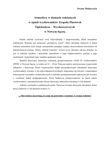Iwona Mularczyk Atmosfera w domach rodzinnych w opinii wychowanków Zespołu Placówek Opiekuńczo – Wychowawczych w Nowym Sączu. Każda rodzina wytwarza swój indywidualny i niepowtarzalny układ stosunków rodzinnych. Rodzina jest miejscem „przepływu uczuć”, które określają właściwą w danej rodzinie atmosferę czyli relacje emocjonalne panujące między domownikami niezależnie od deklarowanych postaw. Dobry „klimat rodzinny” tworzy m.in. dawanie odczuć dziecku, że jest w rodzinie kochane i potrzebne, zatroskanie o jego bezpieczeństwo, pamięć o jego urodzinach i imieninach oraz wspólne spędzanie świąt. Badania dotyczące atmosfery rodzinnej przeprowadzono wśród 20 wychowanków ZPOW w Nowym Sączu, w wieku od 14 – 18 lat. Podczas analizy porównywano wypowiedzi chłopców i dziewcząt. Przed rozpoczęciem badań przeanalizowano informacje dotyczące wychowanków zawarte w ich indywidualnych teczkach. Zapoznano się również z materiałami dotyczącymi wywiadów środowiskowych o rodzinie, postanowieniami sądowymi jak również z wynikami badań pedagogicznych. Pracę badawczą przeprowadzono na bazie ankiet wychowanków i przeanalizowano obszar dotyczący atmosfery rodzinnej w ich domach. Ankieta zawierała 6 zamkniętych pytań. Pierwsza kwestia dotyczyła akceptacji dzieci przez rodziców w ich domach (wykres 1). „ Moi rodzice sprawiają, że czuje się potrzebny i kochany w swojej rodzinie” 70 60 50 40 % 30 dziewczęta 20 chłopcy 10 0 w pra t ak, ze aw s ie z s am c za i nigd y Wykres. 1. Opinia badanych na temat akceptacji ich przez rodziców Dziecko w rodzinie powinno czuć się potrzebne, kochane i być akceptowane. Z wykresu wynika jednak, że odczucia dzieci są różne. Najwięcej, bo aż 70% chłopców twierdzi, że we własnych rodzinach, prawie zawsze, czują się akceptowani. Żaden z nich nie zasygnalizował, że w jego rodzinie doświadcza, że jest niepotrzebny i nie kochany co natomiast stwierdziło aż 20% badanych dziewcząt. Drugi badany problem dotyczył kwestii bezpieczeństwa dziecka w rodzinie (wykres 2). „Gdy długo nie wracam, najbardziej martwi się” 60 50 40 % 30 dziewczęta chłopcy 20 10 0 m am a tata ro dze ństwo a ro dzin s ię artwią nie m Wykres. 2. Opinia badanych na temat kto najbardziej martwi się o nich w ich rodzinach. Z wykresu wynika, że w przypadku troski rodziców w opinii respondentów najlepiej wypadła mama - tak stwierdziło 60% badanych chłopców i 50% dziewcząt. Ani jedna badana osoba nie wymieniła zatroskania o nich ze strony ojca. Ponadto ankietowani wymieniali rodzeństwo i inne osoby z rodziny, które martwią się w takich sytuacjach o nich. Bardzo ważnym czynnikiem wpływającym na atmosferę rodzinną jest pamięć o imieninach, urodzinach i innych świętach dziecka. Problem ten stanowił kolejny punkt ankiety (wykres 3). „W domu pamięta się o urodzinach i imieninach, rocznicach” 90 80 70 60 % 50 40 dziewczęta 30 chłopcy 20 10 0 tak nie t ięta m a p ylko i się o dz h c ob nie Wykres. 3. Opinia badanych na temat uroczystości rodzinnych w ich domach. Kontynuowanie tradycji i pamiętanie o ważniejszych uroczystościach rodzinnych jest ważne dla scalenia rodziny. Analiza badań wykazała, że w domach rodzinnych wychowanków często pamięta się o urodzinach i imieninach. Takie zdanie podziela aż 90% badanych dziewcząt i 60% badanych chłopców. Tylko 20% ankietowanych chłopców uważa, że w ich domach rodzinnych nie obchodzi się takich uroczystości. Klimat rodzinny tworzy również wspólne spędzanie świąt – kwestie tę poruszono w kolejnym pytaniu (wykres 4). „ Święta spędzam w gronie rodzinnym” 70 60 50 40 % 30 dziewczęta 20 chłopcy 10 0 aw , pr t ak sz aw ie z e tylk za oc ni i sam o st t e je d la m w nie e ażn Wykres. 4. Opinia badanych na temat spędzania świąt w gronie rodzinnym. Jak wynika z wykresu zarówno 70% chłopców jak i 70% dziewcząt stwierdziło, że święta spędzają wspólnie z rodziną. Tylko 30% chłopców stwierdziło, że nie ma to dla nich większego znaczenia, gdzie spędzą święta. Poprawienie sytuacji w domach rodzinnych wychowanków wymaga licznych zmian zarówno ze strony dzieci jak również ich rodziców. W kolejnym punkcie zapytano dzieci jakiej rodziny życzyłaby sobie (wykres 5). „Najbardziej chciałbym, aby w mojej rodzinie” 40 35 30 25 % 20 15 dziewczęta chłopcy 10 5 0 i lu ra ie ść yć mn icam o ho lic z os fe k z liwo a l l z d e m a i t c d o ży iej zr sieb za a as u mn na ow a j cz leps a e m n c z ż ro wie mo Wykres. 5. Opinia badanych na temat czego chcieliby w swojej rodzinie. Analiza zebranych danych wykazała, że wychowankowie najbardziej chcieli, by w ich rodzinach panowała lepsza atmosfera i aby rodzice więcej z nimi rozmawiali. Wybrało taką odpowiedź 20% dziewcząt i więcej, bo 40% badanych chłopców. Z wykresu wynika, że dziewczęta 40% częściej sygnalizują potrzebę rozmów z rodzicami niż chłopcy (20%). W ostatniej części ankiety zapytano dzieci, co tak najbardziej przeszkadza im w ich rodzinnych domach (wykres 6). „Najbardziej w mojej rodzinie przeszkadza mi” 40 35 30 25 % 20 15 dziewczęta chłopcy 10 5 0 zm k ro br a owy l oho alk k łó tn ie o ją am a ni w o res inte a z k br a w e bą ków cz n az ó o so iąz fizy za k ow y o r b ż a o k du iele tw zby Wykres. 6. Opinia badanych na temat co w ich rodzinach najbardziej im przeszkadza. Niepokojące dane przedstawiają kolejne informacje dotyczące rodziny badanych. Najbardziej przeszkadzam im alkohol w rodzinie, tak stwierdziło 40% dziewcząt i 30% badanych chłopców, brak rozmów - 20% dziewcząt i 30% chłopców oraz kłótnie w przypadku 20% dziewcząt i 10% chłopców. Wychowankowie, którzy trafili do Zespołu Placówek Opiekuńczo - Wychowawczych w Nowym Sączu pochodzą z trudnych środowisk rodzinnych. Na ogół są to rodziny dysfunkcyjne (alkoholizujące się, niewydolne wychowawczo, zaniedbu
