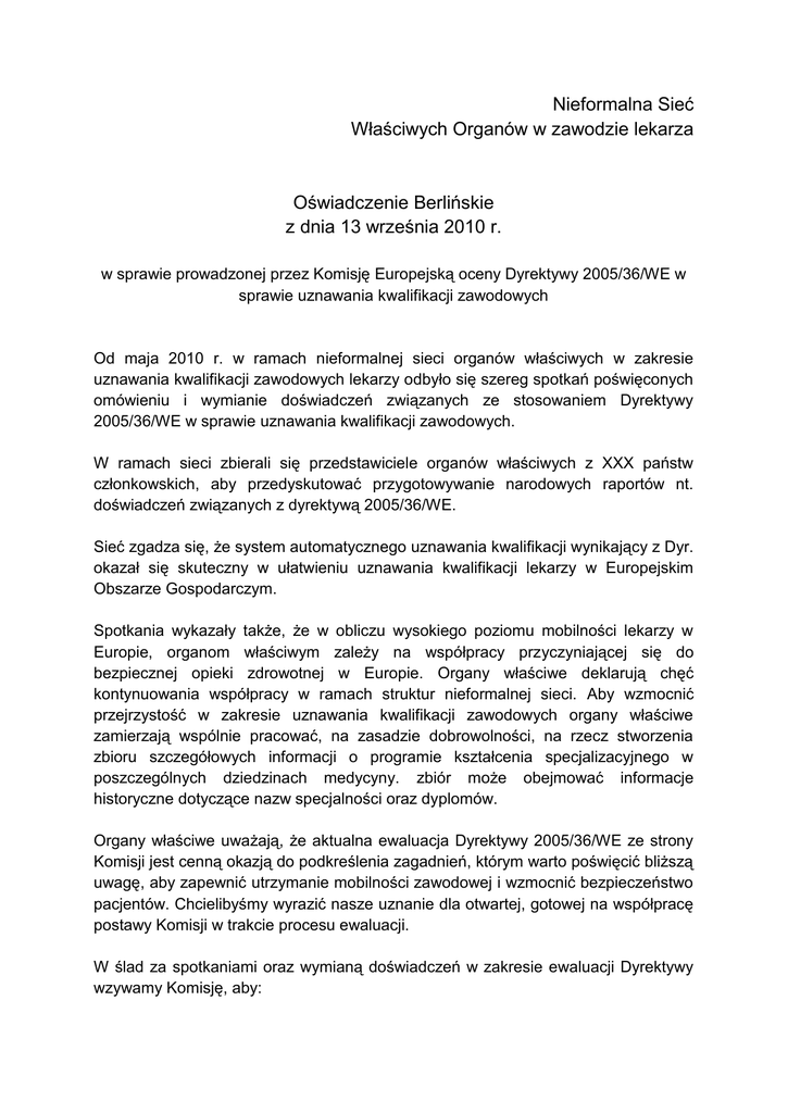 Nieformalna Sieć Właściwych Organów w zawodzie lekarza Oświadczenie Berlińskie z dnia 13 września 2010 r. w sprawie prowadzonej przez Komisję Europejską oceny Dyrektywy 2005/36/WE w sprawie uznawania kwalifikacji zawodowych Od maja 2010 r. w ramach nieformalnej sieci organów właściwych w zakresie uznawania kwalifikacji zawodowych lekarzy odbyło się szereg spotkań poświęconych omówieniu i wymianie doświadczeń związanych ze stosowaniem Dyrektywy 2005/36/WE w sprawie uznawania kwalifikacji zawodowych. W ramach sieci zbierali się przedstawiciele organów właściwych z XXX państw członkowskich, aby przedyskutować przygotowywanie narodowych raportów nt. doświadczeń związanych z dyrektywą 2005/36/WE. Sieć zgadza się, że system automatycznego uznawania kwalifikacji wynikający z Dyr. okazał się skuteczny w ułatwieniu uznawania kwalifikacji lekarzy w Europejskim Obszarze Gospodarczym. Spotkania wykazały także, że w obliczu wysokiego poziomu mobilności lekarzy w Europie, organom właściwym zależy na współpracy przyczyniającej się do bezpiecznej opieki zdrowotnej w Europie. Organy właściwe deklarują chęć kontynuowania współpracy w ramach struktur nieformalnej sieci. Aby wzmocnić przejrzystość w zakresie uznawania kwalifikacji zawodowych organy właściwe zamierzają wspólnie pracować, na zasadzie dobrowolności, na rzecz stworzenia zbioru szczegółowych informacji o programie kształcenia specjalizacyjnego w poszczególnych dziedzinach medycyny. zbiór może obejmować informacje historyczne dotyczące nazw specjalności oraz dyplomów. Organy właściwe uważają, że aktualna ewaluacja Dyrektywy 2005/36/WE ze strony Komisji jest cenną okazją do podkreślenia zagadnień, którym warto poświęcić bliższą uwagę, aby zapewnić utrzymanie mobilności zawodowej i wzmocnić bezpieczeństwo pacjentów. Chcielibyśmy wyrazić nasze uznanie dla otwartej, gotowej na współpracę postawy Komisji w trakcie procesu ewaluacji. W ślad za spotkaniami oraz wymianą doświadczeń w zakresie ewaluacji Dyrektywy wzywamy Komisję, aby: Kontynuowała identyfikację organów właściwych w zakresie uznawania kwalifikacji lekarzy; zobowiązała organy właściwe, aby były wymienione w systemie informacyjnym rynku wewnętrznego (IMI); zobowiązała organy właściwe do udzielania we właściwym czasie odpowiedzi na wszystkie wnioski bez względu na to, czy zostały wysłane w ramach IMI czy innymi środkami; udoskonaliła system IMI w taki sposób, aby umożliwiał organom właściwym źródłową weryfikację dokumentów. Przeanalizowała we współpracy z organami właściwymi odpowiednie mechanizmy zapewniania kompetencji lekarzy (np. doskonalenie zawodowe, rewalidacja itd.). To wzmocni zaufanie w ramach uznawania kwalifikacji zawodowych i zapewni bezpieczeństwo pacjentów, pozwalając organom właściwym upewnić się, że lekarze, których rejestrują, doskonalili swoje kompetencje i umiejętności po uzyskaniu dyplomu lekarza. Rozważyła dołączenie Zaświadczenia o Aktualnym Statusie Zawodowym / Zaświadczenia o Niekaralności (Certificate of Current Professional Status / Certificate of Good Standing) do wykazu dokumentów w załączniku VII. Zbadała mechanizmy, takie jak mechanizm ostrzegania przewidziany w dyrektywie o usługach na rynku wewnętrznym, które poprawią wymianę informacji o lekarzach mających znaczenie dla bezpieczeństwa pacjentów w Europie oraz dla kompetencji zawodowych. Ułatwiła identyfikację organów właściwych w zakresie odpowiedzialności zawodowej lekarzy w celu zapewnienia, że tylko lekarze spełniający wymogi fachowej i bezpiecznej praktyki zawodowej będą korzystać ze swobody przemieszczania się w ramach EOG. Zapewniła przejrzystość prawną w odniesieniu do nadzoru nad należytym wykonywaniem zawodu w przypadku transgranicznego świadczenia usług. Należy to rozważyć także w świetle rozwoju telemedycyny i diagnozowania na odległość, gdy ani pacjent, ani lekarz nie przemieszczają się fizycznie. Przedstawiła wyjaśnienia dotyczące pojęcia „czasowo i okazjonalnie”; wspomogła organy właściwe w wypracowaniu wspólnych metod postępowania w odniesieniu do przypadków ponawiania deklaracji o zamiarze czasowego i okazjonalnego świadczenia usług (np. mobilność sezonowa). Przeanalizowała przepisy Dyrektywy dotyczące znajomości języka pod kątem troski organów właściwych o odpowiednią znajomość języka przez migrujących lekarzy w interesie bezpieczeństwa pacjentów. Przeanalizowała w trakcie ewaluacji Dyrektywy coraz częstsze przypadki fałszowania dokumentów oraz znalazła środki efektywnego zwalczania takiego procederu. Dalsze informacje oraz przykłady konkretnych przypadków wspierające niniejsze oświadczeni zawarte są w krajowych raportach przedstawionych Komisji Europejskiej przez organy właściwe we wrześniu 2010 r.