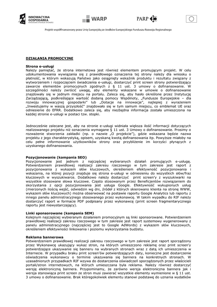 DZIAŁANIA PROMOCYJNE Strona e-usługi Należy pamiętać, że strona internetowa jest również elementem promującym projekt. W celu udokumentowania wywiązania się z prawidłowego oznaczenia tej strony należy dla wniosku o płatność, w którym wskazują Państwo jako osiągnięty wskaźnik produktu i rezultatu związany z wytworzeniem i rozpoczęciem świadczenia e-usługi, dostarczyć print screen strony potwierdzający zawarcie elementów promocyjnych zgodnych z § 11 ust. 3 umowy o dofinansowanie. W szczególności należy zwrócić uwagę, aby elementy wskazane w umowie o dofinansowanie znajdowały się w jednym miejscu na portalu. Zaleca się, aby hasło określone przez Instytucję Zarządzającą, podkreślające wartość dodaną pomocy Wspólnoty, „Fundusze Europejskie – dla rozwoju innowacyjnej gospodarki” lub „Dotacje na innowacje”, najlepiej z wyrażeniem „Inwestujemy w waszą przyszłość” znajdowało się w tym samym miejscu, co emblemat UE oraz odniesienie do EFRR. Dodatkowo zaleca się, aby niezbędna informacja została umieszczona na każdej stronie e-usługi w postaci tzw. stopki. Jednocześnie zalecane jest, aby na stronie e-usługi widniała większa ilość informacji dotyczących realizowanego projektu niż oznaczenia wymagane § 11 ust. 3 Umowy o dofinansowanie. Prosimy o rozważenie stworzenia zakładki (np. o nazwie „O projekcie”), gdzie wskazana będzie nazwa projektu z jego charakterystyką, opisem, uzyskaną kwotą dofinansowania itp. Powyższe miałoby na celu pełne informowanie użytkowników strony oraz przybliżenie im korzyści płynących z uzyskanego dofinansowania. Pozycjonowanie (kampania SEO) Pozycjonowanie jest jednym z najczęściej wybieranych działań promujących e-usługę. Potwierdzeniem prawidłowej realizacji zakresu rzeczowego w tym zakresie jest raport z pozycjonowania z wykazem słów kluczowych, określeniem efektywność pozycjonowania i wskazania, na której pozycji znajduje się strona e-usługi w odniesieniu do wszystkich słów/fraz kluczowych w wyszukiwarce. Dodatkowo należy dostarczyć print screen’y z wyszukiwarki na wszystkie stosowane słowa kluczowe. Często stosowanym przez Beneficjentów rozwiązaniem do skorzystania z opcji pozycjonowania jest usługa Google. Efektywność wykupionych usług (mierzonych ilością wejść, odwiedzin wg dni, źródeł z których skierowano klienta na stronę WWW, wykazem słów kluczowych) można obserwować na postawie raportu Google Analytics lub raportu z innego panelu administracyjnego stosowanego przez wykonawcę. W takim wypadku do RIF należy dostarczyć raport w formacie PDF podpisany przez wykonawcę (print screen fragmentarycznego raportu jest niewystarczający). Linki sponsorowane (kampania SEM) Kolejnym najczęściej wybieranym działaniem promocyjnym są linki sponsorowane. Potwierdzeniem prawidłowej realizacji zakresu rzeczowego w tym zakresie jest raport systemowy wygenerowany z panelu administracyjnego (najczęściej jest to Google AdWords) z wykazem słów kluczowych, określeniem efektywności linkowania i poziomu wykorzystania budżetu. Reklama bannerowa Potwierdzeniem prawidłowej realizacji zakresu rzeczowego w tym zakresie jest raport sporządzony przez Wykonawcę ukazujący wykaz stron, na których umieszczono reklamę oraz print screen’y potwierdzające ukazywanie się banneru na wybranych stronach wraz z datą ich umieszczenia w Internecie. W przypadku braku print screen’ów potwierdzających daty, konieczne jest dostarczenie oświadczenia wykonawcy o terminie ukazywania się bannera na konkretnych stronach. W uzasadnionych przypadkach RIF wzywa do dostarczenia oświadczeń sporządzonych przez właścicieli portali/stron internetowych, na których umieszczana była reklama. Należy również dostarczyć wersję elektroniczną bannera. Przypominamy, że zarówno wersja elektroniczna bannera jak i wersja stanowiąca print screen ze stron musi zawierać wszystkie elementy wymienione w § 11 ust. 3 umowy o dofinansowanie. Brak któregokolwiek elementu stanowi podstawę do uznania wydatków za niekwalifikowane, chyba że podejmą Państwo działania naprawcze, o których mowa w dalszej części niniejszego maila. Artykuły sponsorowane w Internecie Potwierdzeniem prawidłowej realizacji zakresu rzeczowego w tym zakresie jest wersja elektroniczna artykułu sponsorowanego wraz z print screen’ami ze stron, na których artykuł został zamieszczony. Należy również dostarczyć wersję elektroniczną bannera. Przypominamy, że zarówno wersja elektroniczna artykułu jak i wersja stanowiąca print screen ze stron musi zawierać wszystkie elementy wymienione w § 11 ust. 3 umowy o dofinansowanie. Brak któregokolwiek elementu stanowi podstawę do uznania wydatków za niekwalifikowane, chyba że podejmą Państwo działania naprawcze, o których mowa w dalszej części niniejszego maila. e-mailing Potwierdzeniem prawidłowej realizacji zakresu rzeczowego w tym zakresie jest print screen treści maila ze skrzynki pocztowej z ukazaną datą i godziną wysyłki (nie tekst w formie WORD) oraz raport mailingowy potwierdzający do ilu odbiorców mailing trafił oraz jakie są efekty niniejszego elementu promocji Projektu. W raporcie powinna zostać zawarta informacja o kryteriach doboru adresów do mailingu (np. kobiety w wieku 30-50 lat, wykształcenie co najmniej średnie). Raport powinien zostać sporządzony przez Wykonawcę usługi. Przypominamy, że w treści maila należy zawrzeć wszystkie elementy wymienione w § 11 ust. 3 umowy o dofinansowanie. Brak któregokolwiek elementu stanowi podstawę do uznania wydatków za niekwalifikowane, chyba że podejmą Państwo działania naprawcze, o których mowa w dalszej części niniejszego maila. Promocja w czasopismach (reklama, artykuł sponsorowany) Potwierdzeniem prawidłowej realizacji zakresu rzeczowego w tym zakresie jest kopia strony gazety z widoczną reklamą oraz numerem strony gazety 
