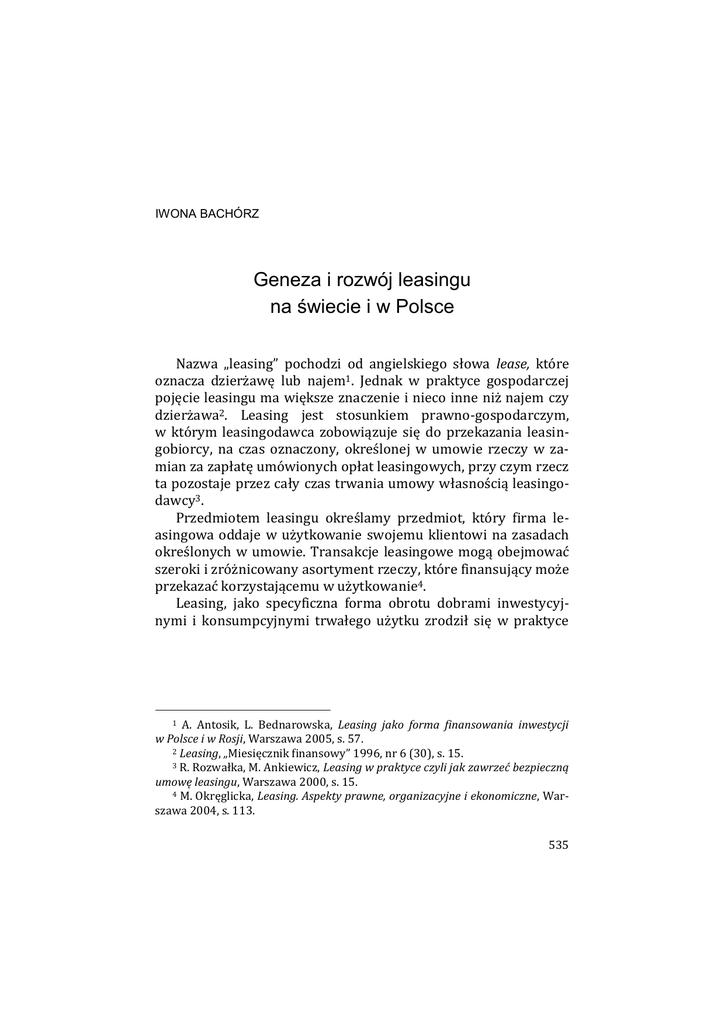 IWONA BACHÓRZ Geneza i rozwój leasingu na świecie i w Polsce Nazwa „leasing” pochodzi od angielskiego słowa lease, które oznacza dzierżawę lub najem1. Jednak w praktyce gospodarczej pojęcie leasingu ma większe znaczenie i nieco inne niż najem czy dzierżawa2. Leasing jest stosunkiem prawno-gospodarczym, w którym leasingodawca zobowiązuje się do przekazania leasingobiorcy, na czas oznaczony, określonej w umowie rzeczy w zamian za zapłatę umówionych opłat leasingowych, przy czym rzecz ta pozostaje przez cały czas trwania umowy własnością leasingodawcy3. Przedmiotem leasingu określamy przedmiot, który firma leasingowa oddaje w użytkowanie swojemu klientowi na zasadach określonych w umowie. Transakcje leasingowe mogą obejmować szeroki i zróżnicowany asortyment rzeczy, które finansujący może przekazać korzystającemu w użytkowanie4. Leasing, jako specyficzna forma obrotu dobrami inwestycyjnymi i konsumpcyjnymi trwałego użytku zrodził się w praktyce 1 A. Antosik, L. Bednarowska, Leasing jako forma finansowania inwestycji w Polsce i w Rosji, Warszawa 2005, s. 57. 2 Leasing, „Miesięcznik finansowy” 1996, nr 6 (30), s. 15. 3 R. Rozwałka, M. Ankiewicz, Leasing w praktyce czyli jak zawrzeć bezpieczną umowę leasingu, Warszawa 2000, s. 15. 4 M. Okręglicka, Leasing. Aspekty prawne, organizacyjne i ekonomiczne, Warszawa 2004, s. 113. 535 Iwona Bachórz gospodarczej USA we wczesnych latach 505. W Polsce pierwsze firmy leasingowe zaczęły powstawać na początku lat 906. Obecnie występuje wiele rodzajów i form leasingu. Ich wyróżnianie następuje zgodnie z przyjętymi kryteriami, którymi mogą być: cel, sposób finansowania, przedmiot umowy leasingu, itp.7 Najbardziej powszechnym sposobem podziału umów leasingu jest podział na leasing operacyjny i finansowy. W leasingu operacyjnym przedmiot leasingu jest własnością leasingodawcy i przez niego jest amortyzowany. Korzystający używa tego przedmiotu lub używa i pobiera pożytki, płacąc za to czynsz leasingowy. Korzystający ma prawo pierwokupu przedmiotu leasingu przed osobami trzecimi. Przeniesienie prawa własności następuje albo na mocy odrębnej umowy sprzedaży poleasingowej, albo na mocy odpowiednio sformułowanej umowy leasingu8. W leasingu finansowym finansujący przekazuje przedmiot leasingu korzystającemu wraz z prawem do aktywowania go i amortyzowania. Korzystający traktuje ten przedmiot jak własny składnik aktywów trwałych, chociaż prawnie jest to własność finansującego. Po zapłaceniu ostatniej raty kapitałowej finansujący przenosi prawo własności na rzecz korzystającego, o ile umowa leasingu nie przewiduje innych opcji9. Biorąc pod uwagę liczbę stron biorących udział w transakcjach leasingowych wyróżniamy leasing bezpośredni i pośredni10. Leasing bezpośredni występuje wtedy, gdy producenci określonych wyrobów oddają je innym firmom do użytkowania. Producent wyrobu sam zwraca się do potencjalnych użytkowników J. Poczobut, Umowa leasingu, Warszawa 2002, s. 1. Leksykon leasingu i motoryzacji, pod patronatem Masterlease, Wrocław 2008, s. 23. 7 W. Dębski, K. Kozera, Leasing czy kredyt, Warszawa 1991, s. 19. 8 A. Korczyn, Leasing na nowych zasadach, Skierniewice 2012, s. 13. 9 Tamże, s. 13. 10 A. Dmowski, J. Sarnowski, D. Prokopowicz, Finanse i bankowość. Teoria i praktyka, s. 257. 5 6 536 Geneza i rozwój leasingu na świecie i w Polsce tego wyrobu, proponując im leasing, albo użytkownicy występują bezpośrednio z taką propozycją do producenta11. W leasingu pośrednim występują trzy podmioty. Poza producentem i użytkownikiem występuje także pośrednik, którym najczęściej jest firma leasingowa. Leasing pośredni jest droższy od bezpośredniego, ponieważ przy kalkulowaniu opłacalności tej formy leasingu trzeba wziąć pod uwagę prowizję dla firmy pośredniczącej. Umowy zawierane są zawsze na dłuższy okres, a po jej zakończeniu przedmiot leasingu zostaje u finansującego lub zostaje sprzedany osobie, która ją użytkuje, bądź osobie trzeciej12. Od 9.12.2000 r. leasing jest uregulowany w polskim Kodeksie cywilnym w artykułach od 7091 do 70918. Wcześniej występował jako umowa nienazwana. Zgodnie z treścią art. 709 k.c.1: „Przez umowę leasingu finansujący zobowiązuje się, w zakresie działalności swego przedsiębiorstwa, nabyć rzecz od oznaczonego zbywcy na warunkach określonych w tej umowie i oddać tę rzecz korzystającemu do używania albo używania i pobierania pożytków przez czas oznaczony, a korzystający zobowiązuje się zapłacić finansującemu w uzgodnionych ratach wynagrodzenie pieniężne, równe co najmniej cenie lub wynagrodzeniu z tytułu nabycia rzeczy przez finansującego”13. Leasing również znalazł zastosowanie w ustawach podatkowych, w ustawie podatkowej od osób fizycznych i ustawie podatkowej od osób prawnych, w ustawie od towarów i usług oraz w ustawie o rachunkowości. Każda dziedzina prawa tworzy samodzielną definicję leasingu, odmienne kryteria i zasady jego kwalifikowania. Kwalifikacja umowy na potrzeby prawa cywilnego nie ma istotnego wpływu na kwalifikację podatkową. W. Dębski, K. Kozera, Leasing..., op. cit., s. 19–20. M. Dragunowicz, I. Heropolitańska, W. Sendek, Finansowanie działalności gospodarczej małych i średnich przedsiębiorstw, 2005, s. 55. 13 Ustawa z dnia 26 lipca 2000 r. Kodeks cywilny (Dz. U. nr 74, poz. 857). 11 12 537 Iwona Bachórz Do zawarcia umowy leasingowej potrzebne są przynajmniej dwa podmioty gospodarcze: leasingodawca – właściciel przedmiotu leasingu oddający go w użytkowanie oraz leasingobiorca – użytkujący14. Transakcja leasingowa zawierana jest poprzez podpisanie przez obie strony umowy leasingowej, mającej na celu uregulowanie wzajemnych relacji przez cały okres trwania umowy, a także po jej zakończeniu. Stronę takiej umowy stanowią finansujący i korzystający, jednak w jej zawarciu oraz podczas realiza