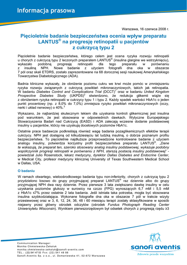Informacja prasowa Warszawa, 16 czerwca 2008 r. Pięcioletnie badanie bezpieczeństwa ocenia wpływ preparatu LANTUS® na progresję retinopatii u pacjentów z cukrzycą typu 2 Pięcioletnie badanie bezpieczeństwa, którego celem jest ocena ryzyka rozwoju retinopatii u chorych z cukrzycą typu 2 leczonych preparatem LANTUS® (insulina glargine we wstrzyknięciu), wykazało podobną progresję retinopatii dla tego preparatu w porównaniu z insuliną NPH. Nowe badanie z użyciem fotografii dna oka w obszarze 7 pól oraz skali ETDRS, zostało zaprezentowane na 68 dorocznej sesji naukowej Amerykańskiego Towarzystwa Diabetologicznego (ADA). Badnia kliniczne wykazały, że obniżenie poziomu cukru we krwi może pomóc w zmniejszeniu ryzyka rozwoju związanych z cukrzycą powikłań mikronaczyniowych, takich jak retinopatia. W badaniu Diabetes Control and Complications Trial (DCCT)1 oraz w badaniu United Kingdom Prospective Diabetes Study (UKPDS)2 stwierdzono, że redukcja glikemii wiąże się z obniżeniem ryzyka retinopatii w cukrzycy typu 1 i typu 2. Każdy spadek wartości HbA1c o jeden punkt procentowy (np. z 8,0% do 7,0%) zmniejsza ryzyko powikłań mikronaczyniowych (oczy, nerki i układ nerwowy) o 40%.3 Wykazano, że najbardziej skutecznym lekiem dla uzyskania kontroli glikemicznej jest insulina pod warunkiem, że jest stosowana w odpowiednich dawkach. Wytyczne Europejskiego Stowarzyszenia Badań nad Cukrzycą (EASD) i ADA zalecają wczesne dodanie podstawowej insuliny u pacjentów, którzy nie uzyskują docelowych poziomów HbA1c. Ostatnie prace badawcze podkreślają również wagę badania pozaglikemicznych efektów terapii cukrzycy. NPH jest dostępną od kilkudziesięciu lat ludzką insuliną, o dobrze poznanym profilu bezpieczeństwa. To pięcioletnie najdłuższe przeprowadzone kontrolowane badanie z użyciem analogu insuliny, potwierdza korzystny profil bezpieczeństwa preparatu LANTUS®. „Dane te wskazują, że preparat ten, szeroko stosowany analog insuliny podstawowej, wykazuje podobny współczynnik progresji retinopatii w porównaniu z NPH, starszą postacią insuliny podstawowej” powiedział Julio Rosenstock, lekarz medycyny, dyrektor Dallas Diabetes and Endocrine Center, w Medical City, profesor medycyny klinicznej University of Texas Southwestern Medical School w Dallas, USA. O badaniu W ramach otwartego, wieloośrodkowego badania typu non-inferiority, chorych z cukrzycą typu 2 przydzielono losowo do grupy przyjmującej preparat LANTUS® raz dziennie albo do grupy przyjmującej NPH dwa razy dziennie. Przez pierwsze 3 lata zwiększano dawkę insuliny w celu uzyskania poziomów glukozy w surowicy na czczo (FPG) wynoszących 6,7 mM i 5,5 mM z HbA1c ≤7% przez ostatnie 2 lata badania. Jeśli istniała taka potrzeba, mogła być stosowana insulina szybkodziałająca. Wykonane fotografie dna oka w obszarze 7 pól w trakcie wizyty przesiewowej oraz w 3, 6, 12, 24, 36, 48 i 60 miesiącu terapii zostały sklasyfikowane w sposób niejawny przez główny ośrodek odczytów (ośrodek Fundus Photograph Reading Center Uniwersytetu Wisconsin). Wynikiem pierwszorzędowym był odsetek chorych z progresją rzędu ≥3 Communication Manager: Monika Chmielewska-Żehaluk [email protected] T E L . : ( 22) 541 47 53 F A X : ( 2 2 ) 5 4 1 4 8 8 8 Sanofi-Aventis Sp. z o.o., ul. Domaniewska 41, 02-672 Warszawa stopnia w momencie zakończenia badania, w porównaniu ze stanem wyjściowym na skali ETDRS, opracowanej na Uniwersytecie Wisconsin. Badanie mogło wykazać non-inferiority (górna granica 95% przedziału ufności [CI] LANTUS®-NPH różnica <10%) dla progresji wynoszącej 3 lub więcej stopni na skali ETDRS. Zrandomizowano i leczono 1017 chorych. Podobne dane demograficzne w punkcie wyjścia (LANTUS® w porównaniu z NPH) obejmowały: okres występowania cukrzycy (10,7 w porównaniu z 10,8 lat), BMI (34,5 w porównaniu z 34,1 kg/m2) lub czas trwania terapii doustnej (9,0 w porównaniu do 8,9 lat), wcześniejsze stosowanie insuliny (67 w porównaniu do 70%), HbA1c (8,4 w porównaniu z 8,3%) i FPG (10,5 w porównaniu z 10,0 mM). Retinopatia cukrzycowa w punkcie wyjściowym (15,6 w porównaniu z 12,1%) przeważała w grupie LANTUS®, a wynik ETDRS w punkcie wyjściowym był wyższy (3,06 w porównaniu z 2,85). Pomimo tego, dla progresji retinopatii stopnia 3 dla preparatu LANTUS® w porównaniu z NPH, stwierdzono nie mniejszą skuteczność (non-inferiority) w populacji per protocol (14,2 w porównaniu z 15,7%), różnica –1,98 (95% CI –7,02, 3,06) i potwierdzono w populacji intent-to-treat (12,5 w porównaniu z 14,6%), różnica –2,10 (95% CI –6,29, 2,09). Obie grupy osiągnęły średni wynik FPG 7,7 mM w punkcie końcowym, pomimo trendu w kierunku mniejszego wykorzystania insuliny podstawowej (62 w porównaniu do 72 IU) w grupie leczonej preparatem LANTUS®. Redukcja HbA1c w stosunku do punktu wyjściowego w punkcie końcowym w grupie NPH przekraczała tę z grupy LANTUS® o 0,21%. Ta różnica leży w dopuszczalnym zakresie równoważności. Zaobserwowano trendy w kierunku mniejszego przybierania na wadze (3,0 w porównaniu z 4,3 kg w okresie 5 lat) i niższe współczynniki dla wszystkich kategorii hipoglikemii od Miesiąca 3 w grupie LANTUS®. Informacje dotyczące rekombinacji DNA]) preparatu LANTUS® (insulina glargine [wytwarzana metodą Insulina LANTUS® jest przeznaczona do podawania podskórnego, raz dziennie, w leczeniu dorosłych z cukrzycą typu 2, którzy wymagają insuliny długodziałającej do kontrolowania hiperglikemii oraz w leczeniu pacjentów dorosłych i dzieci (od 6 roku życia.) z cukrzycą typu 1. LANTUS® wykazuje stałą, przedłużoną i powolną absorpcję oraz stosunkowo stały profil działania na przestrzeni 24 godzin. Preparat LANTUS® to numer jeden wśród insulin przepisywanych chorym na całym świecie. Informacje dotyczące preparatu APIDRA® (insulina glulizynowa [wytwarzana metodą rekombinacji DNA]) APIDRA® to szybkodziałający an
