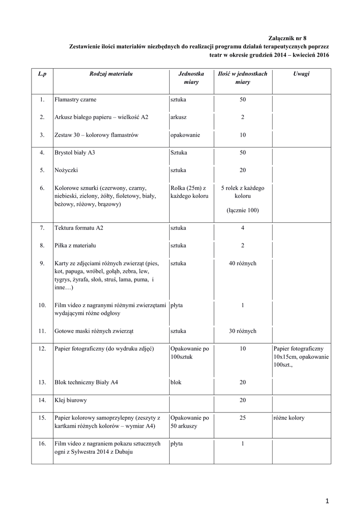 Zał. nr 8_Teatroterapia_zestawienie ilości materialow