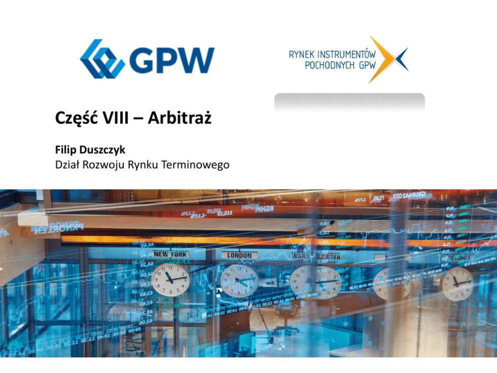 Część VIII – Arbitraż Filip Duszczyk Dział Rozwoju Rynku Terminowego Agenda 1. Pozycje syntetyczne 2. Konwersje/rewersale 3. Ryzyka arbitrażu 4. Boxes 5. Syntetyki i spready 6. Zadanie domowe Pozycje syntetyczne • Opcje to specyficzne instrumenty finansowe, które możemy łączyć z innymi opcjami i w rezultacie osiągać pozycje imitujące inne opcje, instrumenty bazowe lub ich kombinacje. • Powiedzmy, że w portfelu mamy natępującą pozycję opcyjną: + 1 wrześniowy 1000 Call - 1 wrześniowy 1000 Put • Zobaczmy jak zachowuje się pozycja w dniu wygaśnięcia: - Kurs rozliczeniowy > 1000 Call wykonany = nabycie instrumentu bazowego za 1000* Put nie wykonany = bez rozliczenia - Kurs rozliczeniowy < 1000 Call nie wykonany = bez rozliczenia Put wykonany = nabycie instrumentu bazowego za 1000* *Na GPW opcje rozliczane są pieniężnie, bez fizycznej dostawy instrumentu bazowego Pozycje syntetyczne • Pozycja: + 1 wrześniowy 1000 Call - 1 wrześniowy 1000 Put • Pomijając sytuację kiedy kurs rozliczeniowy = 1000, widzimy że tak naprawdę nie ma znaczenia na jakim poziomie będzie instrument bazowy w dniu wygaśnięcia wrześniowych opcji. Wynik zawsze będzie ten sam – nabycie instrumentu bazowego przez wybór (Call), albo przez zobowiązanie (Put). • Na powyższą pozycję mówimy: syntetyczna długa pozycja w instrumencie bazowym (synthetic long underlying) • Pozycja przeciwna (- 1 wrześniowy 1000 Call, + 1 wrześniowy 1000 Put) nazywana jest syntetyczną krótka pozycją w instrumencie bazowym (synthetic short underlying). Pozycje syntetyczne • Możemy stwierdzić następujące założenia: - syntetyczna długa pozycja w instrumencie bazowym = długi Call + krótki Put - syntetyczna krótka pozycja w instrumencie bazowym = krótki Call + długi Put …gdzie wszystkie opcje wygasają w tym samym terminie i mają ten sam kurs wykonania • Pozycja syntetyczna zachowuje się mniej więcej jak instrument bazowy. • Przy wzroście instrumentu bazowego o jeden punkt, wartość syntetycznej długiej pozycji rośnie o ok. jeden punkt. a wartość syntetycznej krótkiej pozycji spada o ok. jeden punkt. • Delta syntetycznych pozycji też sumuję się do ok. 100 (ignorując znaki +/-) • Stopy procentowe i amerykański styl wykonania powodują, że czasami Delta syntetyków jest trochę mniejsza lub większa niż 100, ale jako reguła zakładamy że = 100. Pozycje syntetyczne • Powracając do założenia: - • syntetyczna długa pozycja w instrumencie bazowym = długi Call + krótki Put syntetyczna krótka pozycja w instrumencie bazowym = krótki Call + długi Put Zmieniając układ równania osiągamy cztery dodatkowe powiązania syntetyczne: - Syntetyczny długi Call = długa pozycja w instrumencie bazowym + długi Put Syntetyczny krótki Call = krótka pozycja w instrumencie bazowym + krótki Put - Syntetyczny długi Put = krótka pozycja w instrumencie bazowym + długi Call Syntetyczny krótki Put = długa pozycja w instrumencie bazowym + krótki Call …gdzie wszystkie opcje wygasają w tym samym terminie i mają ten sam kurs wykonania Pozycje syntetyczne • Powracając do przykładu, gdzie instrumentem bazowym jest wrześniowy kontrakt terminowy: + 1 wrześniowy 1000 Call - 1 wrześniowy 1000 Put • Możemy założyć 6 pozycji syntetycznych - Syntetyczna długa pozycja w wrześniowym kontrakcie = + wrześniowy 1000 Call – wrześniowy 1000 Put Syntetyczna krótka pozycja w wrześniowym kontrakcie = - wrześniowy 1000 Call + wrześniowy 1000 Put - Syntetyczny długi wrześniowy 1000 Call = + wrześniowy kontrakt + wrześniowy 1000 Put Syntetyczny krótki wrześniowy 1000 Call = - wrześniowy kontrakt – wrześniowy 1000 Put - Syntetyczny długi wrześniowy 1000 Put = - wrześniowy kontrakt + wrześniowy 1000 Call Syntetyczny krótki wrześniowy 1000 Put = + wrześniowy kontrakt – wrześniowy 1000 Call Pozycje syntetyczne • Pozycja syntetyczna nie jest ograniczona tylko do jednego kursu wykonania (1000) • Możemy wybrać dowolny kurs wykonania a właściwości syntetycznej pozycji pozostają bez zmian: + 1 wrześniowy 1100 Call - 1 wrześniowy 1100 Put W dniu wygaśnięcia instrument bazowy będzie nabyty za 1100 - 1 wrześniowy 900 Call + 1 wrześniowy 900 Put W dniu wygaśnięcia instrument bazowy będzie sprzedany po 900 Pozycje syntetyczne • Powiedzmy, że kontrakt wrześniowy = 1020 i chcemy zająć długą pozycję. • Możemy nabyć sam kontrakt, albo zrobić to syntetycznie poprzez nabycie wrześniowej opcji Call i jednoczesne wystawienie wrześniowej opcji Put z tym samym kursem wykonania. • Która strategia inwestycyjna jest najkorzystniejsza zależy od premii opcyjnych na rynku. • Powiedzmy, że w arkuszu wystepują następujące premie opcyjne: wrześniowy 1000 Call = 50,00 wrześniowy 1000 Put = 30,00 • Zajmujemy syntetyczną długą pozycję w kontrakcie: +1 wrześniowy 1000 Call -1 wrześniowy 1000 Put Na rachunku pokazujemy debet = 20,00 Pozycje syntetyczne • W dniu wygaśnięcia kontrakt = 1100 - wrześniowy 1000 Call rozliczony = kupno kontraktu po 1000 - wrześniowy 1000 Put nie rozliczony Zysk na kontrakcie = 100,00 Zapłacona premia = 20,00 Zysk na pozycji = 100,00 – 20,00 = 80,00 Jeżeli zamiast syntetycznej pozycji nabyliśmy kontrakt terminowy za 1020 nasz zysk = 80,00 Pozycje syntetyczne • Kontrakt wrześniowy = 1020 i nadal chcemy zająć długą pozycję. • Tym razem w arkuszu wystepują następujące premie opcyjne: wrześniowy 1000 Call = 49,00 wrześniowy 1000 Put = 30,50 • Zajmujemy syntetyczną długą pozycję w kontrakcie: + 1 wrześniowy 1000 Call - 1 wrześniowy 1000 Put Na rachunku pokazujemy debet = 18,50 • W dniu wygaśnięcia kontrakt = 1100 - wrześniowy 1000 Call rozliczony = kupno kontraktu po 1000 - wrześniowy 1000 Put nie rozliczony Zysk na kontrakcie = 100,00 Zapłacona premia = 18,50 Zysk na pozycji = 100,00 – 18,50 = 81,50 Pozycje syntetyczne • Tym razem zajmowanie długie