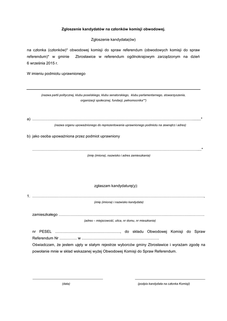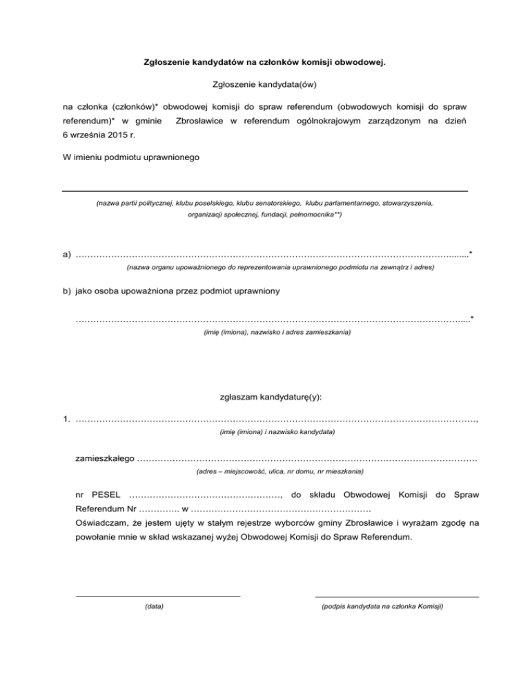 Zgłoszenie kandydatów na członków komisji obwodowej. Zgłoszenie kandydata(ów) na członka (członków)* obwodowej komisji do spraw referendum (obwodowych komisji do spraw referendum)* w gminie Zbrosławice w referendum ogólnokrajowym zarządzonym na dzień 6 września 2015 r. W imieniu podmiotu uprawnionego (nazwa partii politycznej, klubu poselskiego, klubu senatorskiego, klubu parlamentarnego, stowarzyszenia, organizacji społecznej, fundacji, pełnomocnika**) a) ………………………………………………………………………………………………………………........* (nazwa organu upoważnionego do reprezentowania uprawnionego podmiotu na zewnątrz i adres) b) jako osoba upoważniona przez podmiot uprawniony ………………………………………………………………………………………………………………….....* (imię (imiona), nazwisko i adres zamieszkania) zgłaszam kandydaturę(y): 1. ………………………………………………………………………………………………………………………, (imię (imiona) i nazwisko kandydata) zamieszkałego ……………………………………………………………………………………………………. (adres – miejscowość, ulica, nr domu, nr mieszkania) nr PESEL ……………………………………………, do składu Obwodowej Komisji do Spraw Referendum Nr ………….. w ……………………………………………………. Oświadczam, że jestem ujęty w stałym rejestrze wyborców gminy Zbrosławice i wyrażam zgodę na powołanie mnie w skład wskazanej wyżej Obwodowej Komisji do Spraw Referendum. (data) (podpis kandydata na członka Komisji) 2. ………………………………………………………………………………………………………………………, (imię (imiona) i nazwisko kandydata) zamieszkałego ……………………………………………………………………………………………………. (adres – miejscowość, ulica, nr domu, nr mieszkania) nr PESEL ……………………………………………, do składu Obwodowej Komisji do Spraw Referendum Nr ………….. w …………………………………………………….. Oświadczam, że jestem ujęty w stałym rejestrze wyborców gminy Zbrosławice i wyrażam zgodę na powołanie mnie w skład wskazanej wyżej Obwodowej Komisji do Spraw Referendum. (data) (podpis kandydata na członka Komisji) 3. ………………………………………………………………………………………………………………………, (imię (imiona) i nazwisko kandydata) zamieszkałego ……………………………………………………………………………………………………. (adres – miejscowość, ulica, nr domu, nr mieszkania) nr PESEL ……………………………………………, do składu Obwodowej Komisji do Spraw Referendum Nr ………….. w …………………………………………………….. Oświadczam, że jestem ujęty w stałym rejestrze wyborców gminy Zbrosławice i wyrażam zgodę na powołanie mnie w skład wskazanej wyżej Obwodowej Komisji do Spraw Referendum. (data) (podpis kandydata na członka Komisji) 4. ………………………………………………………………………………………………………………………, (imię (imiona) i nazwisko kandydata) zamieszkałego ……………………………………………………………………………………………………. (adres – miejscowość, ulica, nr domu, nr mieszkania) nr PESEL ……………………………………………, do składu Obwodowej Komisji do Spraw Referendum Nr ………….. w …………………………………………………….. Oświadczam, że jestem ujęty w stałym rejestrze wyborców gminy Zbrosławice i wyrażam zgodę na powołanie mnie w skład wskazanej wyżej Obwodowej Komisji do Spraw Referendum. (data) (podpis kandydata na członka Komisji) 5. ………………………………………………………………………………………………………………………, (imię (imiona) i nazwisko kandydata) zamieszkałego ……………………………………………………………………………………………………. (adres – miejscowość, ulica, nr domu, nr mieszkania) nr PESEL ……………………………………………, do składu Obwodowej Komisji do Spraw Referendum Nr ………….. w …………………………………………………….. Oświadczam, że jestem ujęty w stałym rejestrze wyborców gminy Zbrosławice i wyrażam zgodę na powołanie mnie w skład wskazanej wyżej Obwodowej Komisji do Spraw Referendum. (data) (podpis kandydata na członka Komisji) 6. ………………………………………………………………………………………………………………………, (imię (imiona) i nazwisko kandydata) zamieszkałego ……………………………………………………………………………………………………. (adres – miejscowość, ulica, nr domu, nr mieszkania) nr PESEL ……………………………………………, do składu Obwodowej Komisji do Spraw Referendum Nr ………….. w …………………………………………………….. Oświadczam, że jestem ujęty w stałym rejestrze wyborców gminy Zbrosławice i wyrażam zgodę na powołanie mnie w skład wskazanej wyżej Obwodowej Komisji do Spraw Referendum. (data) (podpis kandydata na członka Komisji) 7. ………………………………………………………………………………………………………………………, (imię (imiona) i nazwisko kandydata) zamieszkałego …………………………………………………………………………………………………