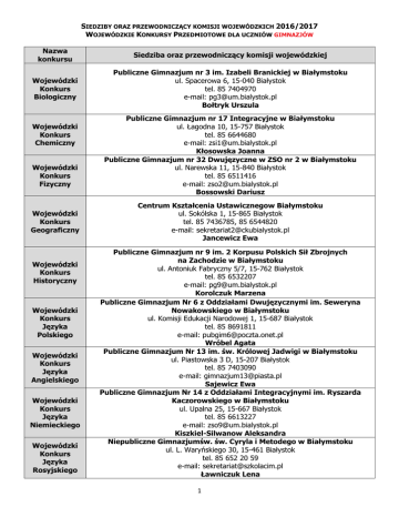 SIEDZIBY ORAZ PRZEWODNICZĄCY KOMISJI WOJEWÓDZKICH 2016/2017 WOJEWÓDZKIE KONKURSY PRZEDMIOTOWE DLA UCZNIÓW GIMNAZJÓW Nazwa konkursu Siedziba oraz przewodniczący komisji wojewódzkiej Wojewódzki Konkurs Biologiczny Publiczne Gimnazjum nr 3 im. Izabeli Branickiej w Białymstoku ul. Spacerowa 6, 15-040 Białystok tel. 85 7404970 e-mail: [email protected] Bołtryk Urszula Wojewódzki Konkurs Chemiczny Wojewódzki Konkurs Fizyczny Wojewódzki Konkurs Geograficzny Wojewódzki Konkurs Historyczny Wojewódzki Konkurs Języka Polskiego Wojewódzki Konkurs Języka Angielskiego Wojewódzki Konkurs Języka Niemieckiego Wojewódzki Konkurs Języka Rosyjskiego Publiczne Gimnazjum nr 17 Integracyjne w Białymstoku ul. Łagodna 10, 15-757 Białystok tel. 85 6644680 e-mail: [email protected] Kłosowska Joanna Publiczne Gimnazjum nr 32 Dwujęzyczne w ZSO nr 2 w Białymstoku ul. Narewska 11, 15-840 Białystok tel. 85 6511416 e-mail: [email protected] Bossowski Dariusz Centrum Kształcenia Ustawicznegow Białymstoku ul. Sokólska 1, 15-865 Białystok tel. 85 7436785, 85 6544820 e-mail: [email protected] Jancewicz Ewa Publiczne Gimnazjum nr 9 im. 2 Korpusu Polskich Sił Zbrojnych na Zachodzie w Białymstoku ul. Antoniuk Fabryczny 5/7, 15-762 Białystok tel. 85 6532207 e-mail: [email protected] Korolczuk Marzena Publiczne Gimnazjum Nr 6 z Oddziałami Dwujęzycznymi im. Seweryna Nowakowskiego w Białymstoku ul. Komisji Edukacji Narodowej 1, 15-687 Białystok tel. 85 8691811 e-mail: [email protected] Wróbel Agata Publiczne Gimnazjum Nr 13 im. św. Królowej Jadwigi w Białymstoku ul. Piastowska 3 D, 15-207 Białystok tel. 85 7403090 e-mail: [email protected] Sajewicz Ewa Publiczne Gimnazjum Nr 14 z Oddziałami Integracyjnymi im. Ryszarda Kaczorowskiego w Białymstoku ul. Upalna 25, 15-667 Białystok tel. 85 6613227 e-mail: [email protected] Kiszkiel-Silwanow Aleksandra Niepubliczne Gimnazjumśw. św. Cyryla i Metodego w Białymstoku ul. L. Waryńskiego 30, 15-461 Białystok tel. 85 652 20 59 e-mail: [email protected] Ławniczuk Lena 1 Wojewódzki Konkurs Matematyczny Publiczne Gimnazjum nr 1 im. Jana Kochanowskiego w Białymstoku ul. Jesienna 8, 15-151 Białystok tel. 856750862 e-mail: [email protected] Kaźmierska Jolanta Informacje dotyczące siedzib oraz przeprowadzania pozostałych konkursów organizowanych przez Podlaskiego Kuratora Oświaty: • Wojewódzkiego Konkursu Języka Białoruskiego, • Wojewódzkiego Konkursu Języka Francuskiego, • Wojewódzkiego Konkursu Języka Hiszpańskiego, • Wojewódzkiego Konkursu z Plastyki, • Wojewódzkiego Konkursu Informatycznego, • Ponadwojewódzkiego Konkursu Wiedzy Obywatelskiej i Ekonomicznej znajdują się na stronach internetowych wskazanych w regulaminach konkursów. 2