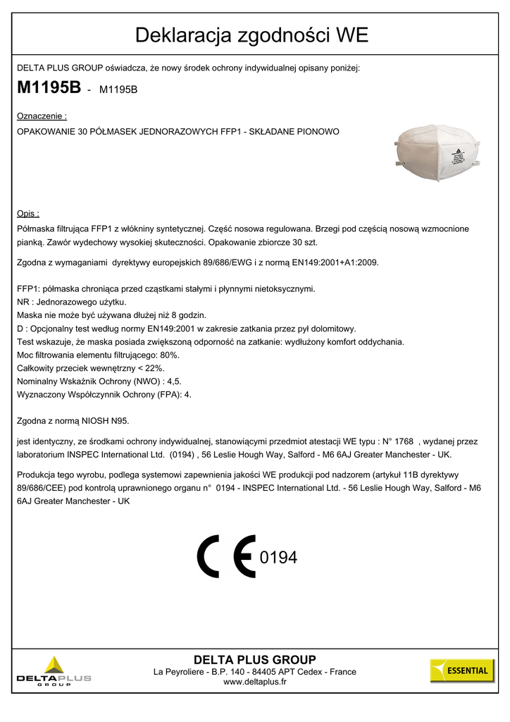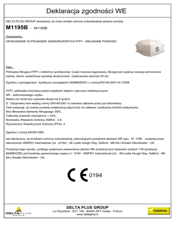 ! C - ! "# "!$ M1195B & '(()*+ $ ,-./ 01 23', 4.5-678 99( & ,3. /.- "# $ :;<# = >!? 99( ;: #>>!@ 7AB # C @ +C " A? #? < "?@ 5: #! #>@ " D 01 #>@ 5C <C< > "!# E)FGEGF- <? .(H)$I11(J($I11)@ 99($ ":;<# ? " ?#>< #>;< ";< >#<@ . $ 4C >@ '# < DB ;! E C@ $ "! >#> ;C < .(H)$I11( # > " "; <>@ #> #! <# "# A#? "B >$ ; <=> @ ' = > <> = >!?C$ E1K@ 7;> " A> L IIK@ .< -#M N.-O $ H*@ - -#":; N9O$ H@ 5C <? ./8 .)*@ !#> > < ! #>?< "<> >#>! - >" $ .P (QGE ! " D>< /.7 />> >@ N1()HO *G # 8C - = & 'G G4 > '#> & ,@ ! >C D " C ##>< " ! - "! " < N>; ((+ > E)FGEGF7O " > ? "C C P 1()H & /.7 />> >@ & *G # 8C - = & 'G G4 > '#> & , 1()H DELTA PLUS GROUP La Peyroliere - B.P. 140 - 84405 APT Cedex - France www.deltaplus.fr ! C - "? $ (1F1HFI1(H R 78 'C DELTA PLUS GROUP La Peyroliere - B.P. 140 - 84405 APT Cedex - France www.deltaplus.fr