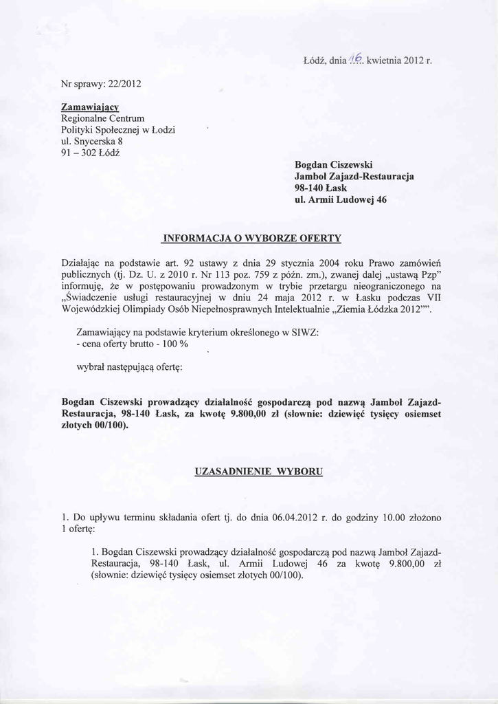 Nr sprawy:2212012 Zamawiaiacy RegionalneCentrum Polityki Spolecznejwtr odzi ul. Snycerska8 9t -302N-6d2 Bogdan Ciszewski Jambol Zajazd-Restauracj a 98-140Lask ul. Armii Ludowej 46 INFORMACJA O WYBORZE OFERTY DzialajEc na podstawie art. 92 ustawy z drtia 29 stycznia 2004 roku Prawo zam6wieri publicznych (tj. Dz. U. z 2010 r. Nr 113 poz. 759 z p62n. zm.), zwartejdalej ,,ustaw4Pzp" iqformujg, 2e w postgpowaniu prowadzonym w trybie przetargu nieograniczonego na ,,Swiadczenie uslugi restauracyjnej w dniu 24 maja 2012 r. w tr asku podczas VII Wojew6dzkiej Olimpiady Os6bNiepelnosprawnychIntelektualnie,,Ziemial,6dzka20l2"". ZamawiajEcyna podstawie kryterium okreSlonegow SIWZ: - cena oferty brutto - I00 % wybral nastEpuj4c4 ofertg: Bogdan Ciszewskiprowadz4cydzialalnoSdgospodarcz4pod nazwq Jambol ZajazdRestauracja,98-140 tr ask, za lrwotg 9.800,00zl (slownie: dziewig6tysigcy osiemset zlotych00/100). UZASADNIENIE WYBORU 1. Do uplywu terminu skladania ofert tj. do dnia 06.04.2012 r. do godziny 10.00 zNolono 1 ofertg: 1. Bogdan Ciszewski prowadzqcy dzialalnoS6gospodarczqpodnazwq Jambol ZajazdRestauracja, 98-140 tr ask, ul. Armii Ludowej 46 za kwotg 9.800,00 zl (slownie: dziewig6tysigcy osiemsetzNotych00/100). Nr ofertv I Nazwa wykonawcy (imie i nazwisko Wykonawcy) BogdanCiszewski Jambol Zaj azd-Restauracja cena 9.800,00 zl Kryterium: cena Miejsce pkt. 100,00 I 98-140 trask ul. Armii Ludowei46 Oferta rr I zlolonaprzezBogdan Ciszewski prowadzEcydzialalnoS6gospodarcz4podnazwq Jambol Zajazd-Restauracja,93-140tr-ask,ul. Armii Ludowej 46 jest jedyn4 ofert4 zlolon4w postgpowaniu, kt6ra spelniala warunki SIWZ i zgodna byla z ustaw4 Pzp. Cena oferty mieSci sig w kwocie, jakq Zamawiajqcy mohe przeznaczyt na sfinansowanie zam6wienia. W ocenie dokonanej na podstawie kryterium okreSlonego w SIWZ oferta uzyskala 100 punkt6w. 3. Zgodnie z art. 94 ust. 2 pkt. la) ustawy Pzp zawarcie umowy na rcalizacjg zam6wienia moZe nast4pi6przeduplywem terminu okreSlonegow art. 94 ust. I pkt.2 ustawy Pzp.