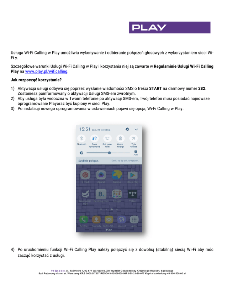Usługa Wi-Fi Calling w Play umożliwia wykonywanie i odbieranie połączeń głosowych z wykorzystaniem sieci WiFi y. Szczegółowe warunki Usługi Wi-Fi Calling w Play i korzystania niej są zawarte w Regulaminie Usługi Wi-Fi Calling Play na www.play.pl/wificalling. Jak rozpocząć korzystanie? 1) Aktywacja usługi odbywa się poprzez wysłanie wiadomości SMS o treści START na darmowy numer 282. Zostaniesz poinformowany o aktywacji Usługi SMS-em zwrotnym. 2) Aby usługa była widoczna w Twoim telefonie po aktywacji SMS-em, Twój telefon musi posiadać najnowsze oprogramowanie Playoraz być kupiony w sieci Play. 3) Po instalacji nowego oprogramowania w ustawieniach pojawi się opcja, Wi-Fi Calling w Play: 4) Po uruchomieniu funkcji Wi-Fi Calling Play należy połączyć się z dowolną (stabilną) siecią Wi-Fi aby móc zacząć korzystać z usługi. P4 Sp. z o.o. ul. Taśmowa 7, 02-677 Warszawa, XIII Wydział Gospodarczy Krajowego Rejestru Sądowego Sąd Rejonowy dla m. st. Warszawy KRS 0000217207 REGON 015808609 NIP 951-21-20-077 Kapitał zakładowy 48 856 500,00 zł 5) Po pozytywnym przejściu kroków 1-4 w telefonie powinna pojawić się ikona informująca o tym, że od tej pory można wykonywać i odbierać połączenia korzystając z usługi Wi-Fi Calling w Play. 6) Aby wykonać połączenie należy przejść do ekranu wybierania numeru, wpisać numer telefonu oraz nacisnąć ikonę zielonej słuchawki. P4 Sp. z o.o. ul. Taśmowa 7, 02-677 Warszawa, XIII Wydział Gospodarczy Krajowego Rejestru Sądowego Sąd Rejonowy dla m. st. Warszawy KRS 0000217207 REGON 015808609 NIP 951-21-20-077 Kapitał zakładowy 48 856 500,00 zł 7) Aby odebrać połączenie należy nacisnąć przycisk P4 Sp. z o.o. ul. Taśmowa 7, 02-677 Warszawa, XIII Wydział Gospodarczy Krajowego Rejestru Sądowego Sąd Rejonowy dla m. st. Warszawy KRS 0000217207 REGON 015808609 NIP 951-21-20-077 Kapitał zakładowy 48 856 500,00 zł 8) Aby zakończyć połączenie należy nacisnąć czerwoną słuchawkę P4 Sp. z o.o. ul. Taśmowa 7, 02-677 Warszawa, XIII Wydział Gospodarczy Krajowego Rejestru Sądowego Sąd Rejonowy dla m. st. Warszawy KRS 0000217207 REGON 015808609 NIP 951-21-20-077 Kapitał zakładowy 48 856 500,00 zł 9) Historia połączeń przez sieć komórkową jak i Wi-Fi Calling w Play znajduje się standardowo na ekranie Historia Połączeń. Połączenia wykonane przez Wi-Fi Calling w Play zaznaczone są ikoną: P4 Sp. z o.o. ul. Taśmowa 7, 02-677 Warszawa, XIII Wydział Gospodarczy Krajowego Rejestru Sądowego Sąd Rejonowy dla m. st. Warszawy KRS 0000217207 REGON 015808609 NIP 951-21-20-077 Kapitał zakładowy 48 856 500,00 zł 10) Połączenie telefonu z siecią Wi-Fi oraz aktualny status usługi Wi-Fi Calling w Play możesz sprawdzić na pasku powiadomień systemu Android. P4 Sp. z o.o. ul. Taśmowa 7, 02-677 Warszawa, XIII Wydział Gospodarczy Krajowego Rejestru Sądowego Sąd Rejonowy dla m. st. Warszawy KRS 0000217207 REGON 015808609 NIP 951-21-20-077 Kapitał zakładowy 48 856 500,00 zł 11) W ramach aktywnego Wi-Fi Calling w Play możesz wysyłać i odbierać SMS-y. MMS-y będą wysyłane i odbierane standardowym połączeniem z siecią komórkową Play. P4 Sp. z o.o. ul. Taśmowa 7, 02-677 Warszawa, XIII Wydział Gospodarczy Krajowego Rejestru Sądowego Sąd Rejonowy dla m. st. Warszawy KRS 0000217207 REGON 015808609 NIP 951-21-20-077 Kapitał zakładowy 48 856 500,00 zł