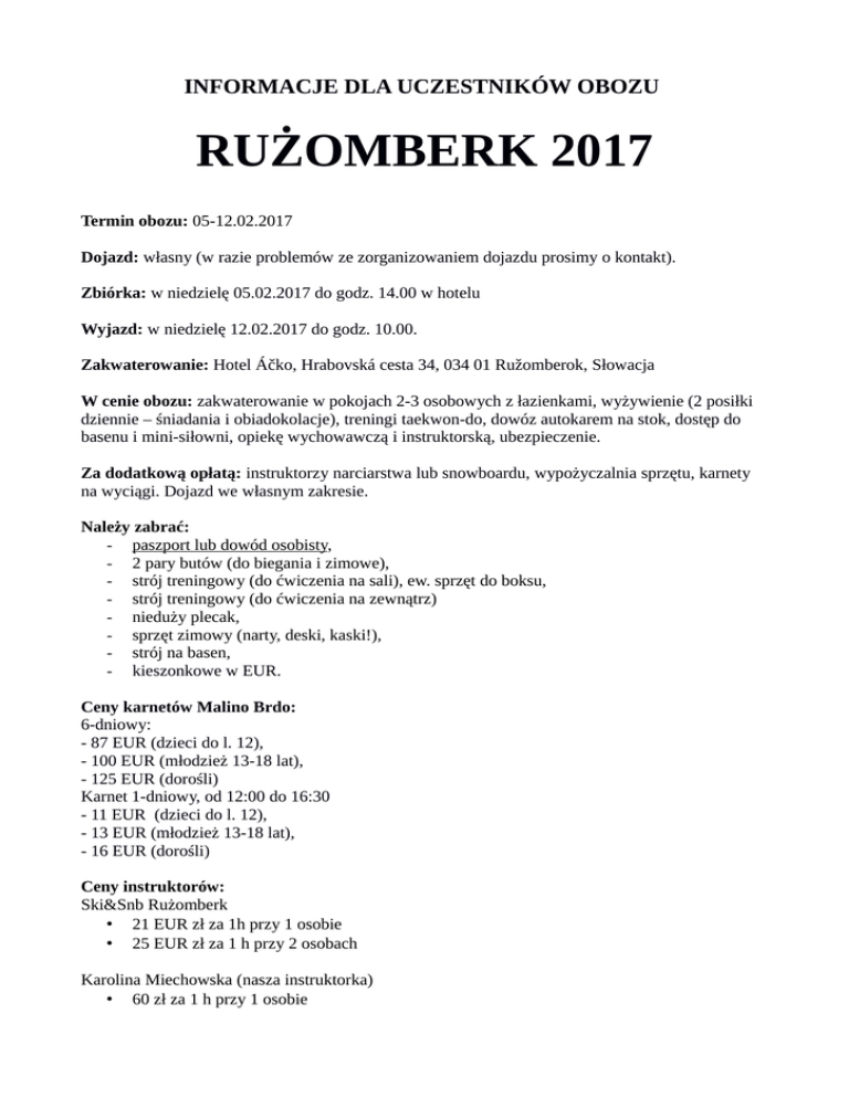 INFORMACJE DLA UCZESTNIKÓW OBOZU RUŻOMBERK 2017 Termin obozu: 05-12.02.2017 Dojazd: własny (w razie problemów ze zorganizowaniem dojazdu prosimy o kontakt). Zbiórka: w niedzielę 05.02.2017 do godz. 14.00 w hotelu Wyjazd: w niedzielę 12.02.2017 do godz. 10.00. Zakwaterowanie: Hotel Áčko, Hrabovská cesta 34, 034 01 Ružomberok, Słowacja W cenie obozu: zakwaterowanie w pokojach 2-3 osobowych z łazienkami, wyżywienie (2 posiłki dziennie – śniadania i obiadokolacje), treningi taekwon-do, dowóz autokarem na stok, dostęp do basenu i mini-siłowni, opiekę wychowawczą i instruktorską, ubezpieczenie. Za dodatkową opłatą: instruktorzy narciarstwa lub snowboardu, wypożyczalnia sprzętu, karnety na wyciągi. Dojazd we własnym zakresie. Należy zabrać: - paszport lub dowód osobisty, - 2 pary butów (do biegania i zimowe), - strój treningowy (do ćwiczenia na sali), ew. sprzęt do boksu, - strój treningowy (do ćwiczenia na zewnątrz) - nieduży plecak, - sprzęt zimowy (narty, deski, kaski!), - strój na basen, - kieszonkowe w EUR. Ceny karnetów Malino Brdo: 6-dniowy: - 87 EUR (dzieci do l. 12), - 100 EUR (młodzież 13-18 lat), - 125 EUR (dorośli) Karnet 1-dniowy, od 12:00 do 16:30 - 11 EUR (dzieci do l. 12), - 13 EUR (młodzież 13-18 lat), - 16 EUR (dorośli) Ceny instruktorów: Ski&Snb Rużomberk • 21 EUR zł za 1h przy 1 osobie • 25 EUR zł za 1 h przy 2 osobach Karolina Miechowska (nasza instruktorka) • 60 zł za 1 h przy 1 osobie • • 80 zł za 1 h przy 2 osobach 25 zł za 1 h przy zajęciach grupowych Wypożyczenie sprzętu • komplet narty lub snowboard dziecięcy 9 EUR/1 dzień, 44 EUR/6 dni • komplet narty lub snowboard dorosły 14 EUR/1 dzień, 69 EUR/6 dni. Sugerujemy zabranie własnego sprzętu bądź wypożyczenie go w Krakowie. Ubezpieczenie: Wszyscy uczestnicy zostali ubezpieczeni w firmie Concordia Polska TUW - od kosztów leczenia zagranicą na sumę 50 000 zł, - od następstw nieszczęśliwych wypadków na sumę 10 000 zł, - od odpowiedzialności cywilnej na sumę 100 000 zł. Ponadto rekomendujemy zabranie ze sobą Europejskiej Kary Ubezpieczenia Zdrowotnego, wydawanej bezpłatnie przez NFZ (oddział w Krakowie przy ul. Batorego 4). Kieszonkowe: • na stoku będziemy przebywać przez ok. 5 godzin – koszt posiłków w restauracjach to 6-11 EUR, można też wyposażyć się w kanapki, więc 5 EUR dziennie zupełnie wystarczy • na karnety, wypożyczanie nart, instruktorów wg własnego uznania • kieszonkowe proszę dać wychowawcom w drobnych banknotach w podpisanej kopercie. Opieka wychowawcza i instruktorska: - Mikołaj Kotowicz (kierownik, instruktor taekwon-do) tel. +48 502 067 081 - Aleksandra Raźny (wychowawca, instruktor taekwon-do) tel. +48 570 869 567 Obóz zarejestrowany w bazie wypoczynku MEN pod nr 7642/MAL/2017 .