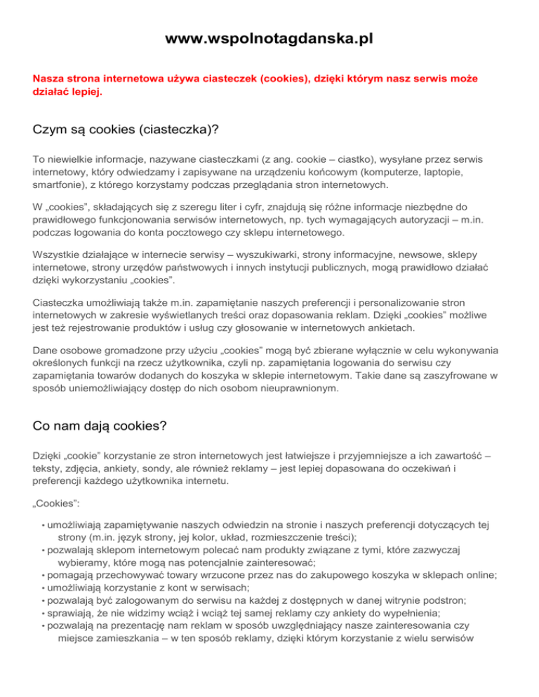 www.wspolnotagdanska.pl Nasza strona internetowa używa ciasteczek (cookies), dzięki którym nasz serwis może działać lepiej. Czym są cookies (ciasteczka)? To niewielkie informacje, nazywane ciasteczkami (z ang. cookie – ciastko), wysyłane przez serwis internetowy, który odwiedzamy i zapisywane na urządzeniu końcowym (komputerze, laptopie, smartfonie), z którego korzystamy podczas przeglądania stron internetowych. W „cookies”, składających się z szeregu liter i cyfr, znajdują się różne informacje niezbędne do prawidłowego funkcjonowania serwisów internetowych, np. tych wymagających autoryzacji – m.in. podczas logowania do konta pocztowego czy sklepu internetowego. Wszystkie działające w internecie serwisy – wyszukiwarki, strony informacyjne, newsowe, sklepy internetowe, strony urzędów państwowych i innych instytucji publicznych, mogą prawidłowo działać dzięki wykorzystaniu „cookies”. Ciasteczka umożliwiają także m.in. zapamiętanie naszych preferencji i personalizowanie stron internetowych w zakresie wyświetlanych treści oraz dopasowania reklam. Dzięki „cookies” możliwe jest też rejestrowanie produktów i usług czy głosowanie w internetowych ankietach. Dane osobowe gromadzone przy użyciu „cookies” mogą być zbierane wyłącznie w celu wykonywania określonych funkcji na rzecz użytkownika, czyli np. zapamiętania logowania do serwisu czy zapamiętania towarów dodanych do koszyka w sklepie internetowym. Takie dane są zaszyfrowane w sposób uniemożliwiający dostęp do nich osobom nieuprawnionym. Co nam dają cookies? Dzięki „cookie” korzystanie ze stron internetowych jest łatwiejsze i przyjemniejsze a ich zawartość – teksty, zdjęcia, ankiety, sondy, ale również reklamy – jest lepiej dopasowana do oczekiwań i preferencji każdego użytkownika internetu. „Cookies”: • umożliwiają zapamiętywanie naszych odwiedzin na stronie i naszych preferencji dotyczących tej strony (m.in. język strony, jej kolor, układ, rozmieszczenie treści); • pozwalają sklepom internetowym polecać nam produkty związane z tymi, które zazwyczaj wybieramy, które mogą nas potencjalnie zainteresować; • pomagają przechowywać towary wrzucone przez nas do zakupowego koszyka w sklepach online; • umożliwiają korzystanie z kont w serwisach; • pozwalają być zalogowanym do serwisu na każdej z dostępnych w danej witrynie podstron; • sprawiają, że nie widzimy wciąż i wciąż tej samej reklamy czy ankiety do wypełnienia; • pozwalają na prezentację nam reklam w sposób uwzględniający nasze zainteresowania czy miejsce zamieszkania – w ten sposób reklamy, dzięki którym korzystanie z wielu serwisów internetowych może być bezpłatne, mogą informować nas o potencjalnie interesujących nas produktach i usługach; • pozwalają tworzyć anonimowe statystyki odwiedzalności serwisów. Dzięki „cookies” właściciele i wydawcy serwisów internetowych są w stanie ocenić realne zainteresowanie swoimi serwisami, mogą lepiej poznać oczekiwania i preferencje użytkowników, zrozumieć sposób w jaki użytkownicy korzystają z ich serwisów oraz, korzystając z najnowszych rozwiązań technologicznych, mogą stale udoskonalać swoje serwisy internetowe czyniąc je jeszcze przyjaźniejszymi i lepiej dostosowanymi do naszych potrzeb. Co powinniśmy wiedzieć o „cookies”? Nie służą identyfikacji użytkowników i na ich podstawie w żaden sposób nie jest ustalana czyjakolwiek tożsamość; • „cookies” identyfikują dane komputera i przeglądarki używanych do przeglądania stron internetowych – pozwalają np. dowiedzieć się czy dany komputer już odwiedzał stronę; • dane pozyskane z „cookies” nie są w żaden sposób łączone z danymi osobowymi użytkowników pozyskanymi np. podczas rejestracji w serwisach; • nie są szkodliwe ani dla nas ani dla naszych komputerów, czy smartfonów – nie wpływają na sposób ich działania; • nie powodują zmian konfiguracyjnych w urządzeniach końcowych, ani w oprogramowaniu zainstalowanym na tych urządzeniach; • domyślne parametry „ciasteczek” pozwalają na odczytanie informacji w nich zawartych jedynie serwerowi, który je utworzył; • na podstawie naszych zachowań na odwiedzanych stronach internetowych przekazują do serwerów informacje, dzięki którym wyświetlana strona jest lepiej dopasowana do indywidualnych preferencji. Podstawowe rodzaje ciasteczek „Cookies” sesyjne – są to tymczasowe informacje przechowywane w pamięci przeglądarki do momentu zakończenia sesji przeglądarki, czyli do momentu jej zamknięcia. Te cookies są obowiązkowe, aby niektóre aplikacje lub funkcjonalności działały poprawnie. „Cookies” stałe – dzięki nim korzystanie z często odwiedzanych stron jest łatwiejsze (np. zapewniają optymalną nawigację, zapamiętują wybraną rozdzielczość, układ treści etc.). Te informacje pozostają pamięci przeglądarki przez dłuższy okres. Czas ten zależy od wyboru, którego można dokonać w ustawieniach przeglądarki. Ten rodzaj cookies zezwala na przekazywanie informacji na serwer za każdym razem, gdy odwiedzana jest dana strona. Stałe cookies są również nazywane jako tzw. śledzące „cookie” (ang. tracking cookies). „Cookies” podmiotów zewnętrznych – (ang. third parties cookies) – to informacje pochodzące np. z serwerów reklamowych, serwerów firm i dostawców usług (np. wyszukiwania albo map umieszczanych na stronie) współpracujących z właścicielem danej strony internetowej. Ten rodzaj cookie pozwala dostosowywać reklamy – dzięki którym korzystanie ze stron internetowych może być bezpłatne – do preferencji i zwyczajów ich użytkowników. Pozwalają również ocenić skuteczność działań reklamowych (np. dzięki zliczaniu, ile osób kliknęło w daną reklamę i przeszło na stronę internetową reklamodawcy). Na podstawie informacji