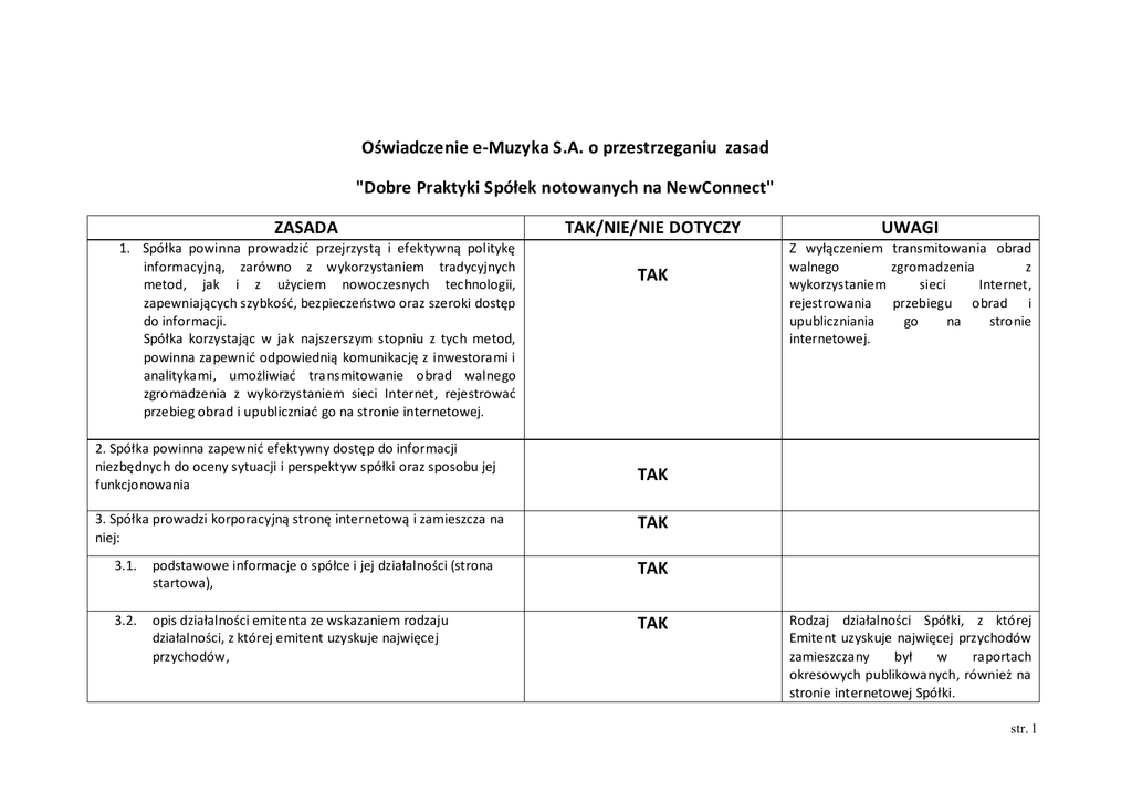 Oświadczenie e-Muzyka S.A. o przestrzeganiu zasad "Dobre Praktyki Spółek notowanych na NewConnect" ZASADA 1. Spółka powinna prowadzić przejrzystą i efektywną politykę informacyjną, zarówno z wykorzystaniem tradycyjnych metod, jak i z użyciem nowoczesnych technologii, zapewniających szybkość, bezpieczeństwo oraz szeroki dostęp do informacji. Spółka korzystając w jak najszerszym stopniu z tych metod, powinna zapewnić odpowiednią komunikację z inwestorami i analitykami, umożliwiać transmitowanie obrad walnego zgromadzenia z wykorzystaniem sieci Internet, rejestrować przebieg obrad i upubliczniać go na stronie internetowej. 2. Spółka powinna zapewnić efektywny dostęp do informacji niezbędnych do oceny sytuacji i perspektyw spółki oraz sposobu jej funkcjonowania 3. Spółka prowadzi korporacyjną stronę internetową i zamieszcza na niej: TAK/NIE/NIE DOTYCZY TAK UWAGI Z wyłączeniem transmitowania obrad walnego zgromadzenia z wykorzystaniem sieci Internet, rejestrowania przebiegu obrad i upubliczniania go na stronie internetowej. TAK TAK 3.1. podstawowe informacje o spółce i jej działalności (strona startowa), TAK 3.2. opis działalności emitenta ze wskazaniem rodzaju działalności, z której emitent uzyskuje najwięcej przychodów, TAK Rodzaj działalności Spółki, z której Emitent uzyskuje najwięcej przychodów zamieszczany był w raportach okresowych publikowanych, również na stronie internetowej Spółki. str. 1 3.3. opis rynku, na którym działa emitent, wraz z określeniem pozycji emitenta na tym rynku, TAK 3.4. życiorysy zawodowe członków organów spółki, TAK 3.5. TAK 3.6. powzięte przez zarząd, na podstawie oświadczenia członka rady nadzorczej, informacje o powiązaniach członka rady nadzorczej z akcjonariuszem dysponującym akcjami reprezentującymi nie mniej niż 5% ogólnej liczby głosów na walnym zgromadzeniu spółki, dokumenty korporacyjne spółki, 3.7. zarys planów strategicznych spółki, TAK 3.8. opublikowane prognozy wyników finansowych na bieżący rok obrotowy, wraz z założeniami do tych prognoz (w przypadku gdy emitent takie publikuje), strukturę akcjonariatu emitenta, ze wskazaniem głównych akcjonariuszy oraz akcji znajdujących się w wolnym obrocie, NIE 3.9. 3.10. dane oraz kontakt do osoby, która jest odpowiedzialna w spółce za relacje inwestorskie oraz kontakty z mediami, Opis rynku, na którym działa Emitent zamieszczany był w raportach bieżących i okresowych publikowanych, również na stronie internetowej Spółki. TAK TAK TAK 3.11. (skreślony) 3.12. opublikowane raporty bieżące i okresowe, TAK 3.13. kalendarz zaplanowanych dat publikacji finansowych raportów okresowych, dat walnych zgromadzeń, a także spotkań z inwestorami i analitykami oraz konferencji prasowych, TAK str. 2 3.14. informacje na temat zdarzeń korporacyjnych, takich jak wypłata dywidendy, oraz innych zdarzeń skutkujących nabyciem lub ograniczeniem praw po stronie akcjonariusza, z uwzględnieniem terminów oraz zasad przeprowadzania tych operacji. Informacje te powinny być zamieszczane w terminie umożliwiającym podjęcie przez inwestorów decyzji inwestycyjnych, 3.15. (skreślony) TAK 3.16. pytania akcjonariuszy dotyczące spraw objętych porządkiem obrad, zadawane przed i w trakcie walnego zgromadzenia, wraz z odpowiedziami na zadawane pytania, 3.17. informację na temat powodów odwołania walnego zgromadzenia, zmiany terminu lub porządku obrad wraz z uzasadnieniem, 3.18. informację o przerwie w obradach walnego zgromadzenia i powodach zarządzenia przerwy, NIE DOTYCZY 3.19. informacje na temat podmiotu, z którym spółka podpisała umowę o świadczenie usług Autoryzowanego Doradcy ze wskazaniem nazwy, adresu strony internetowej, numerów telefonicznych oraz adresu poczty elektronicznej Doradcy, 3.20. Informację na temat podmiotu, który pełni funkcję animatora akcji emitenta, NIE DOTYCZY 3.21. dokument informacyjny (prospekt emisyjny) spółki, opublikowany w ciągu ostatnich 12 miesięcy, NIE DOTYCZY NIE DOTYCZY NIE DOTYCZY TAK 3.22. (skreślony) str. 3 4. Spółka prowadzi korporacyjną stronę internetową, według wyboru emitenta, w języku polskim lub angielskim. Raporty bieżące i okresowe powinny być zamieszczane na stronie internetowej co najmniej w tym samym języku, w którym następuje ich publikacja zgodnie z przepisami obowiązującymi emitenta Informacje zawarte na stronie internetowej powinny być zamieszczane w sposób umożliwiający łatwy dostęp do tych informacji. Emitent powinien dokonywać aktualizacji informacji umieszczanych na stronie internetowej. W przypadku pojawienia się nowych, istotnych informacji lub wystąpienia istotnej zmiany informacji umieszczanych na stronie internetowej, aktualizacja powinna zostać przeprowadzona niezwłocznie. TAK 5. Spółka powinna prowadzić politykę informacyjną ze szczególnym uwzględnieniem potrzeb inwestorów indywidualnych. W tym celu Spółka, poza swoją stroną korporacyjną powinna wykorzystywać indywidualną dla danej spółki sekcję relacji inwestorskich znajdującą na stronie www.GPWInfoStrefa.pl. TAK 6. Emitent powinien utrzymywać bieżące kontakty z przedstawicielami Autoryzowanego Doradcy, celem umożliwienia mu prawidłowego wykonywania swoich obowiązków wobec emitenta. Spółka powinna wyznaczyć osobę odpowiedzialną za kontakty z Autoryzowanym Doradcą NIE DOTYCZY 7. W przypadku, gdy w spółce nastąpi zdarzenie, które w ocenie emitenta ma istotne znaczenie dla wykonywania przez Autoryzowanego Doradcę swoich obowiązków, emitent niezwłocznie powiadamia o tym fakcie Autoryzowanego Doradcę. NIE DOTYCZY 8. Emitent powinien zapewnić Autoryzowanemu Doradcy dostęp do wszelkich dokumentów i informacji niezbędnych do wykonywania obowiązków Autoryzowanego Doradcy. NIE DOTYCZY str. 4 9. Emitent przekazuje w raporcie rocznym: 9.1. informację na temat łącznej wysokości wynagrodzeń wszystkich członków